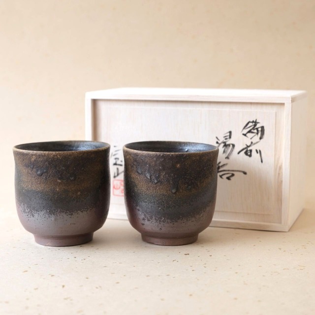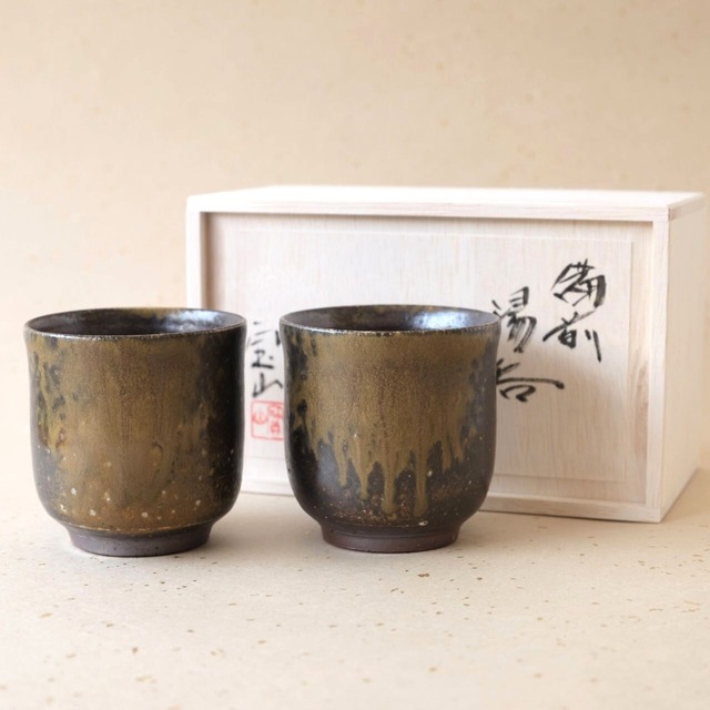 標準サイズの湯呑セットです。お茶だけでなく、さまざまな飲み物のうつわとしても使っていただけます。燃料の松割木の灰が付着した部分が黄土色に変化し、景色となっています。 〈左〉 サイズ:縦 80mm 横 80mm 高さ 80mm 重 量:159g 容 量:220ml 〈右〉 サイズ:縦 82mm 横 82mm 高さ 80mm 重 量:156g 容 量:220ml 仕 様:木箱、しおり 焼 色:胡麻(ごま)