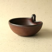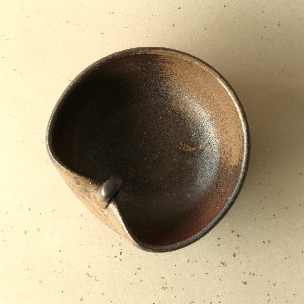 片側を押さえ、つまみを付けた小鉢です。サラダや煮物などを盛るうつわとして使っていただけます。燃料の松割木の灰が降りかかった部分には胡麻(ごま)という変化がうかがえます。