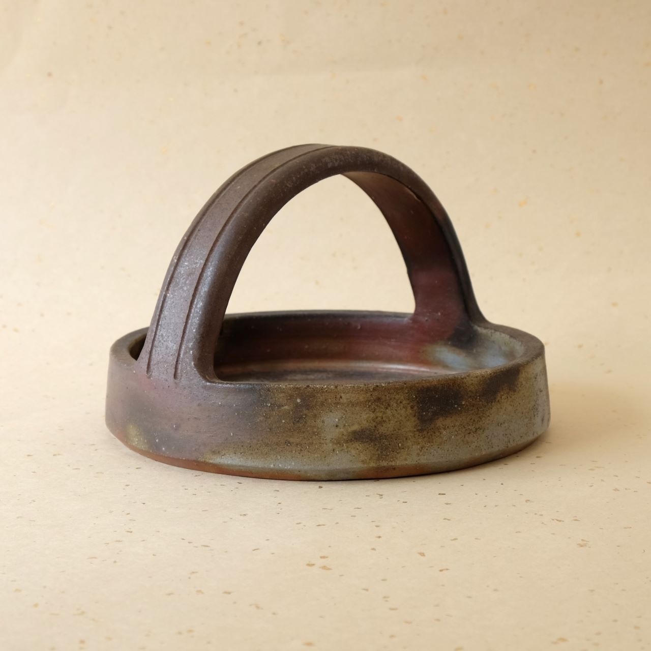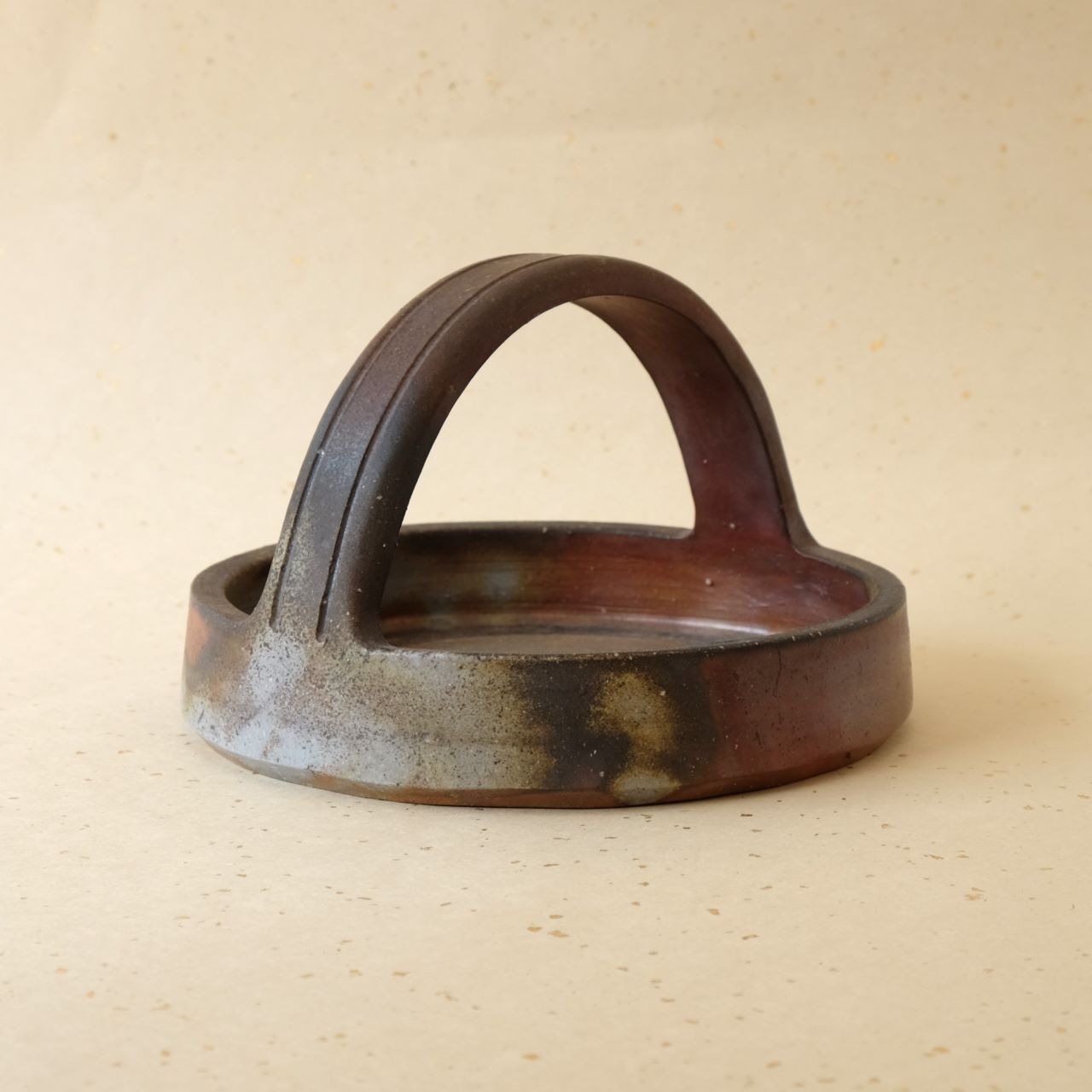 平らな鉢に手をつけたデザインの鉢です。菓子器などのうつわとして使っていただけます。木炭の影響による変化(桟切)に、中央の抜け部分(牡丹餅)がアクセントになっています。
