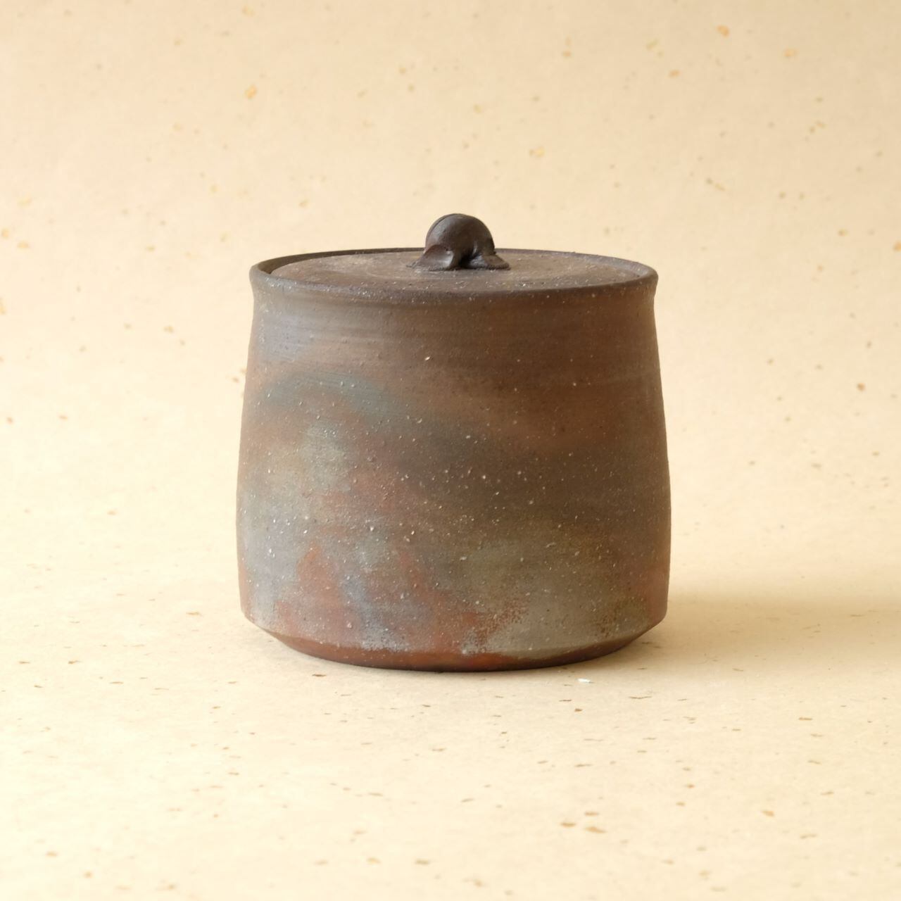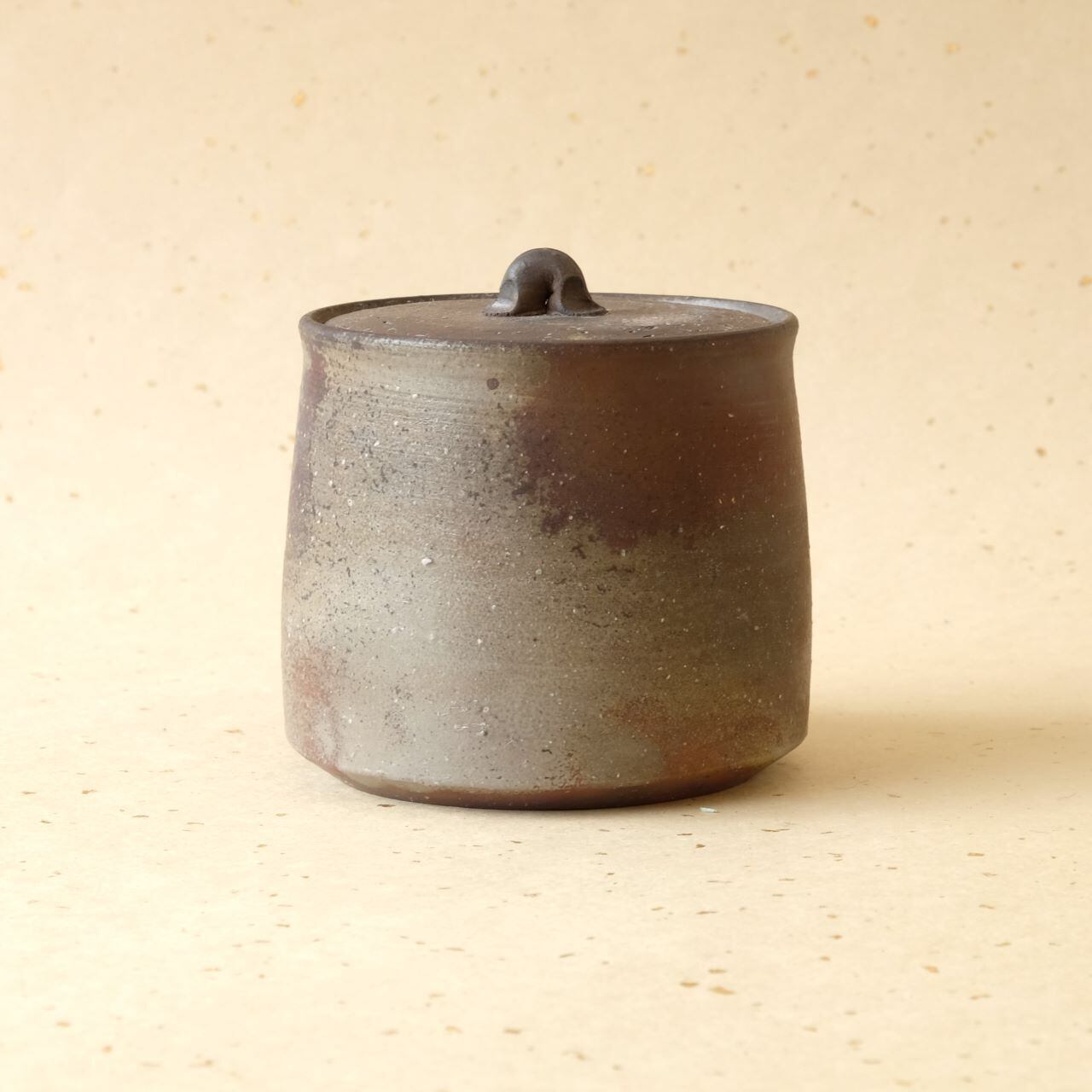 つまみのあるフタ付きのうつわです。漬物を入れたり、小物を入れたりとさまざまな用途で使っていただけます。木炭のガスの作用により、青味がかった色合いが出ています。