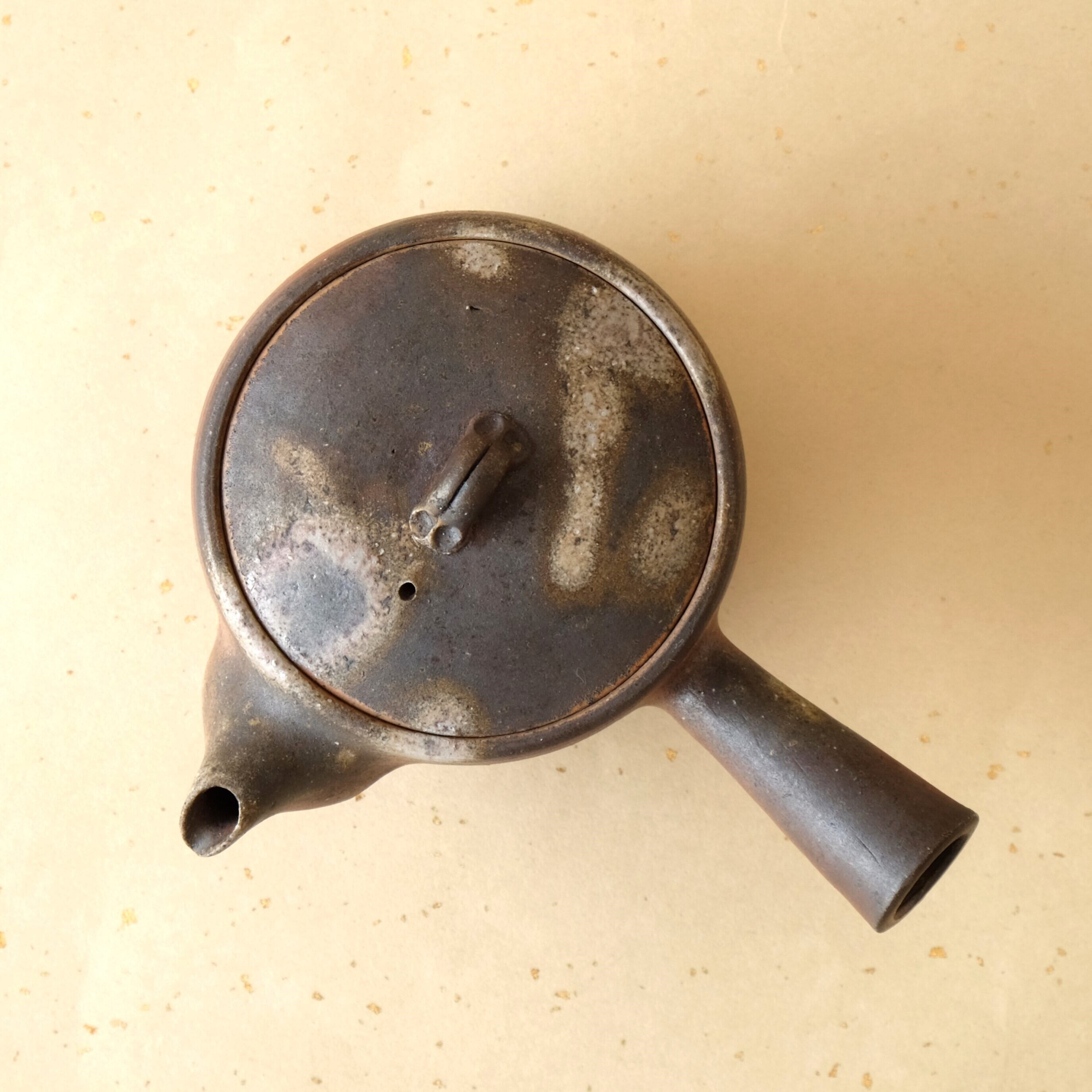 正面から見て横側に取っ手を付けた急須です。おいしいお茶を淹れることができると言われています。木炭のガスの作用により、うつわ全体に青味がかった色合いが出ています。