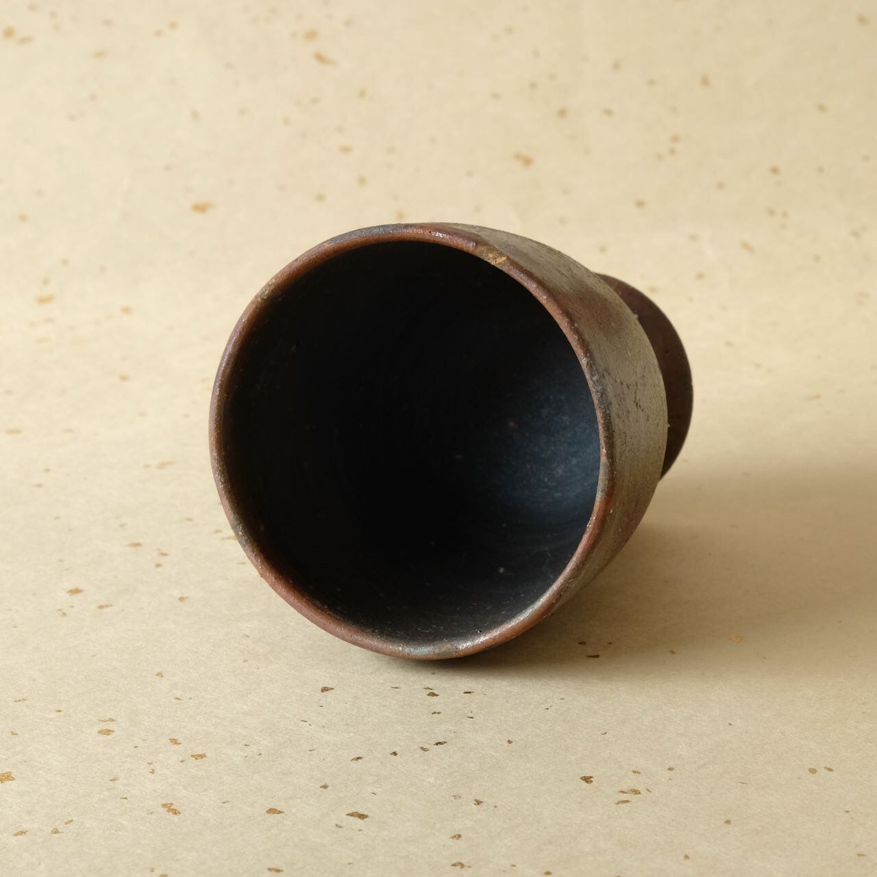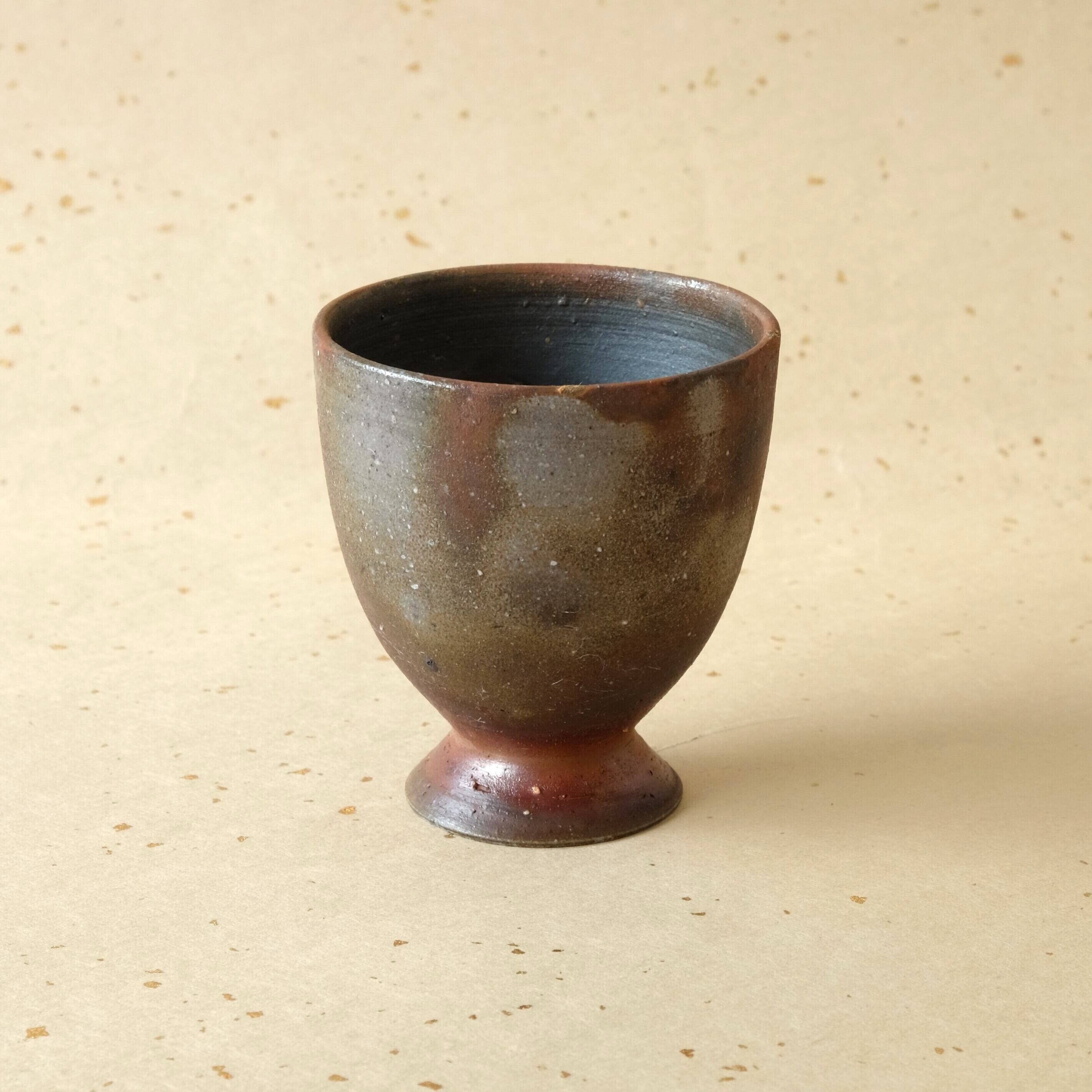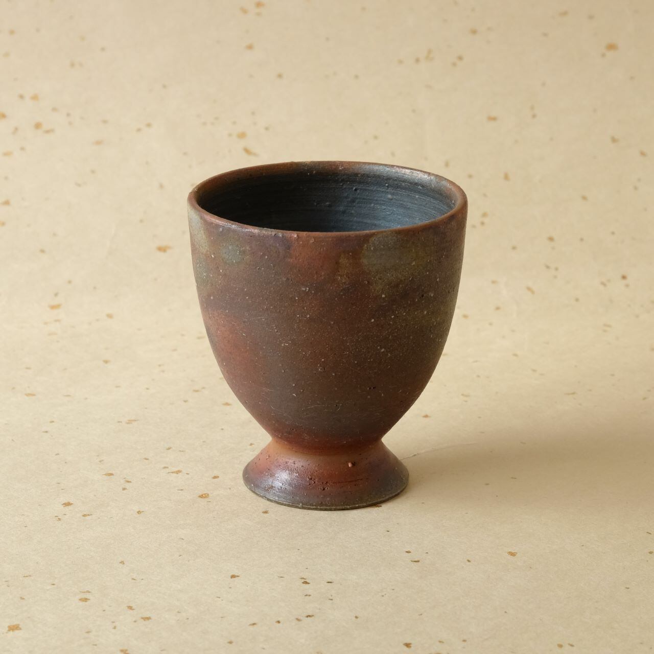 高台を高く削り出したお酒のうつわです。日本酒やワインなどに使っていただけます。うつわの側面には、木炭のガスの作用により、さまざまな景色が現れています。
