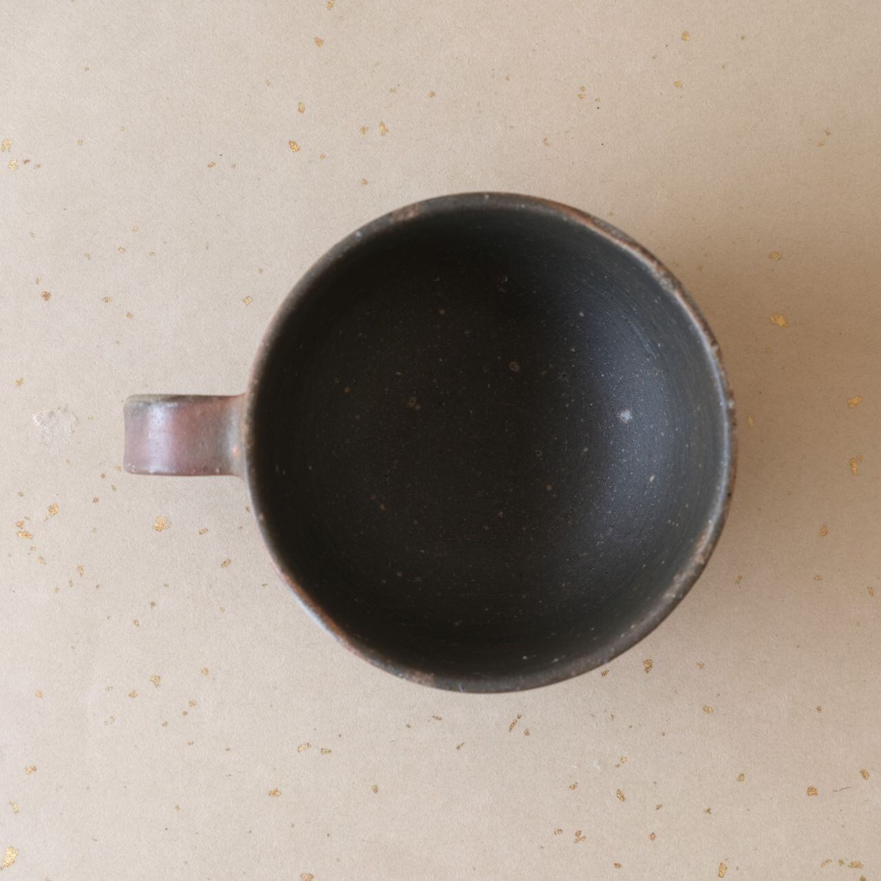 丸形のコーヒーカップです。コーヒーの苦味を和らげてくれると言われています。うつわの側面には、木炭のガスの作用により、さまざまな景色が現れています。