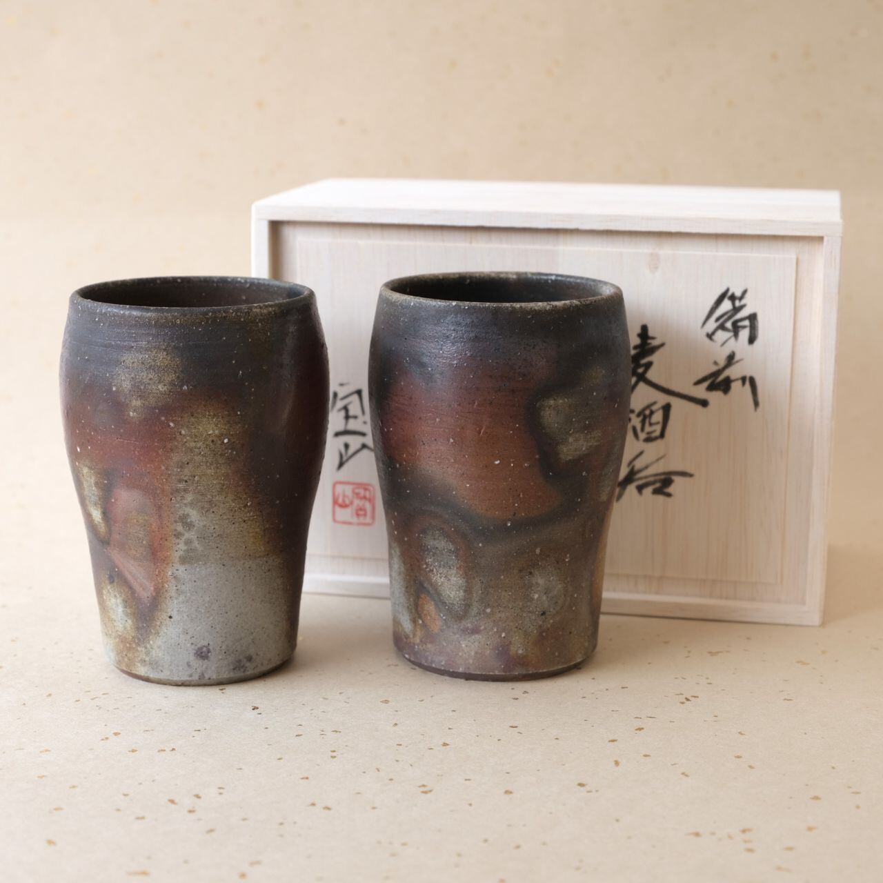 丸みおびたデザインのビアマグセットです。ビールが美味しくいただけると言われています。木炭のガスの作用により変化が生まれ、独特のグラデーションとなっています。