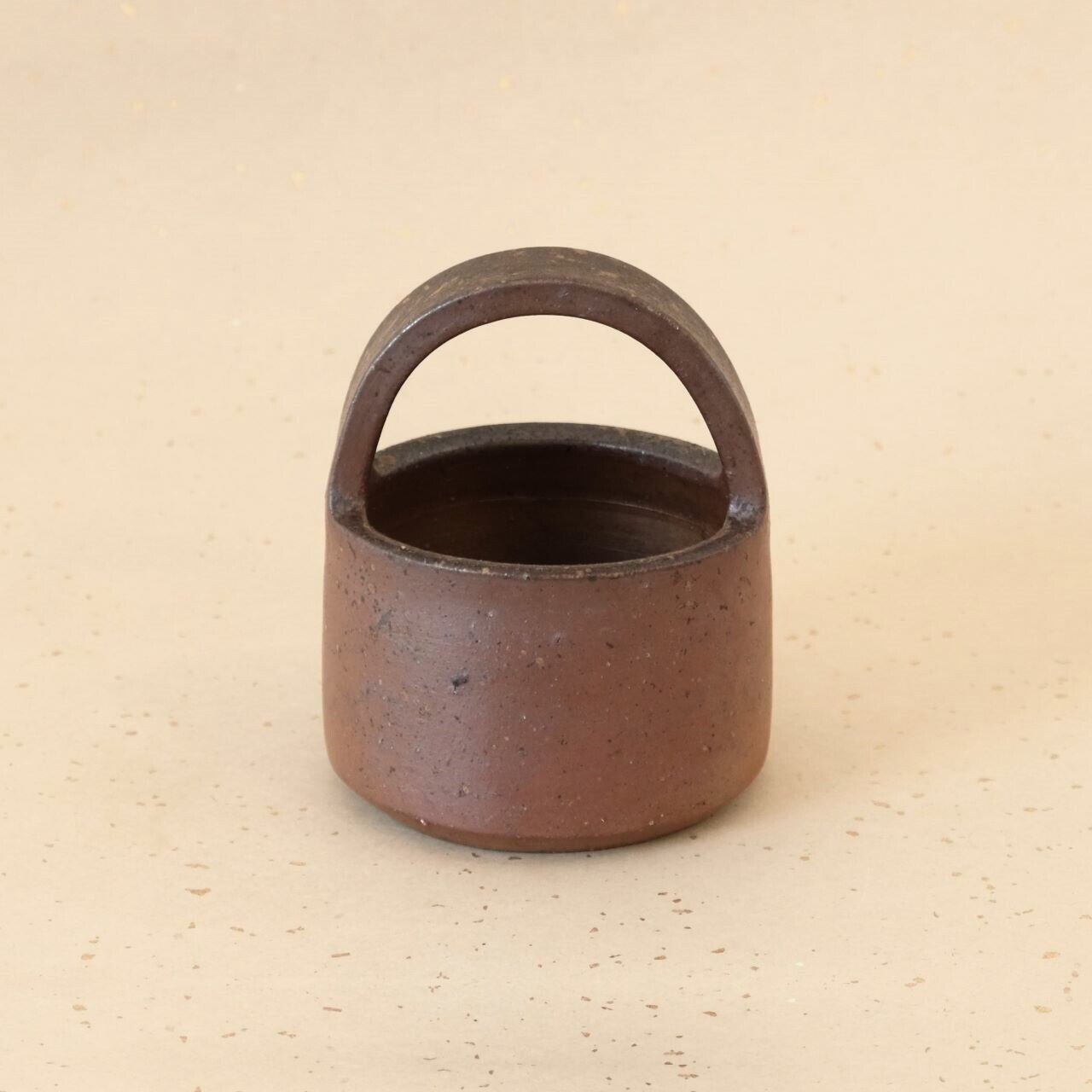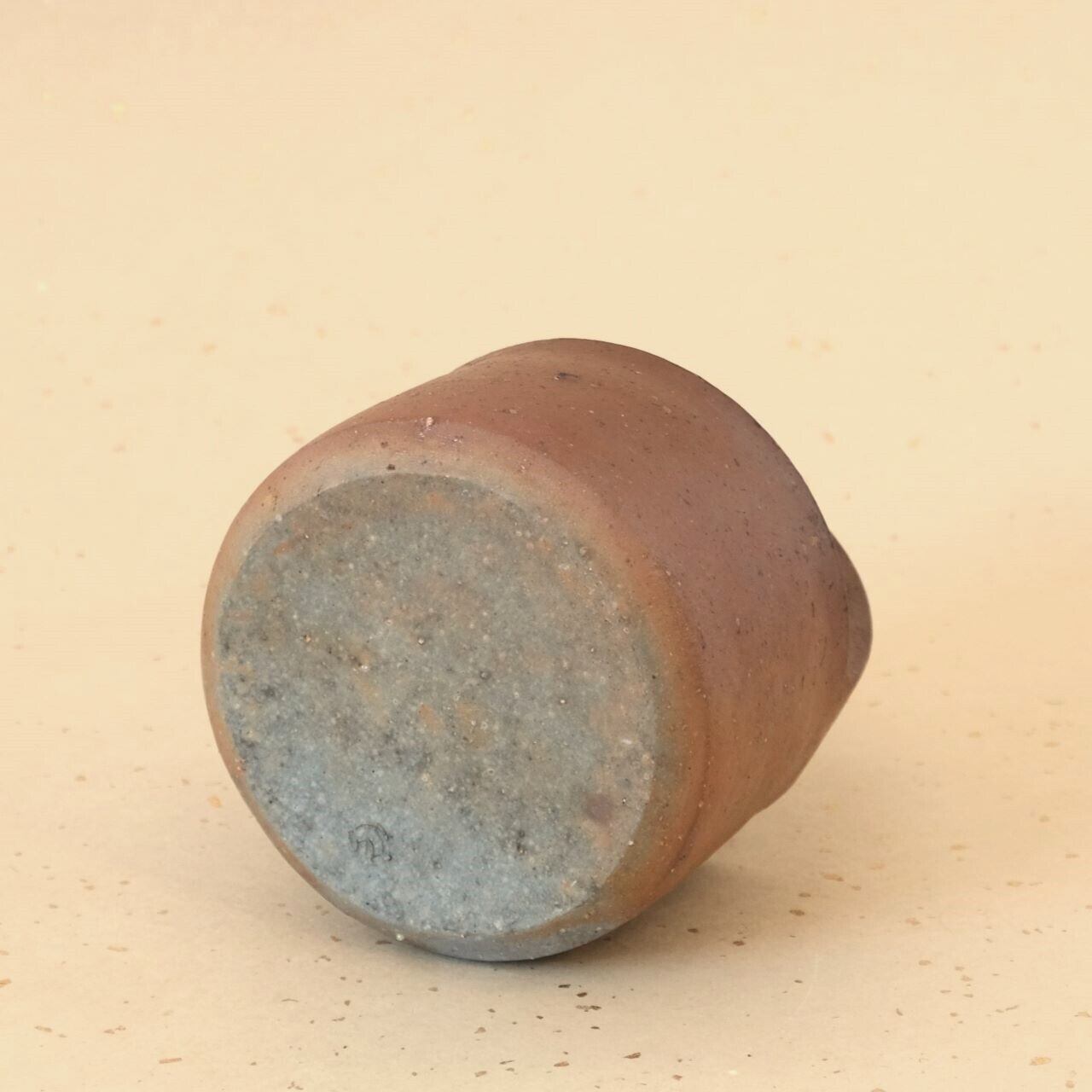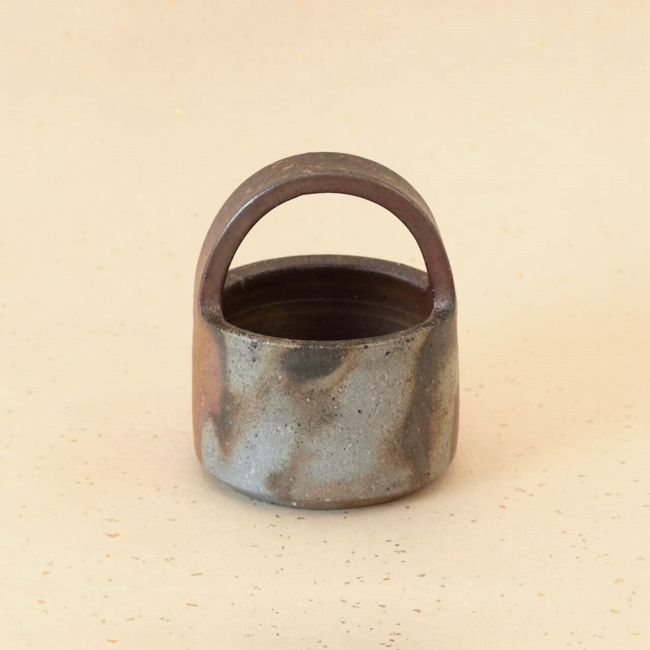 上部にアーチ状の装飾をつけた小型の花入です。窯の火を止める直前に、作品の周りへ木炭を振りかけることにより、ガスの作用を受け、青みがかった表情が生まれています。