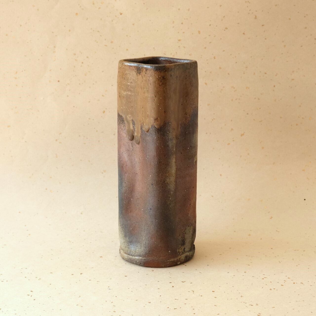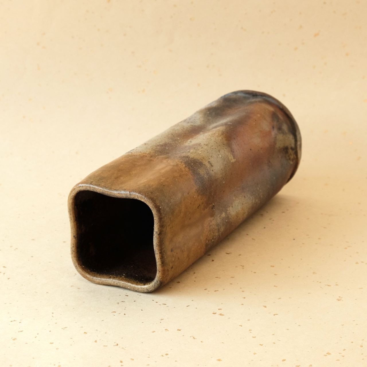 筒形の四方を変形させたやや背の高い花入です。燃料である松割木の灰や木炭のガスの影響を受け、黄みがかった色合いや青みがかった変化を楽しむことができます。