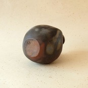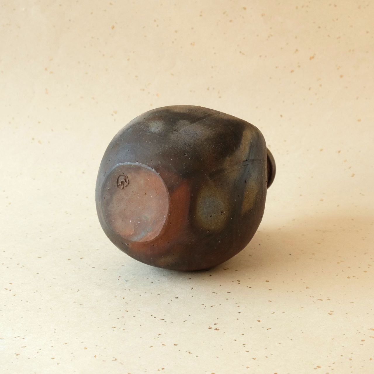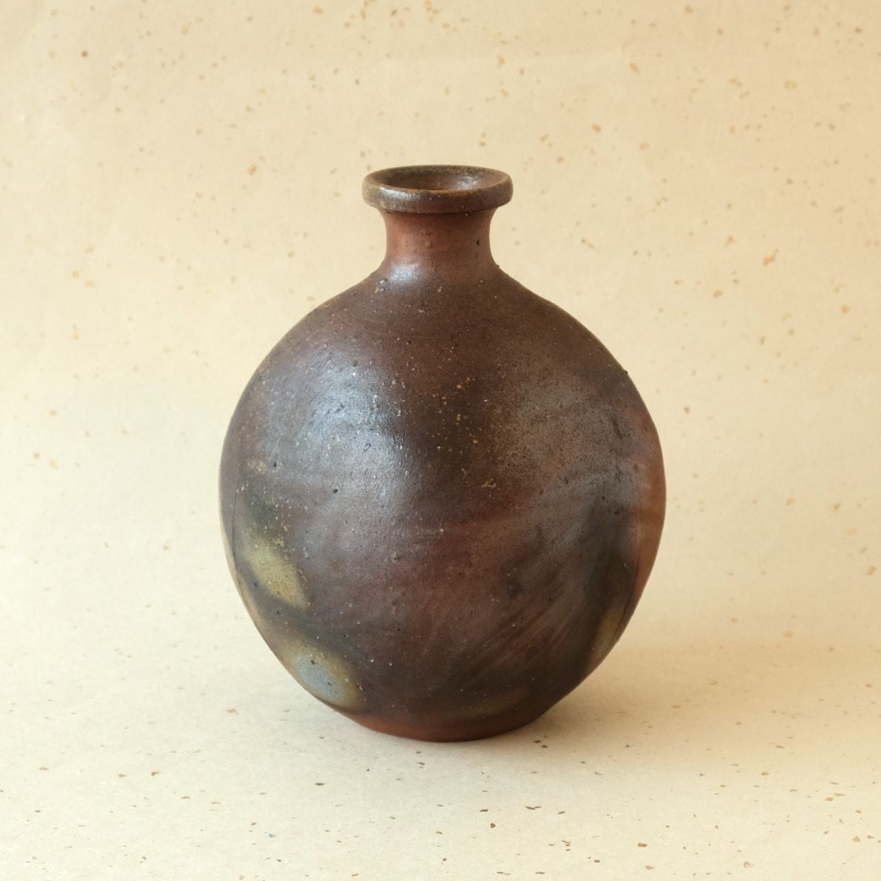 徳利の形状をした花入で、成形時に変形させて形に変化を与えています。燃料である松割木の灰や木炭のガスの影響を受け、黄みがかった色合いや青みがかった変化を楽しむことができます。