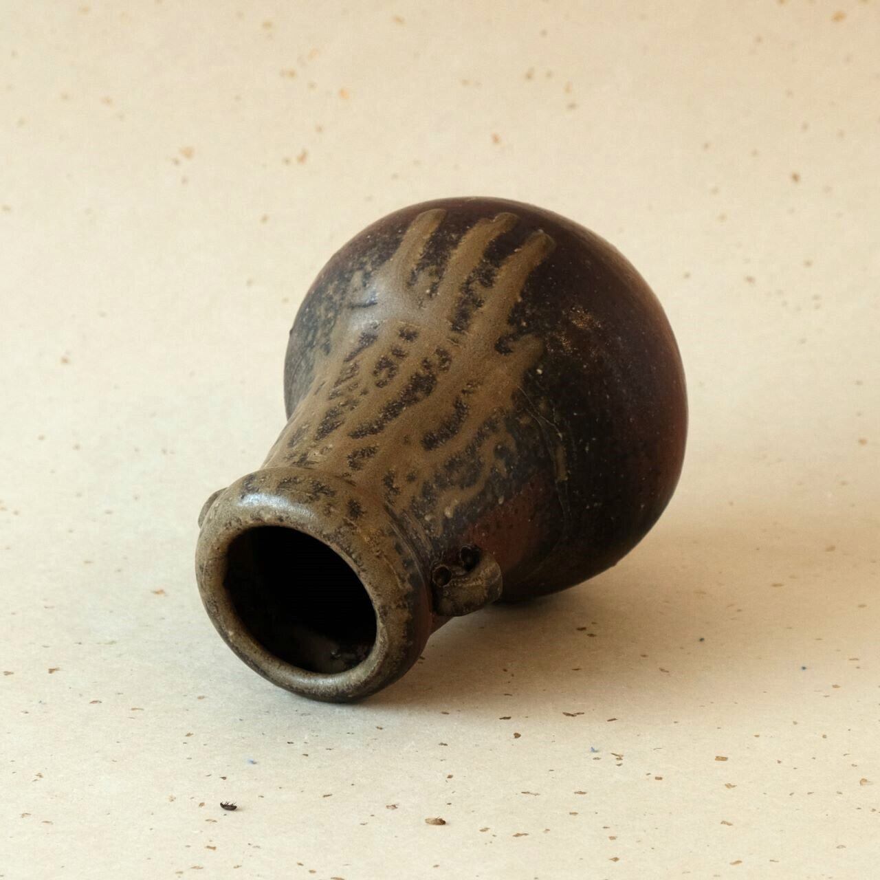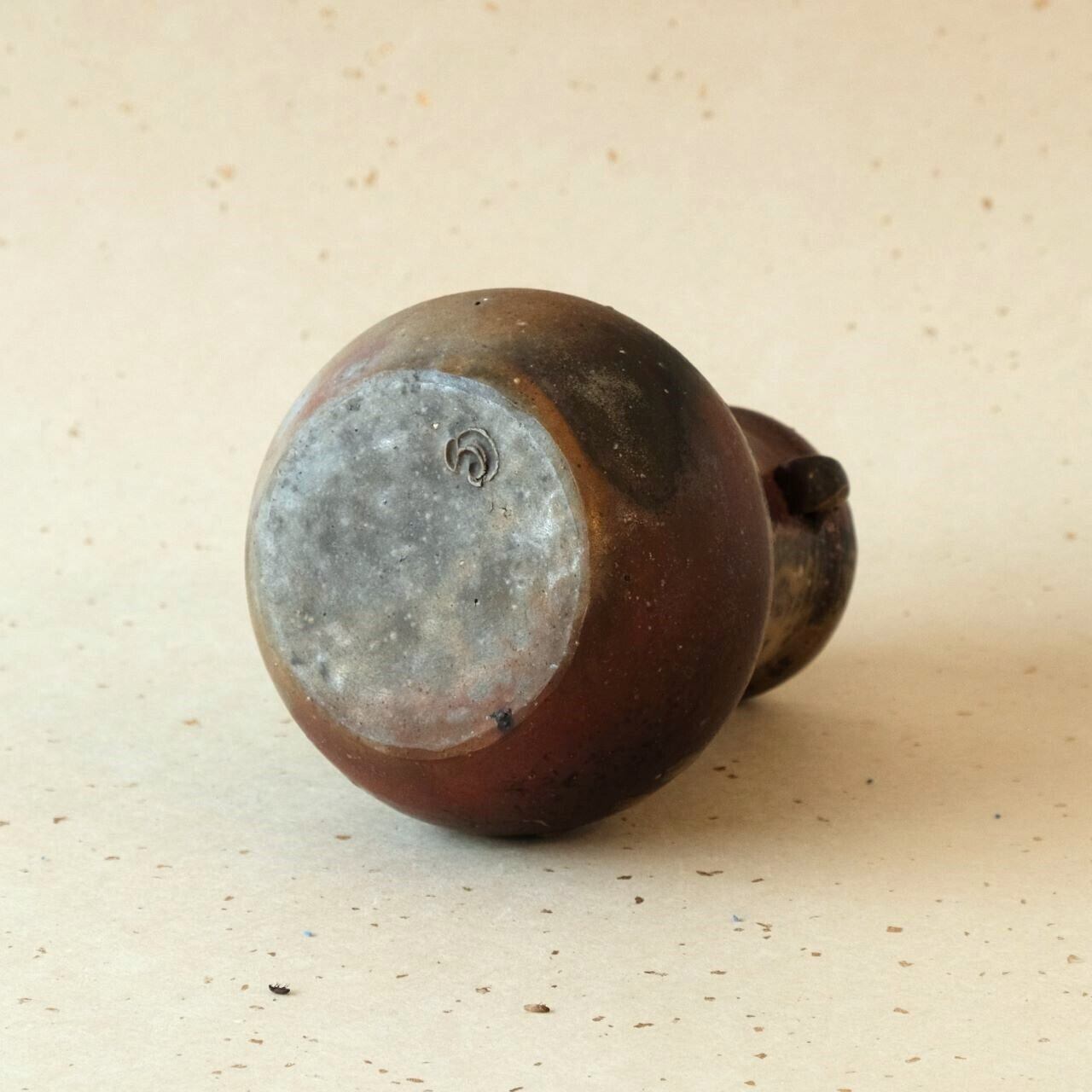 上部に耳のような装飾を施した小型の花入です。燃料である松割木の灰や木炭のガスの影響を受け、黄みがかった色合いや青みがかった変化を楽しむことができます。