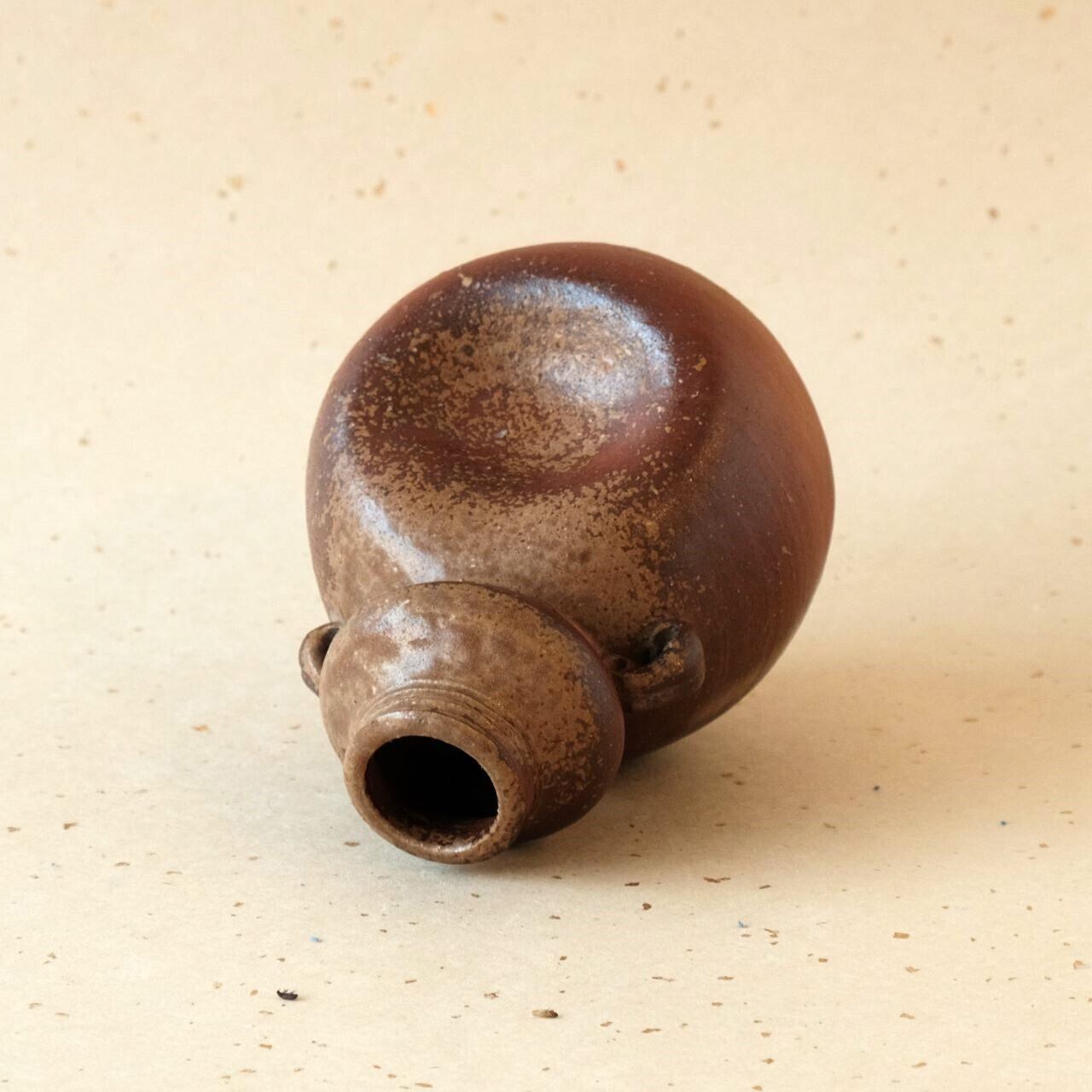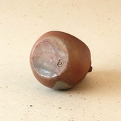 上部に耳のような装飾を施した小型の花入です。窯の火を止める直前に、作品の周りへ木炭を振りかけることにより、ガスの作用を受け、青みがかった表情が生まれています。