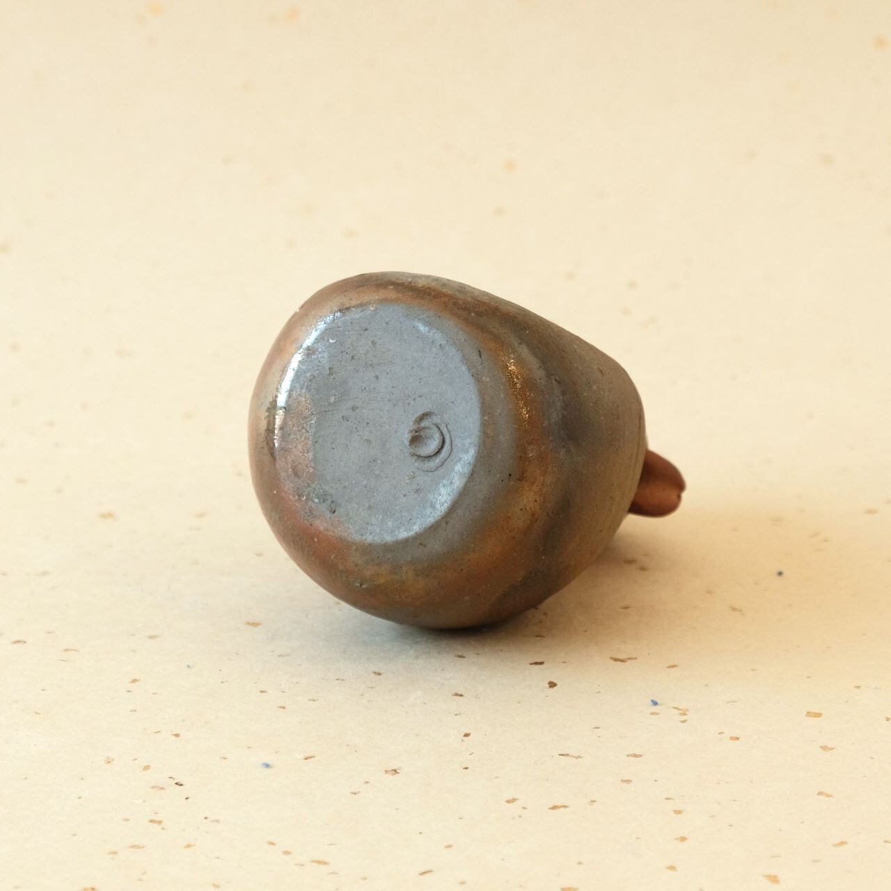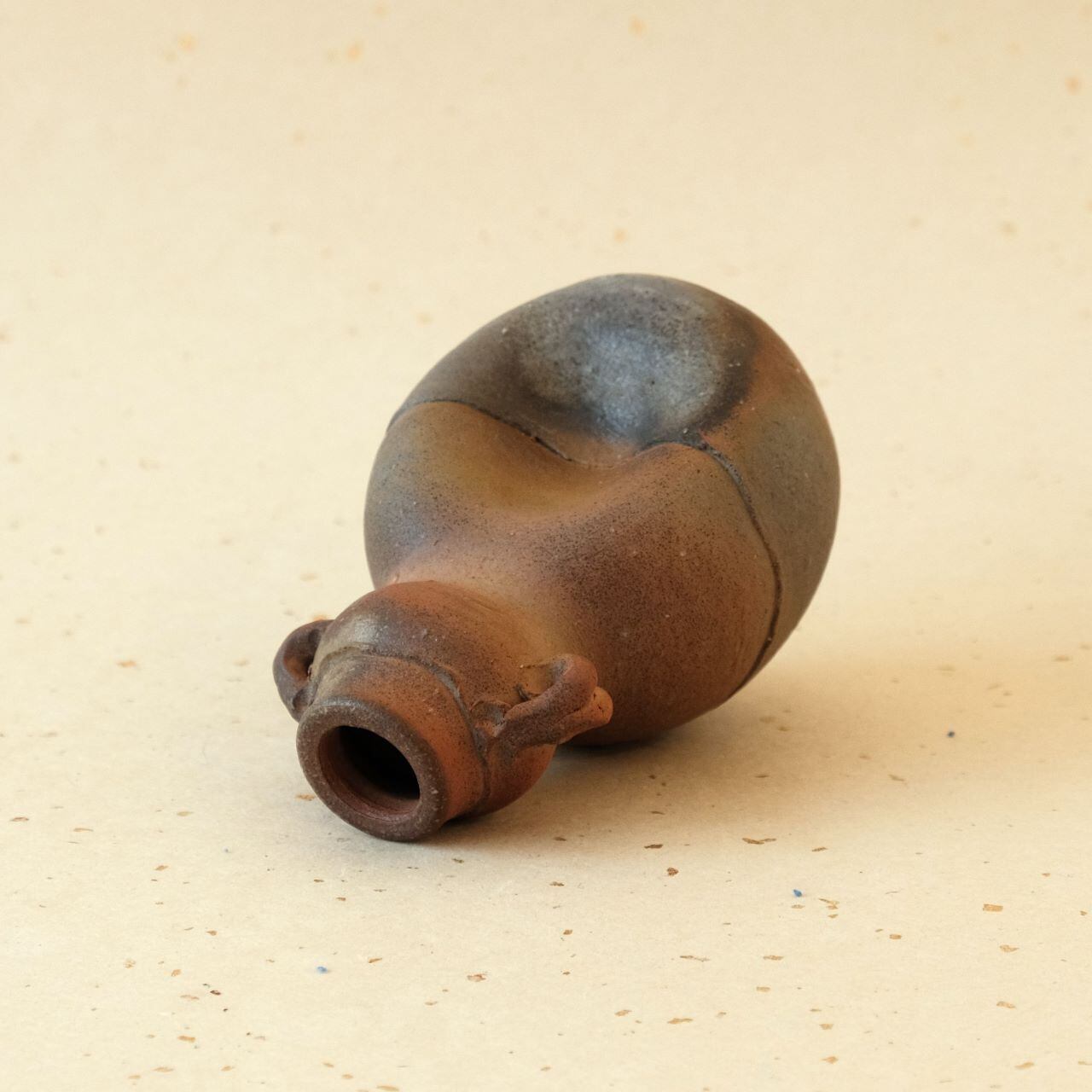耳のような装飾や変形を加えた豆花入です。窯の火を止める直前に、作品の周りへ木炭を振りかけることにより、ガスの作用を受け、青みがかった表情が生まれています。