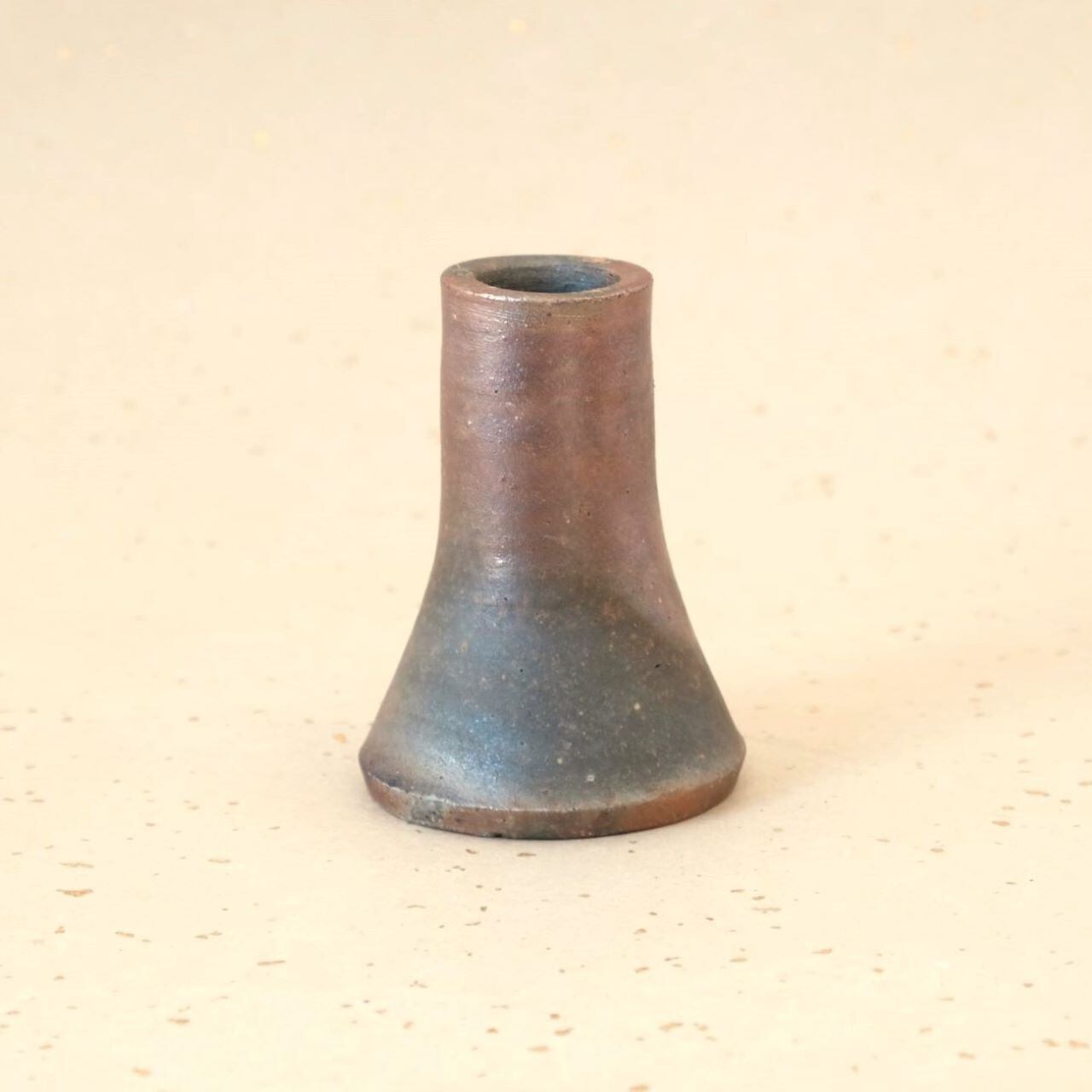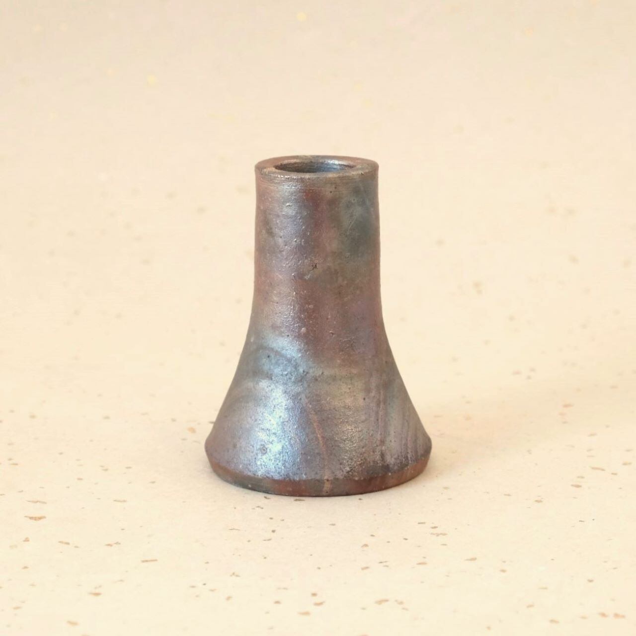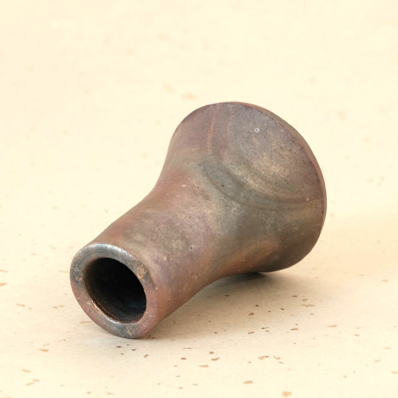 シンプルなデザインの豆花入です。窯の火を止める直前に、作品の周りへ木炭を振りかけることにより、巻いていたワラとガスの作用を受け、さまざまな表情が生まれています。