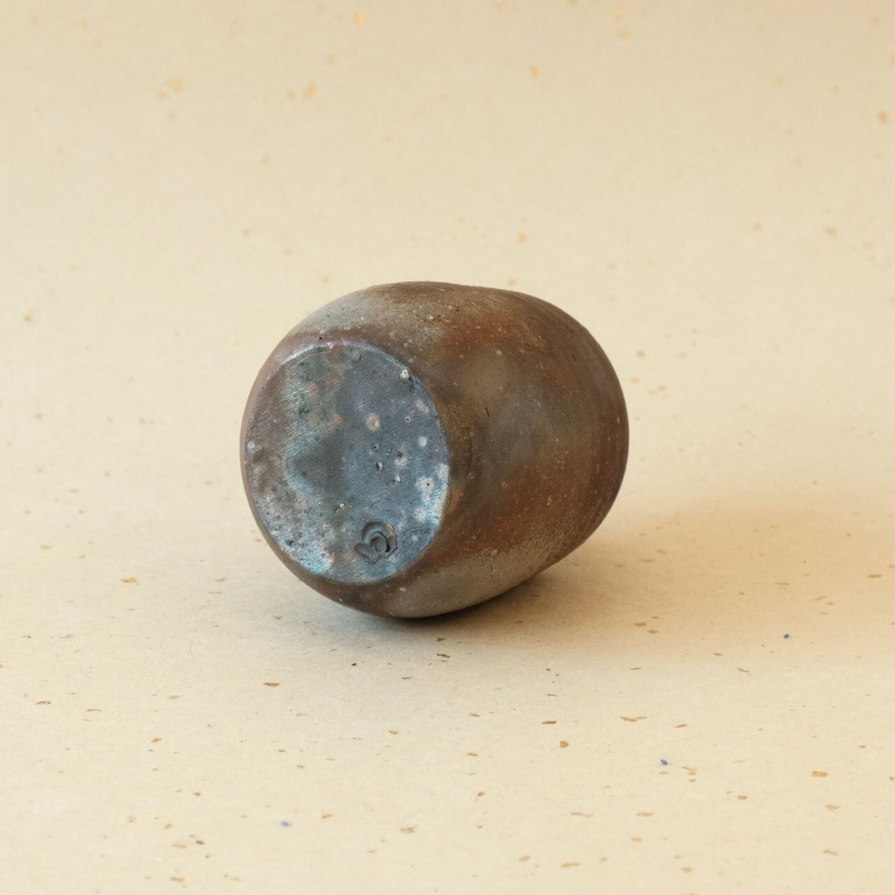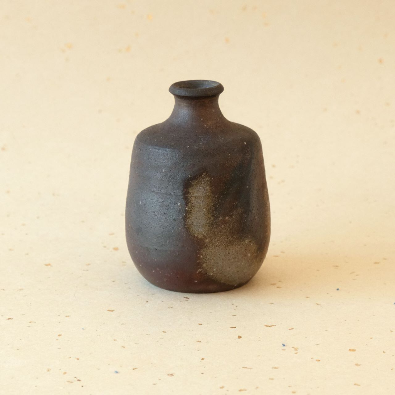 一輪花入などに使っていただける小さな徳利です。窯の火を止める直前に、作品の周りへ木炭を振りかけることにより、ガスの作用を受け、青みがかった表情が生まれています。