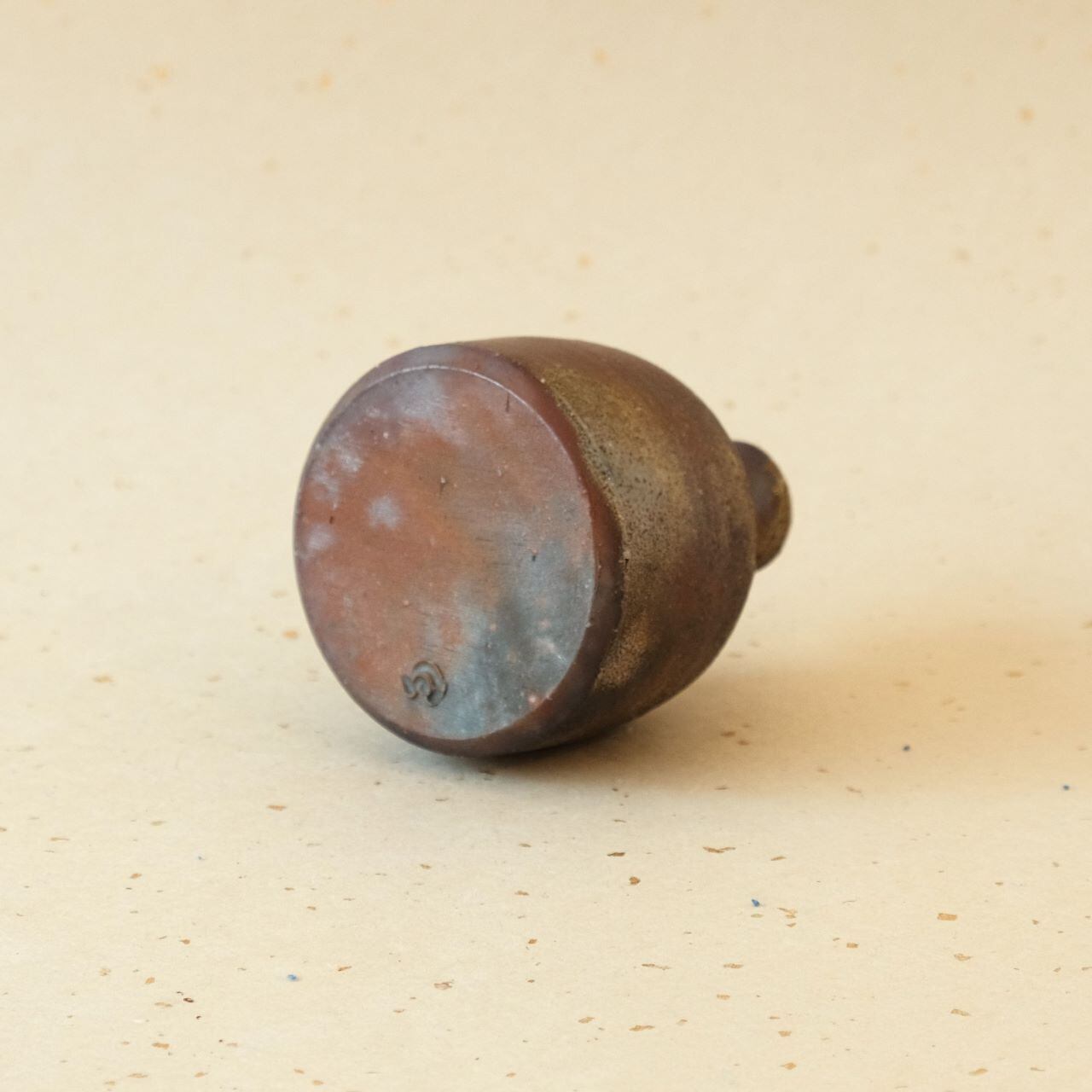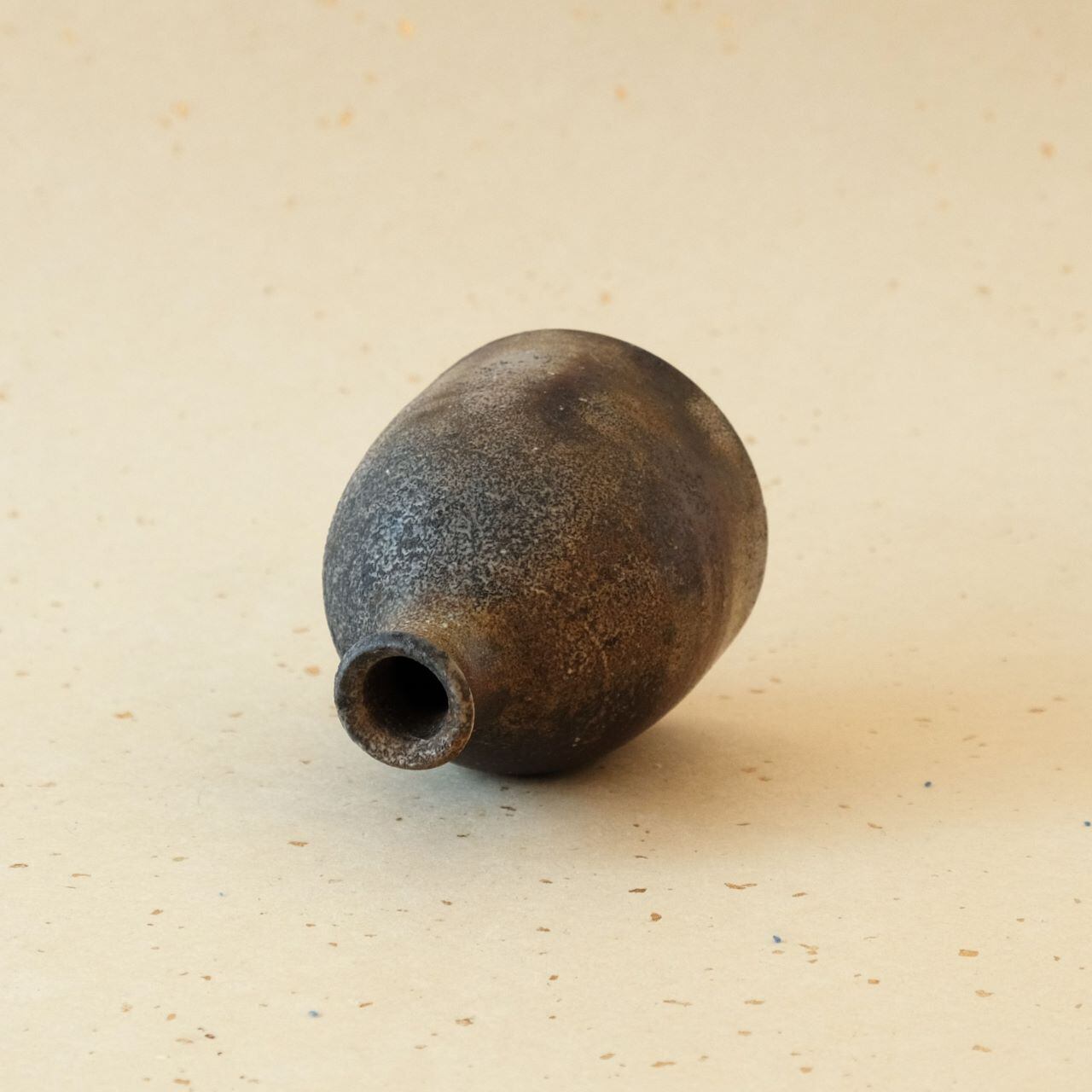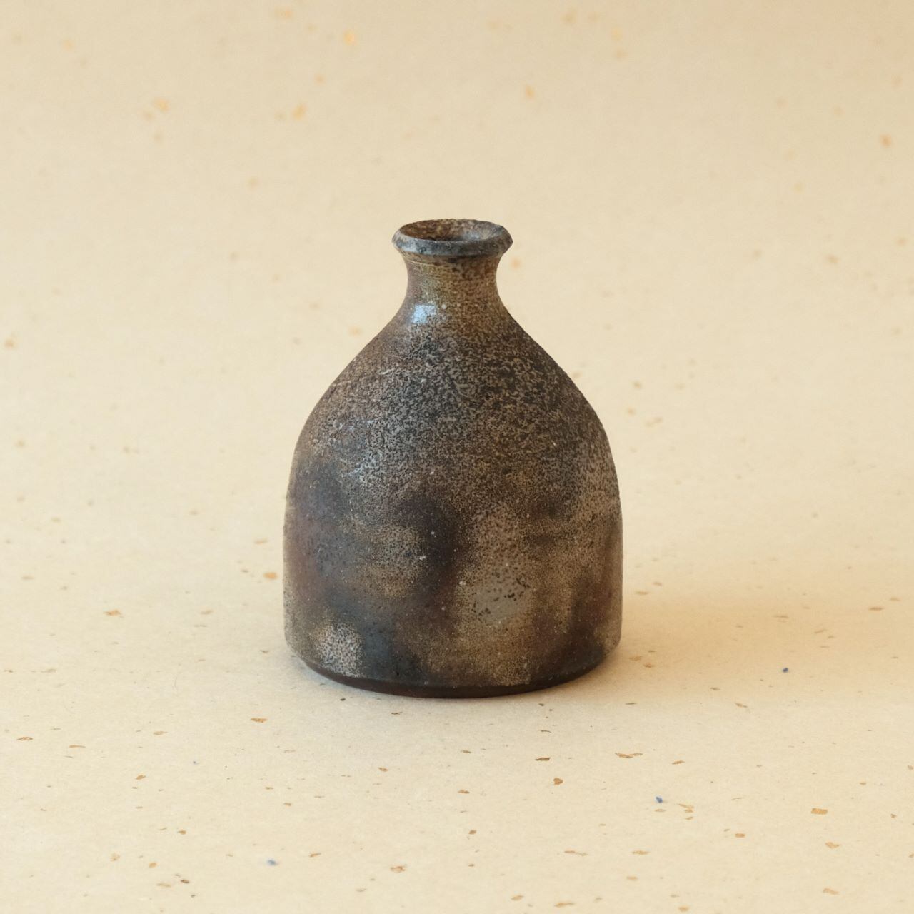 一輪花入などに使っていただける小さな徳利です。窯の火を止める直前に、作品の周りへ木炭を振りかけることにより、ガスの作用を受け、青みがかった表情が生まれています。