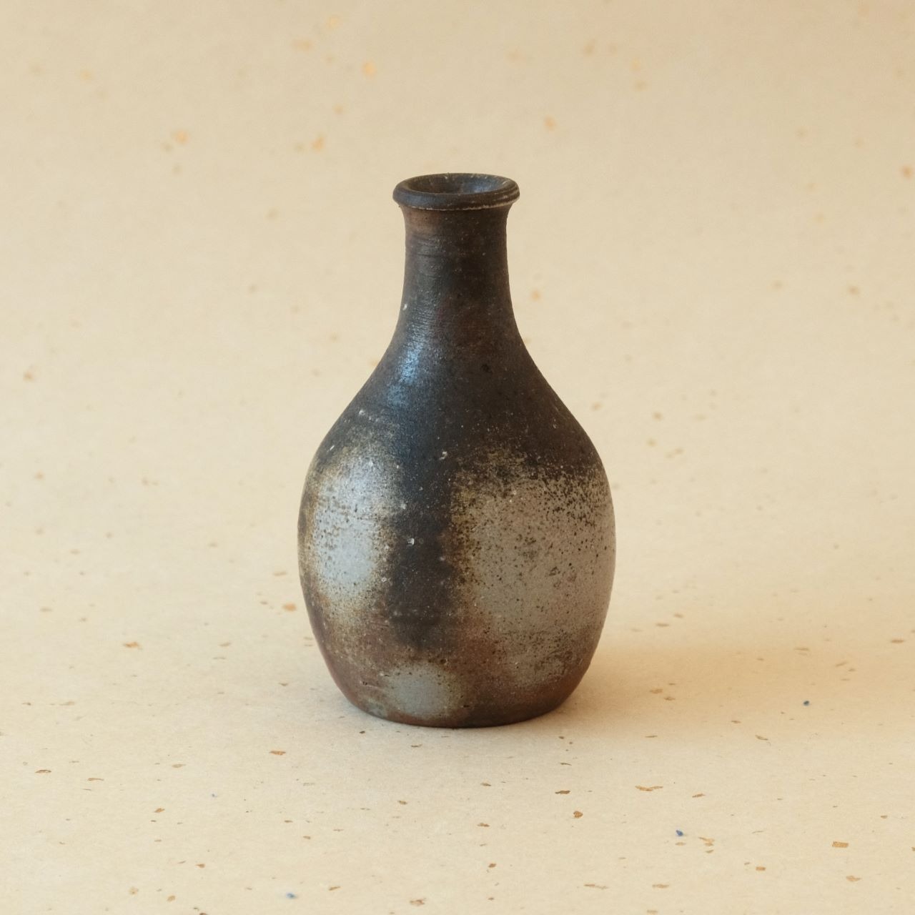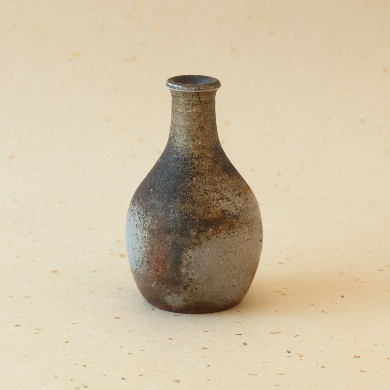 一輪花入などに使っていただける小さな徳利です。窯の火を止める直前に、作品の周りへ木炭を振りかけることにより、ガスの作用を受け、青みがかった表情が生まれています。