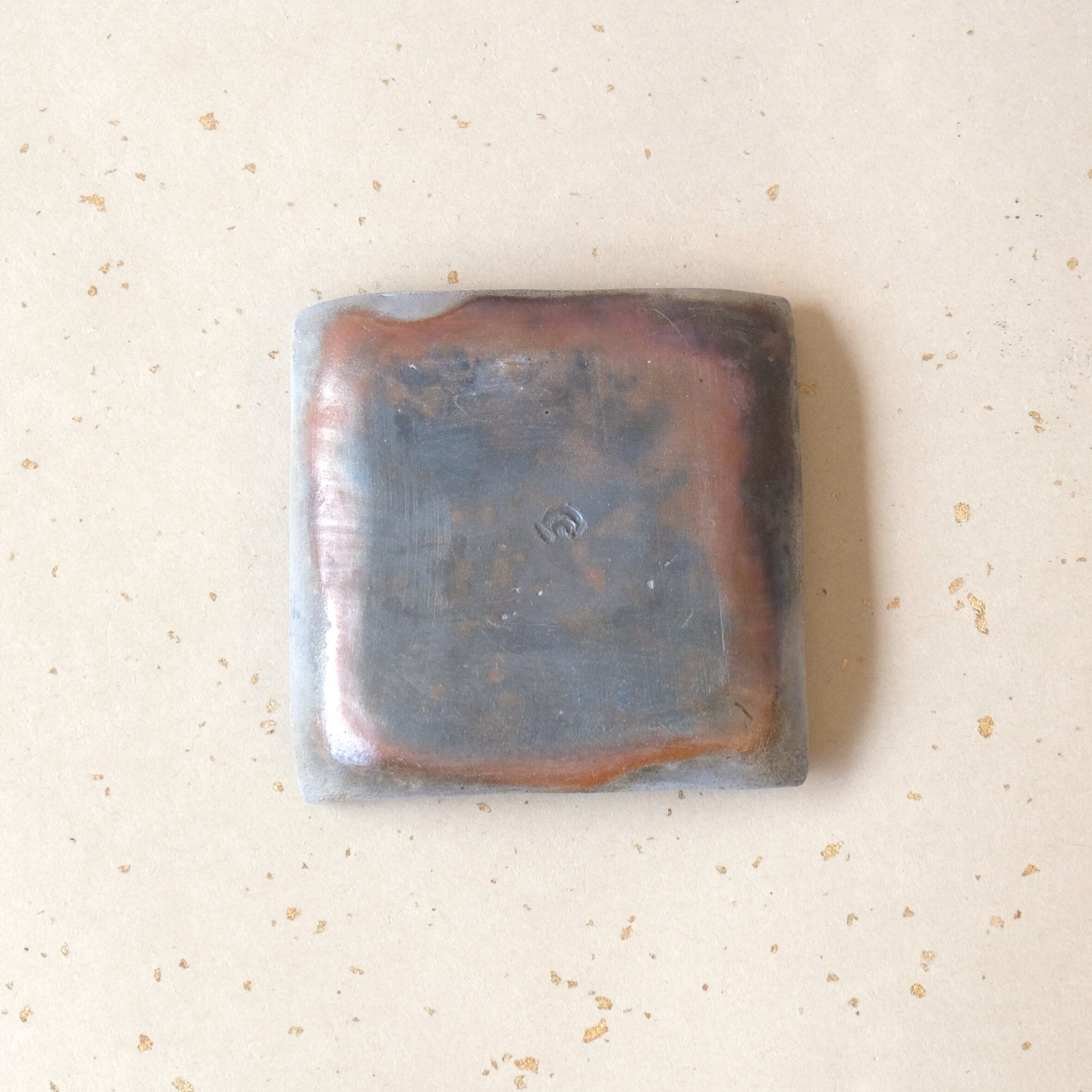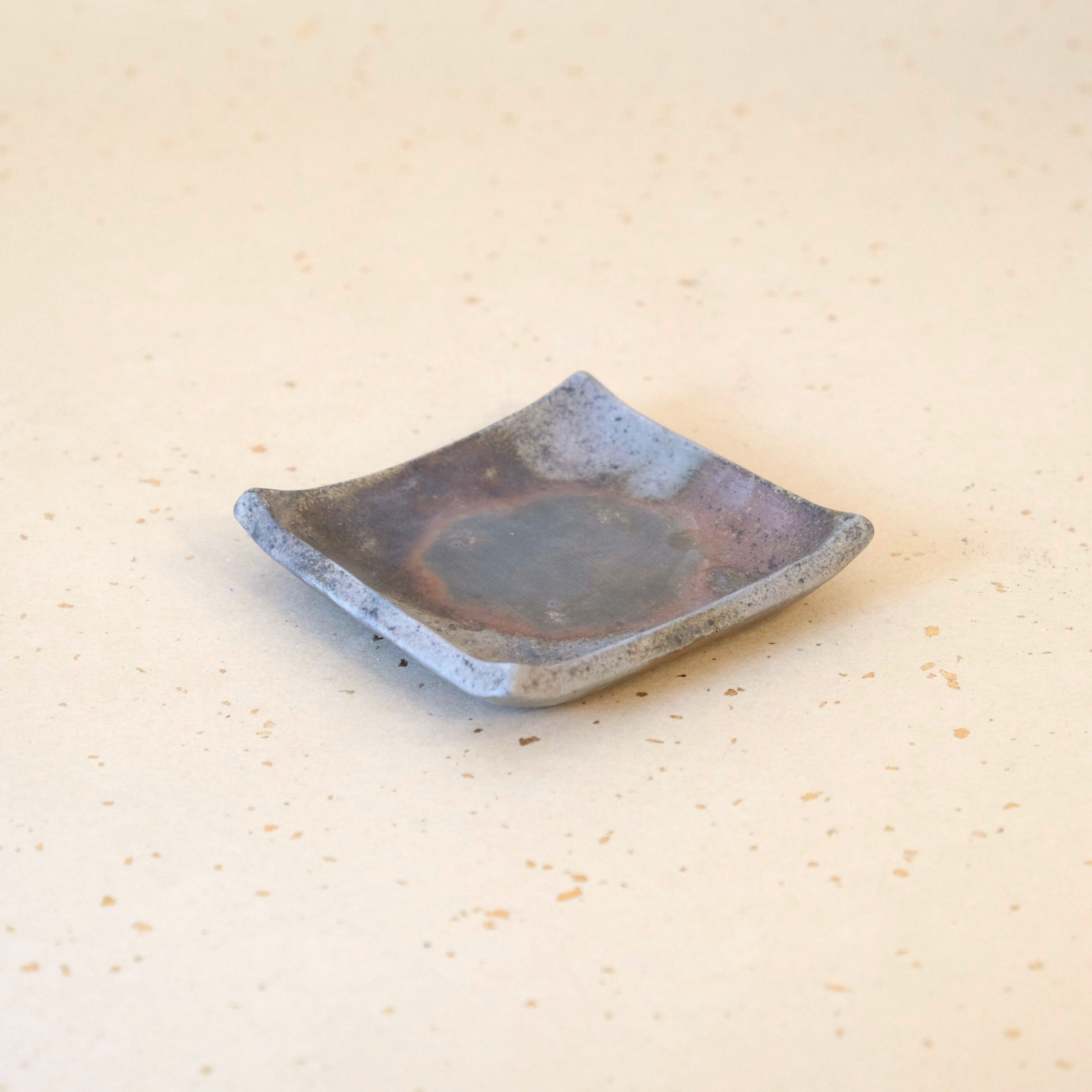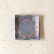 シンプルな正方形の豆皿です。縁を軽く曲げているので汁気のあるものでも盛り付けることができます。木炭とワラの影響を受け、全体的に落ち着いた雰囲気に仕上がっています。