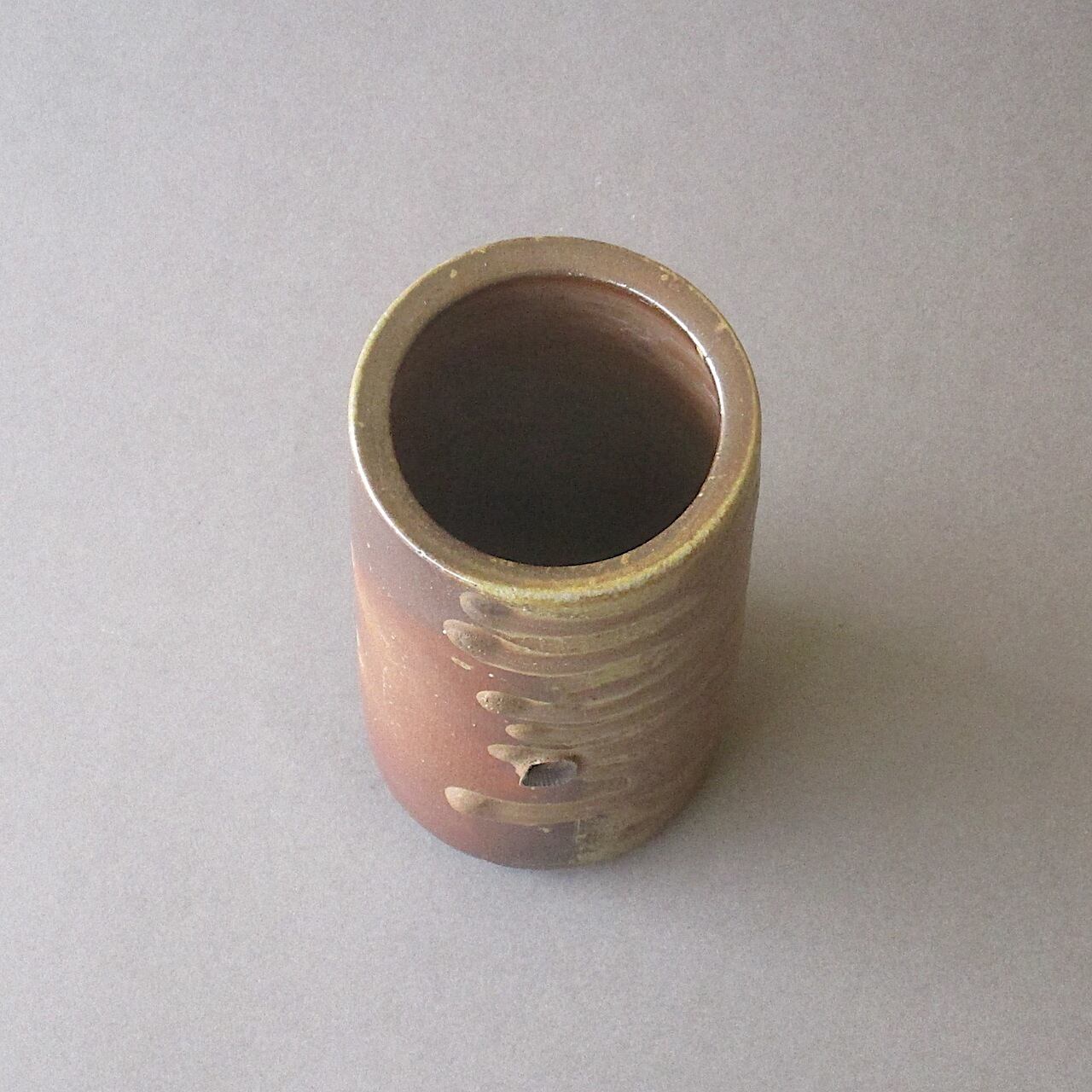シンプルな筒形の花入です。焚口の近くに転がして焼成することにより、燃料の松割木の灰が降りかかり、溶け出した部分が景色となっています。