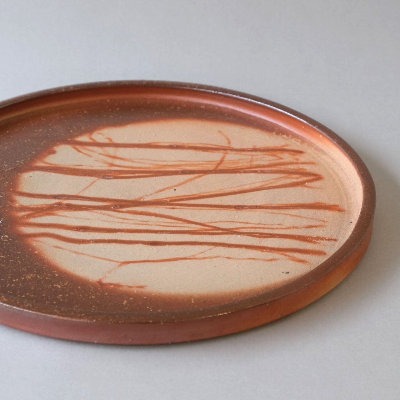 シンプルなデザインの丸形プレートです。ワラと接していた部分が赤く発色し、松割木の灰が付着した部分は黄みおびた色合いとなっています。