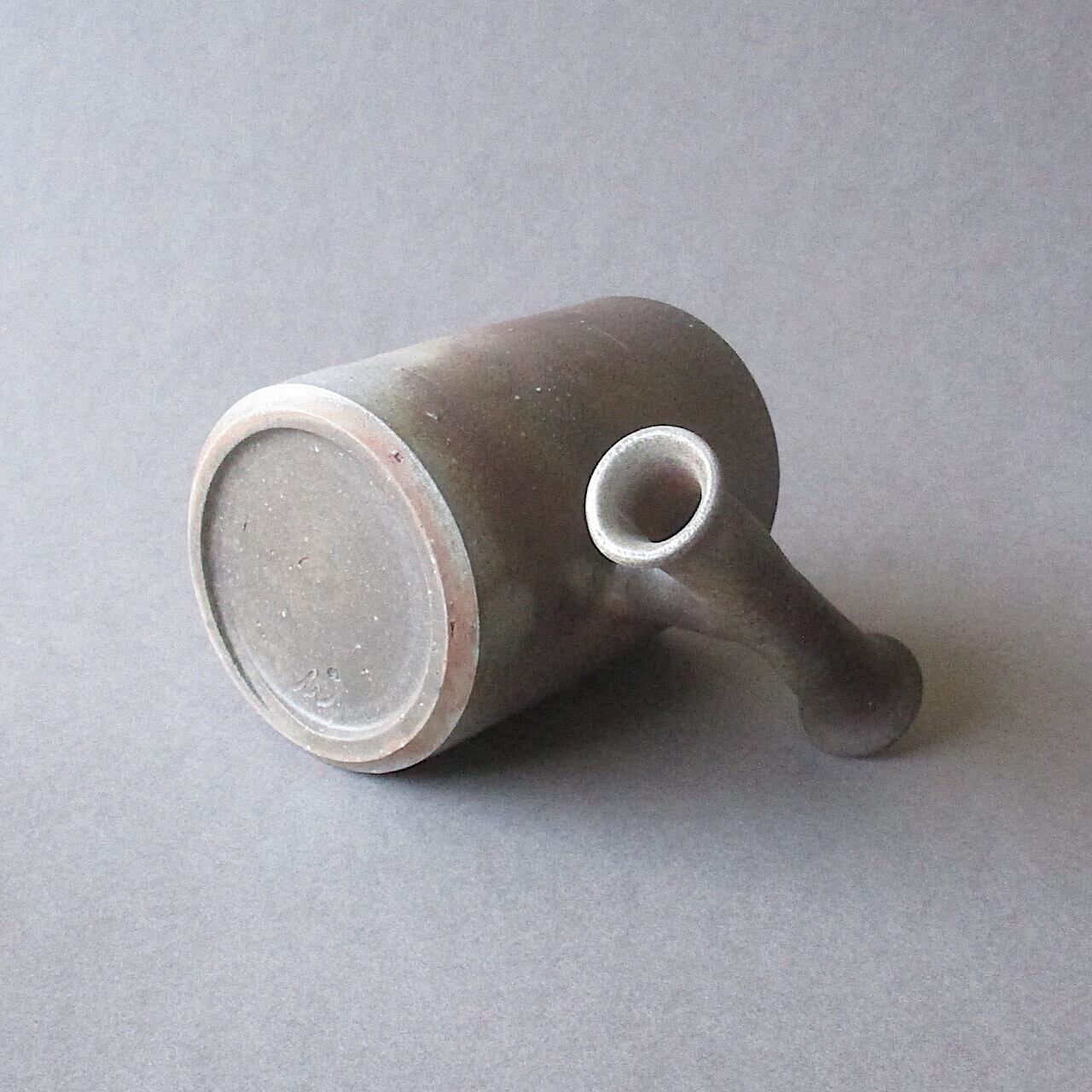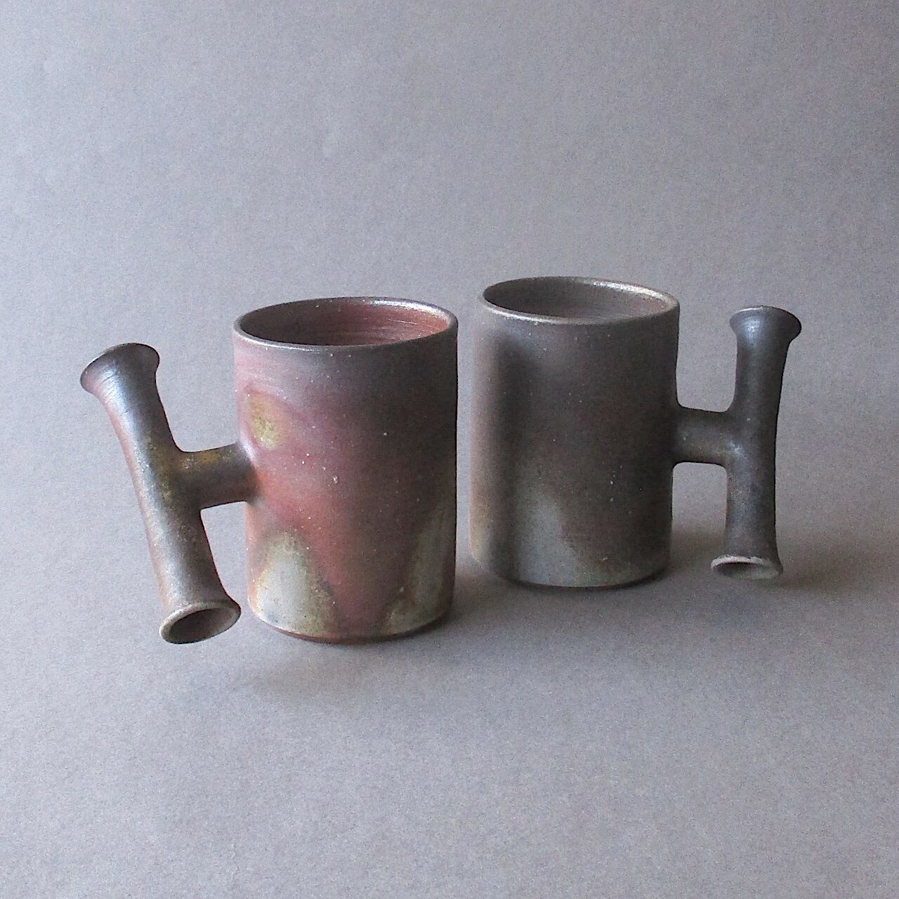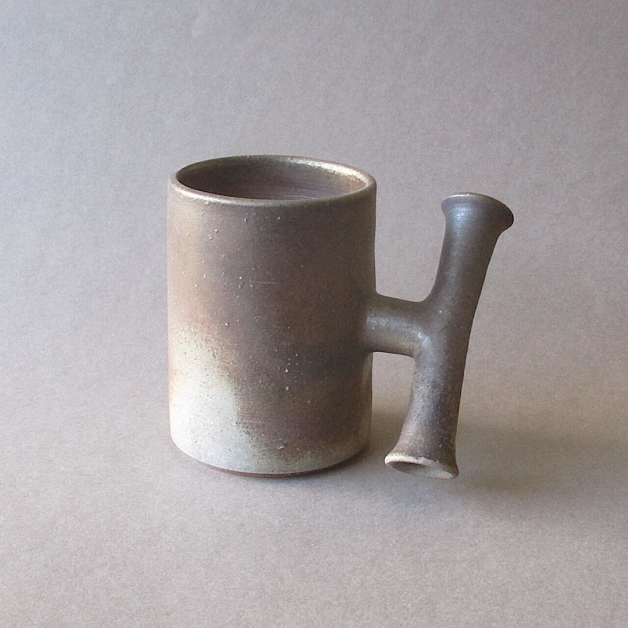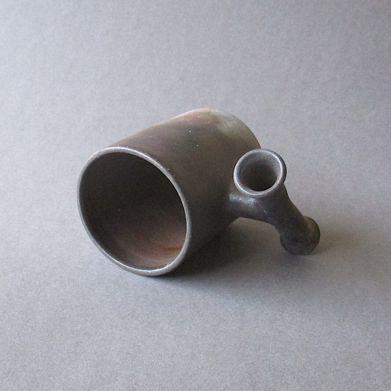 取っ手に傾きがあり、右手でしか持つことのできない右専用のマグです。外側は木炭のガスの影響を受け、青みがかった変化が現れています。