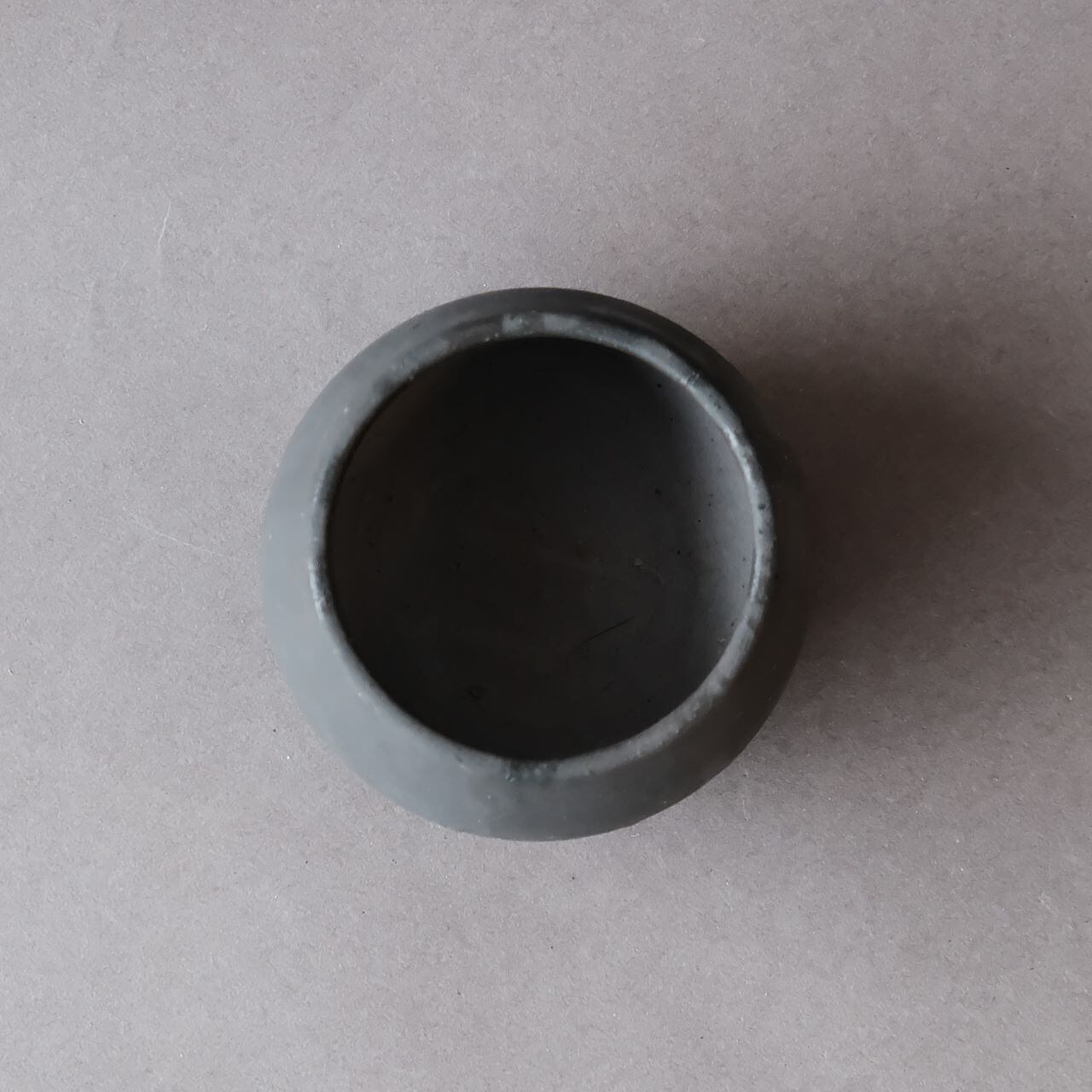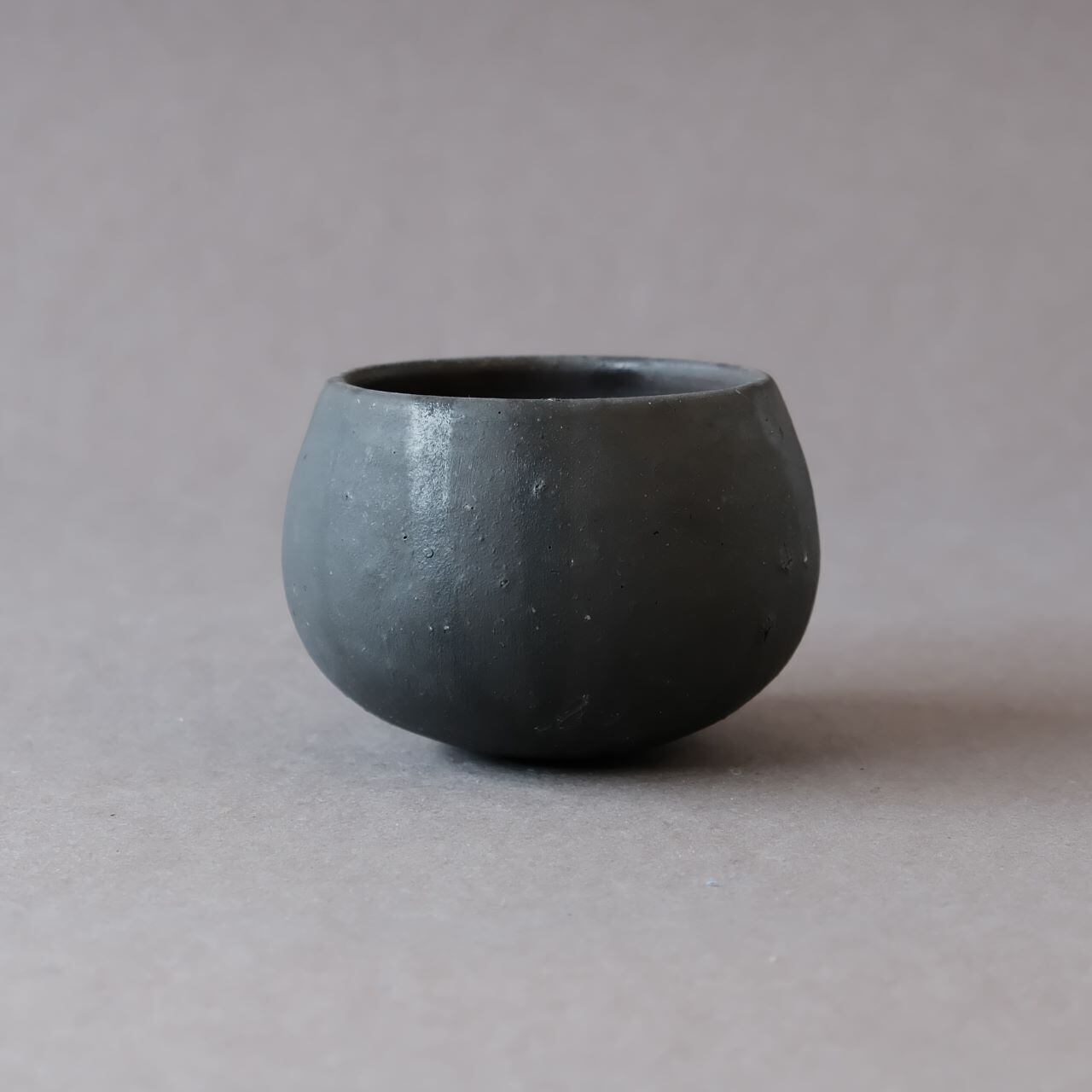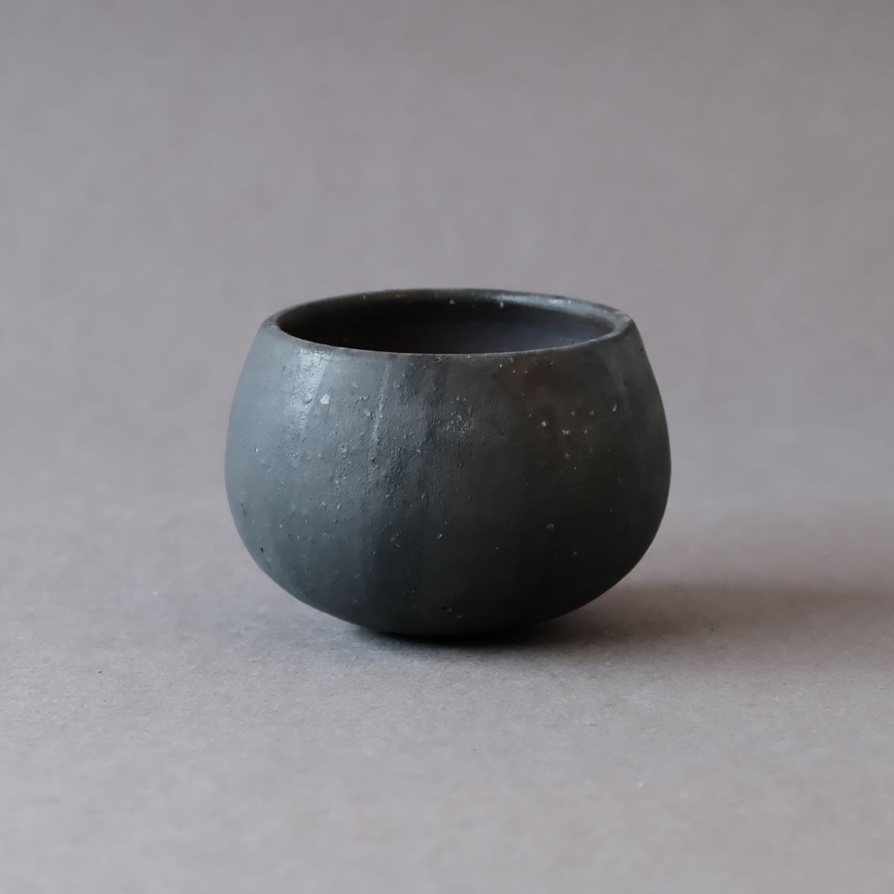ゆらゆらと揺れるぐい呑です。窯内で炭に埋もれた状態で焼成されることにより、黒くマットな質感に仕上がっています。ワラの模様もうかがうことができます。
