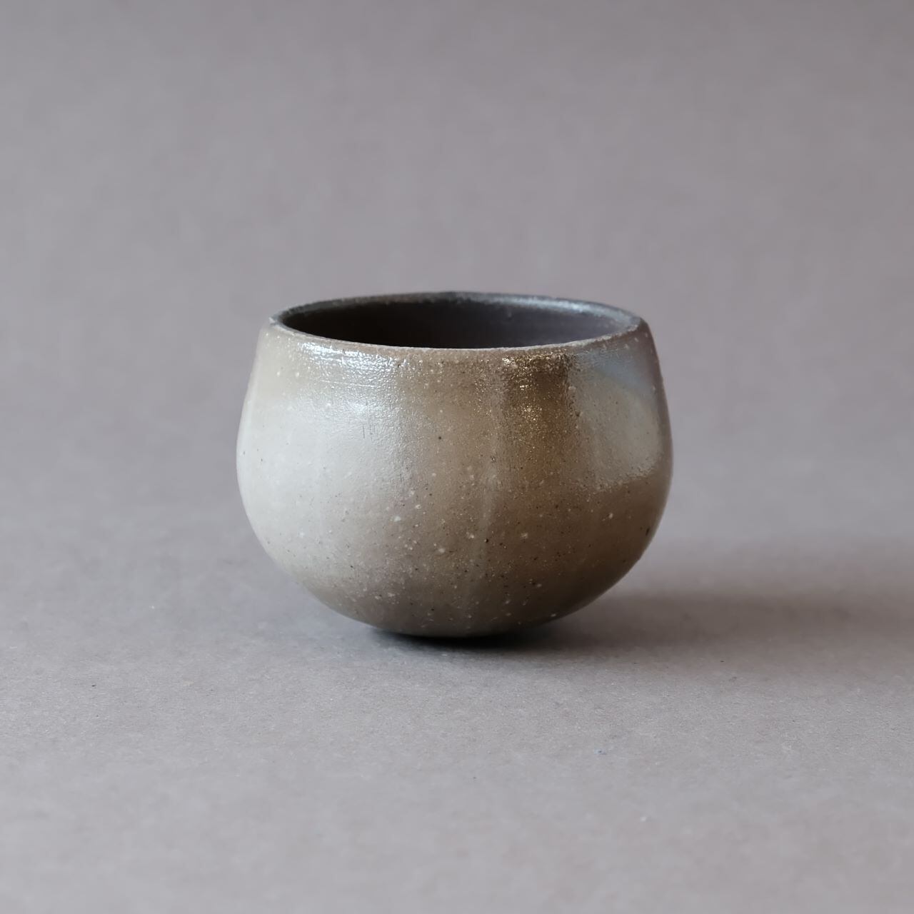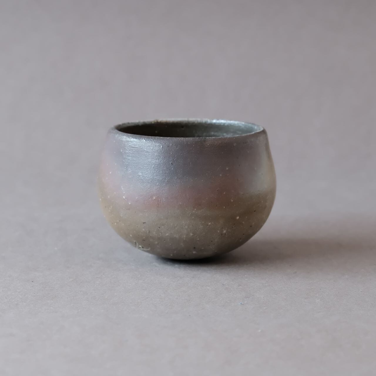 ゆらゆらと揺れるぐい呑です。窯内で炭のガスの影響を受け、全体に青みがかかった色合いとなっています。