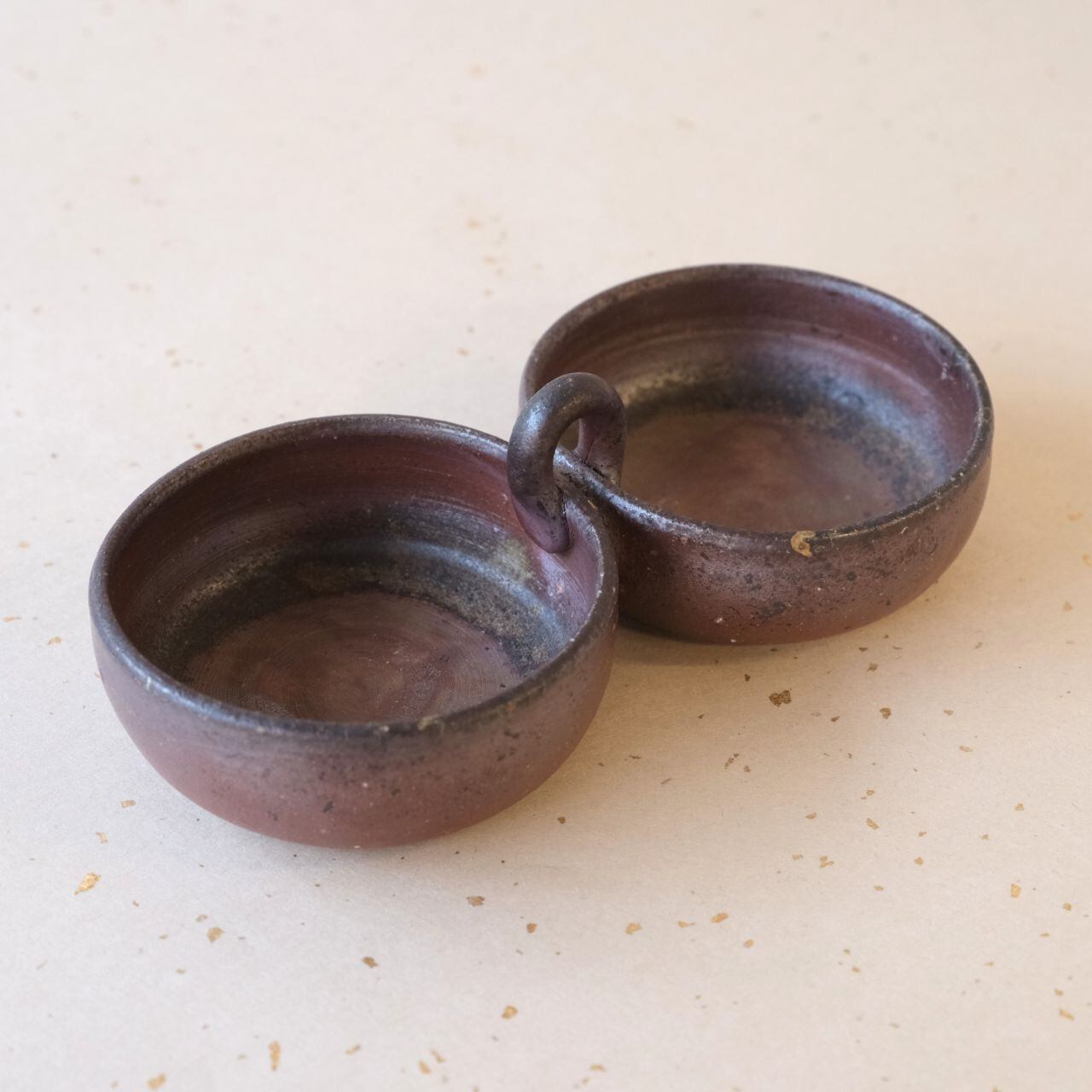 豆鉢を二つ繋げ、中央につまみを付けた形のうつわです。薬味入などに使っていただけます。木炭のガスの作用により、青味がかった色合いが現れています。