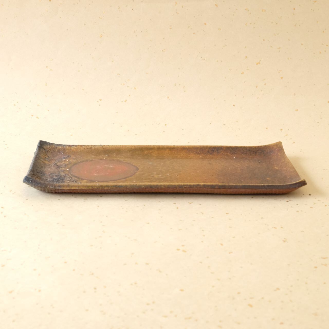 シンプルな長方形のお皿です。縁を軽く曲げているので汁気のあるものでも盛り付けることができます。片面には松割木の灰がかかり、丸い抜け模様(牡丹餅)がアクセントになっています。