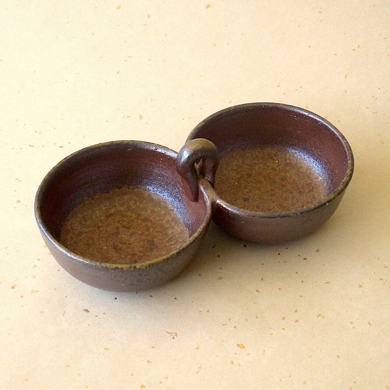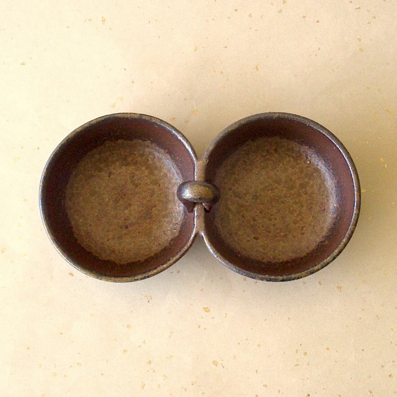 豆鉢を二つ繋げ、中央につまみを付けた形のうつわです。薬味入などに使っていただけます。燃料の松割木の灰が降りかかり、黄味がかった色合いが現れています。