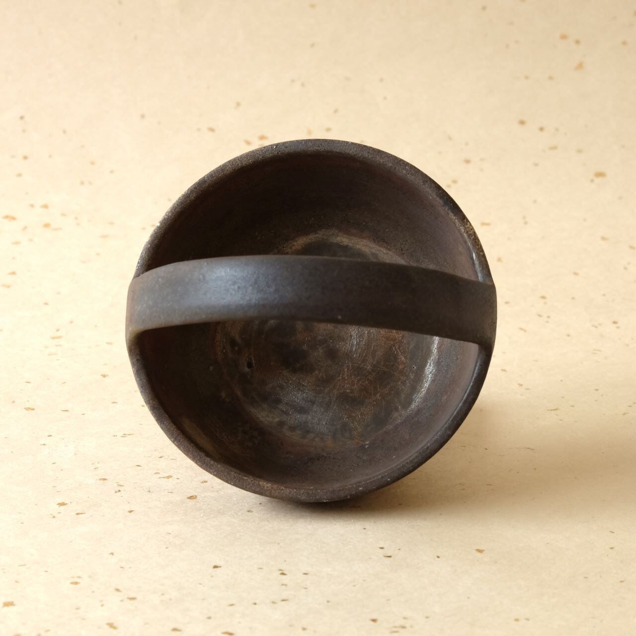 アーチ状の取っ手が付いた豆鉢です。鍵やアクセサリーなどの小物入れとしても使っていただけます。木炭のガスの作用により、青味がかった色合いが現れています。
