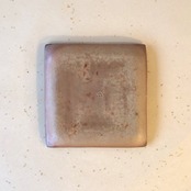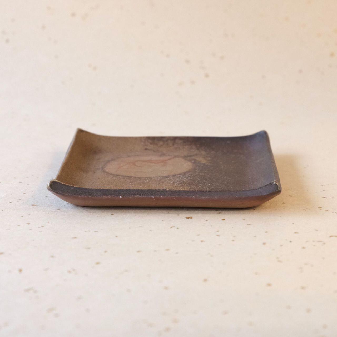 シンプルな正方形のお皿です。縁を軽く曲げているので汁気のあるものでも盛り付けることができます。片面には松割木の灰がかかり、丸い抜け模様(牡丹餅)がアクセントになっています。