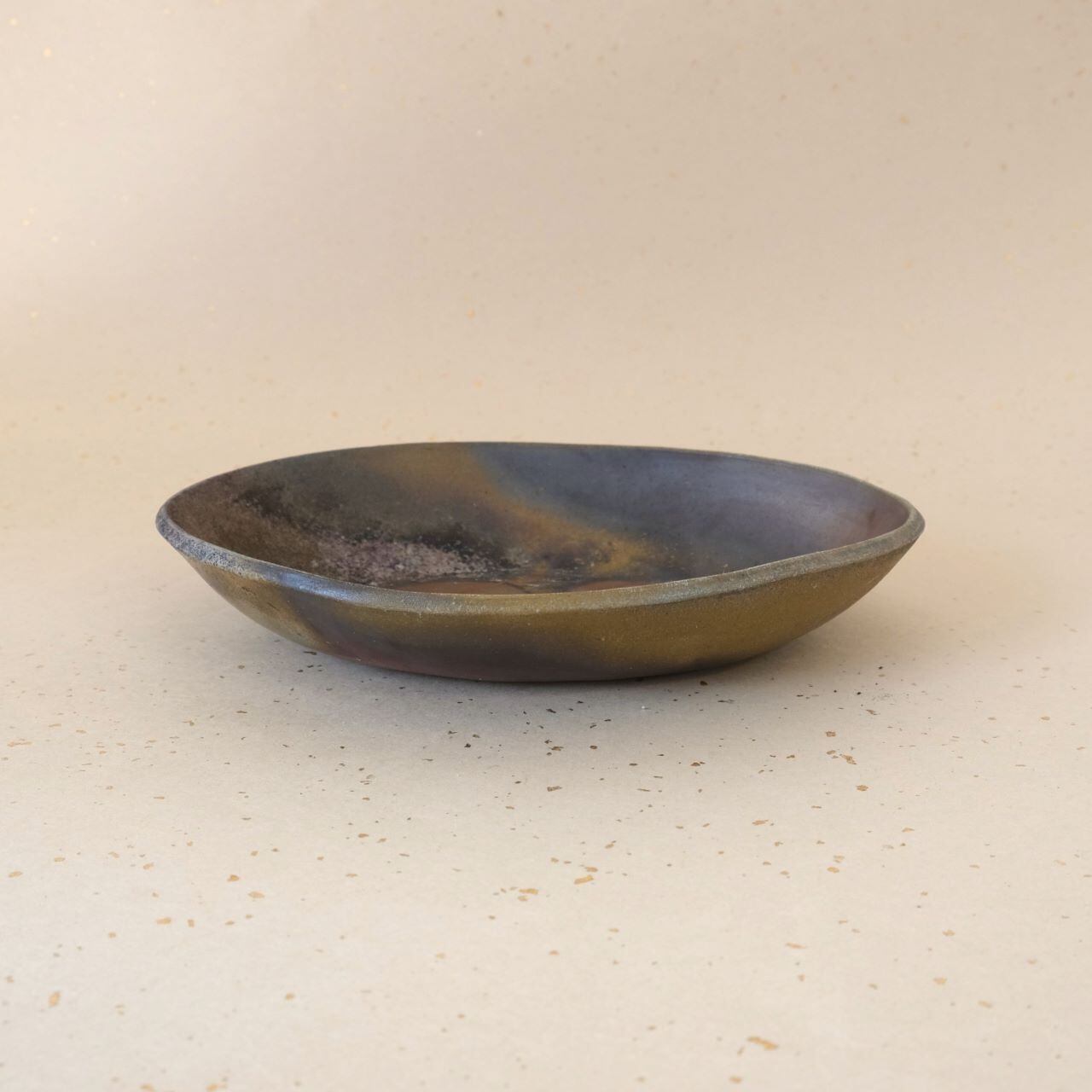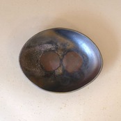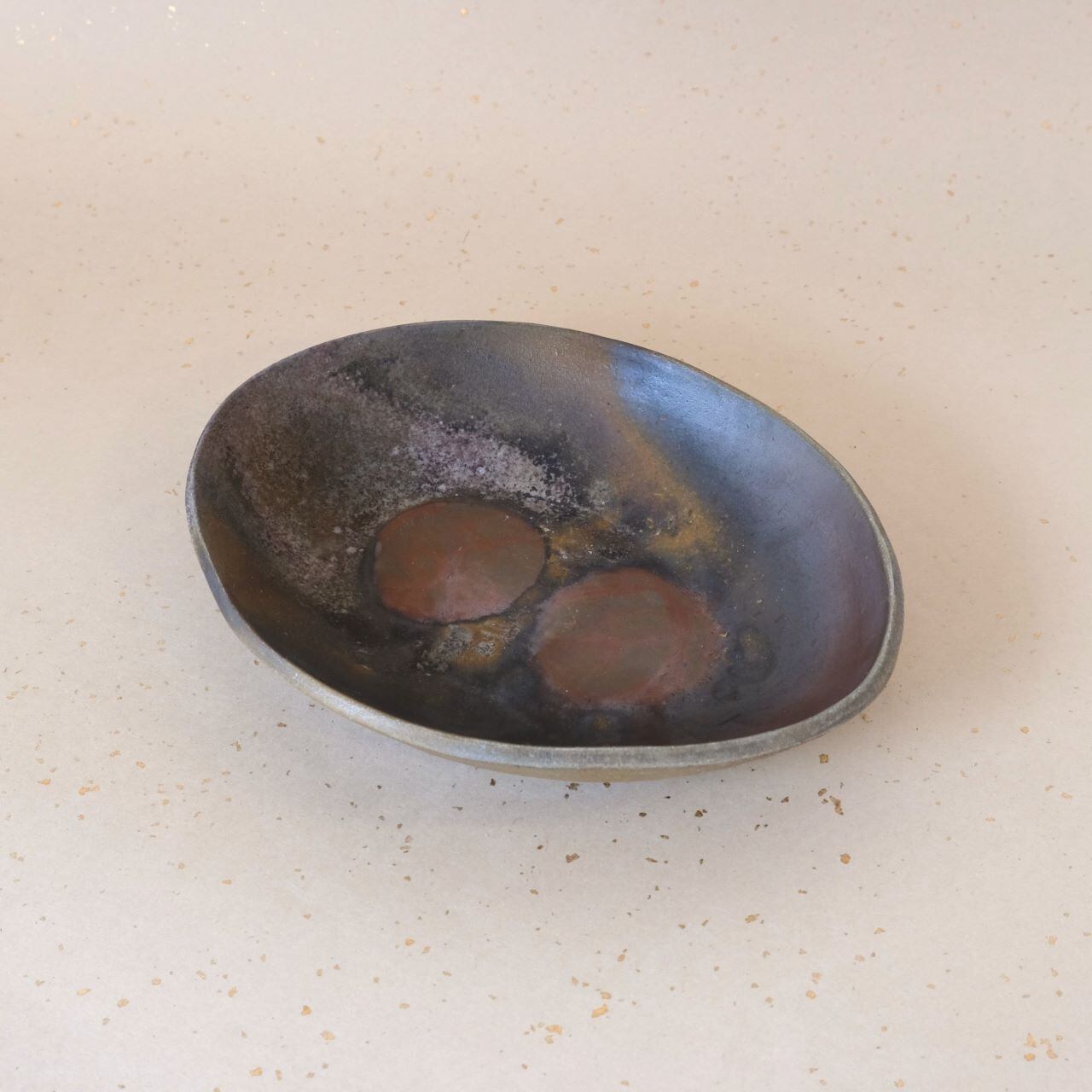 どっしりとした楕円形の鉢です。カレーのうつわやサラダボウルとしても使っていただけます。燃料の松割木の灰や炭の作用によって生まれた変化に丸い抜け模様がアクセントになっています。