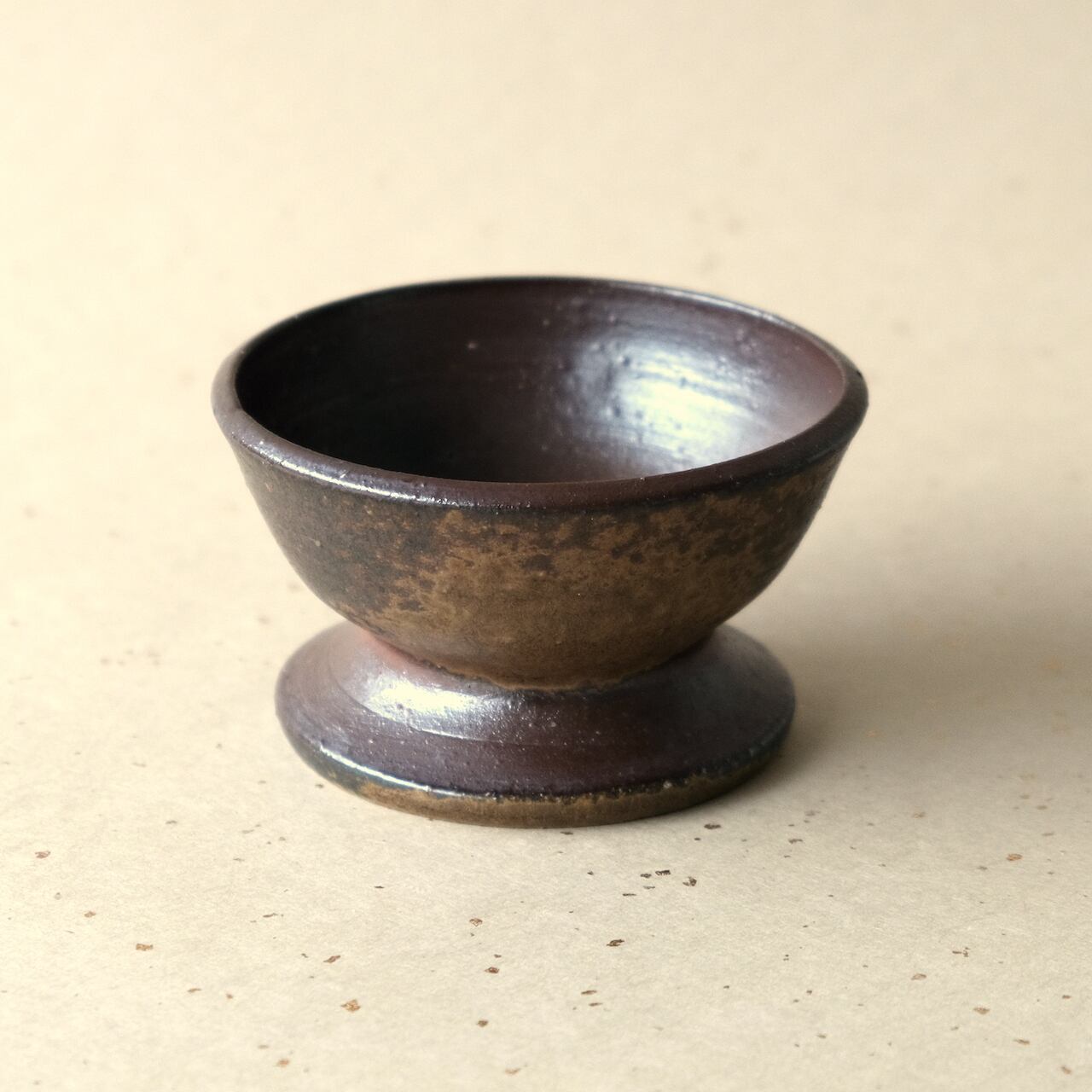 シンプルな形状の台付き小鉢です。料理やデザートのうつわだけでなく、小物入れなどにも使っていただけます。燃料である松割木の灰が降りかかり、とけた部分に景色が生まれています。