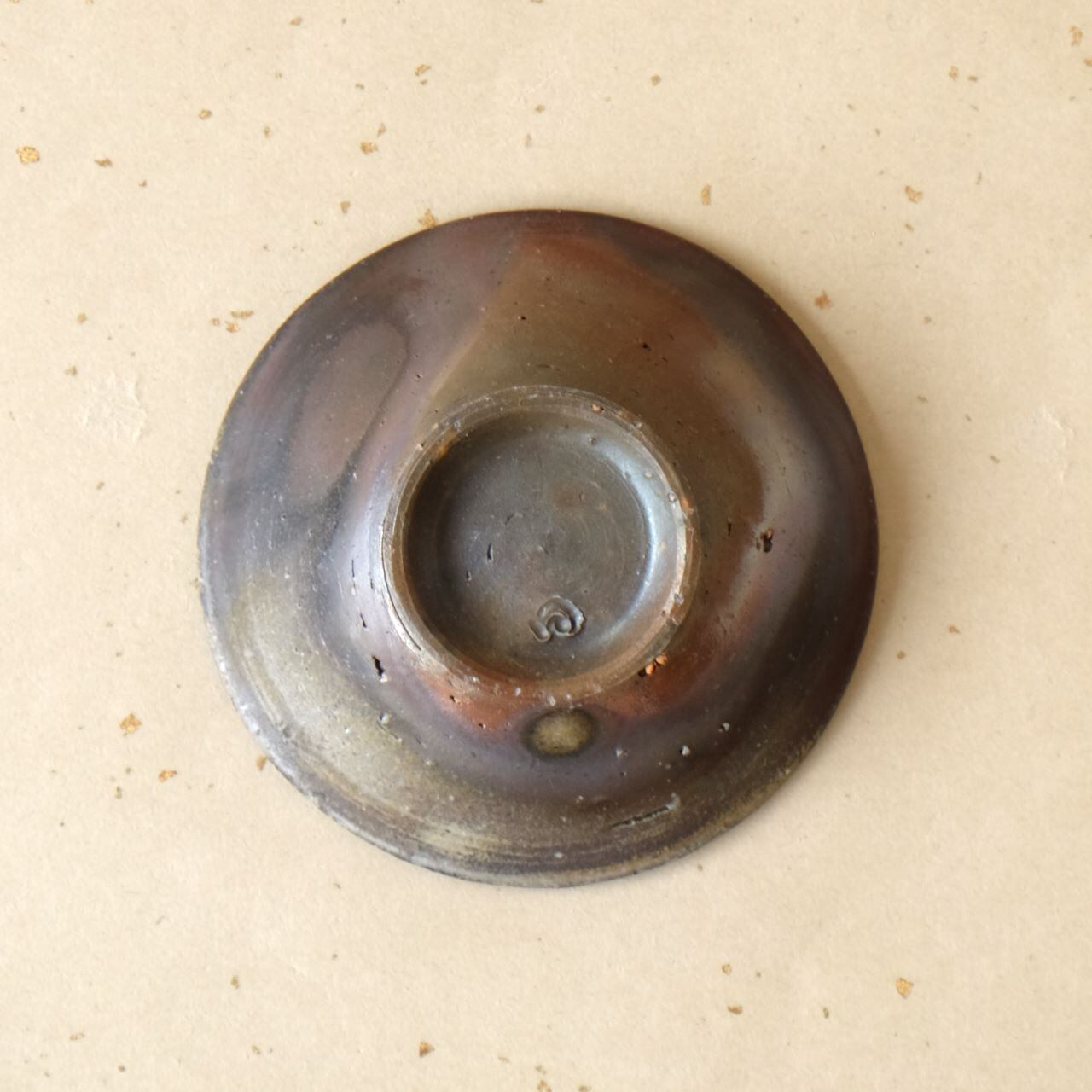 やや深さのあるシンプルなデザインの豆鉢です。木炭のガスの影響を受けて、外側は多彩な変化を見せ、内側は金色がかった珍しい変化を見せています。