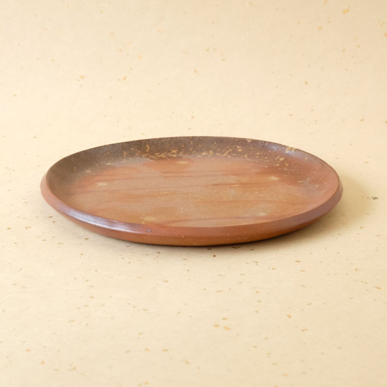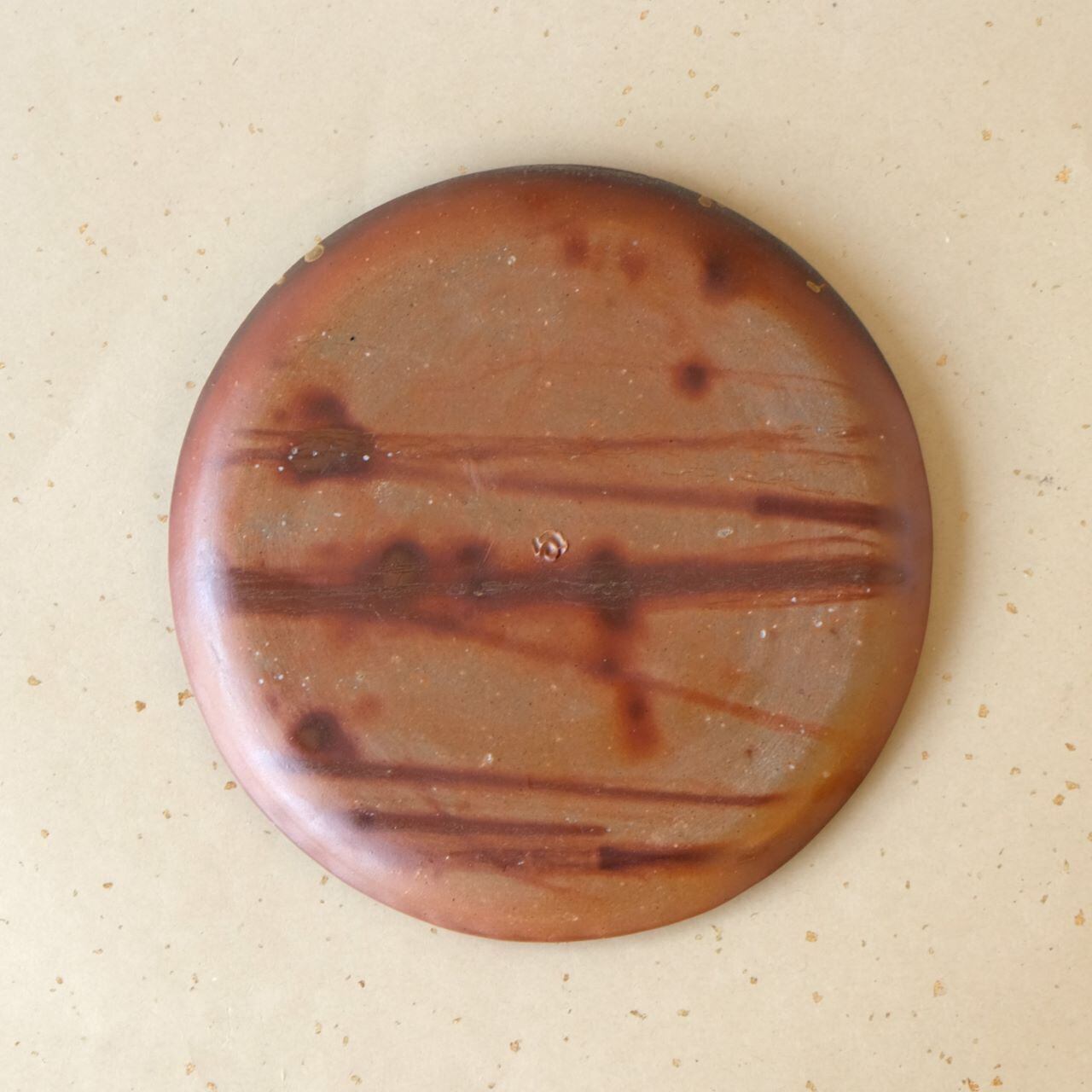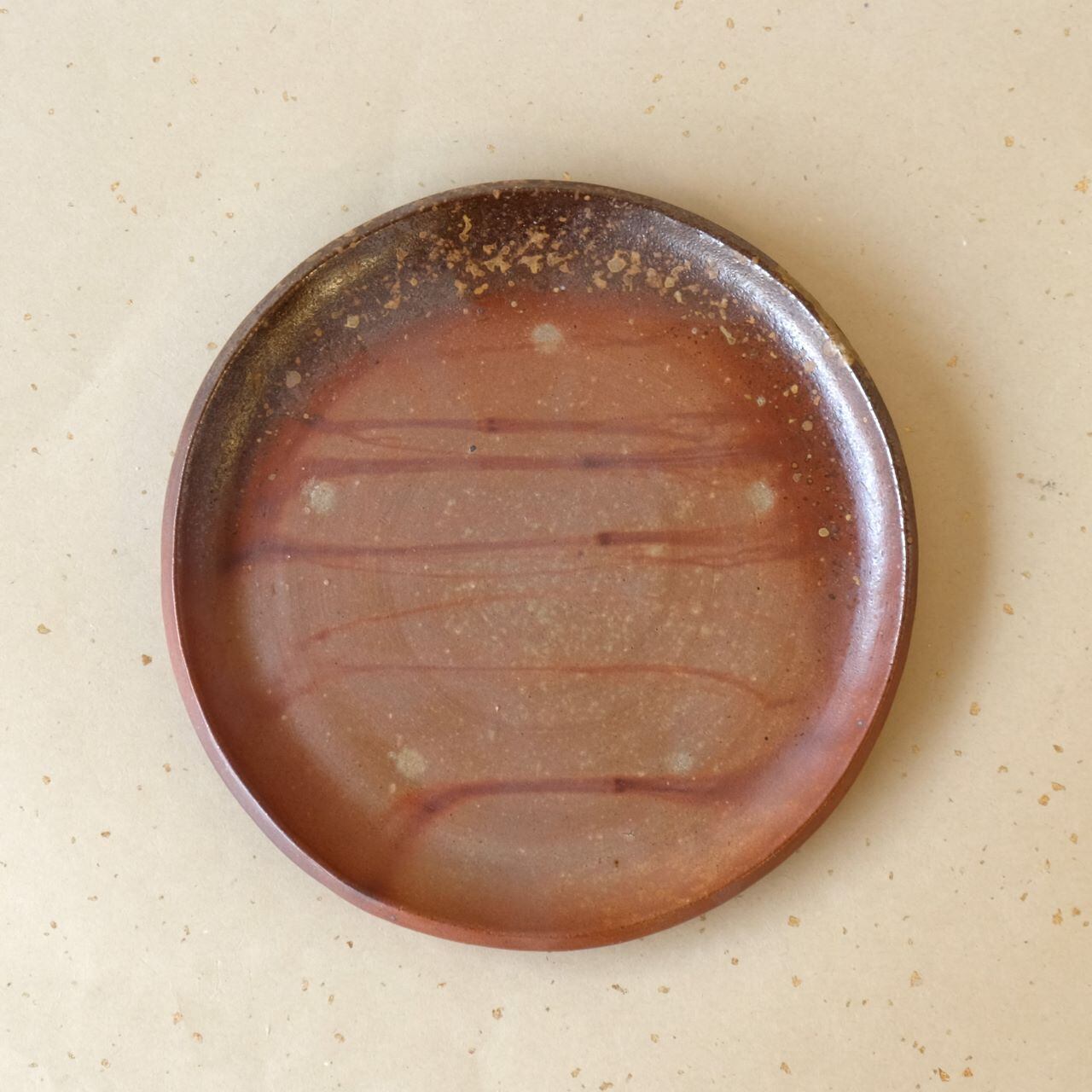 シンプルな丸形のお皿です。縁を軽く曲げているので汁気のあるものでも盛り付けることができます。ワラを載せていた部分が赤く発色し、景色となっています。