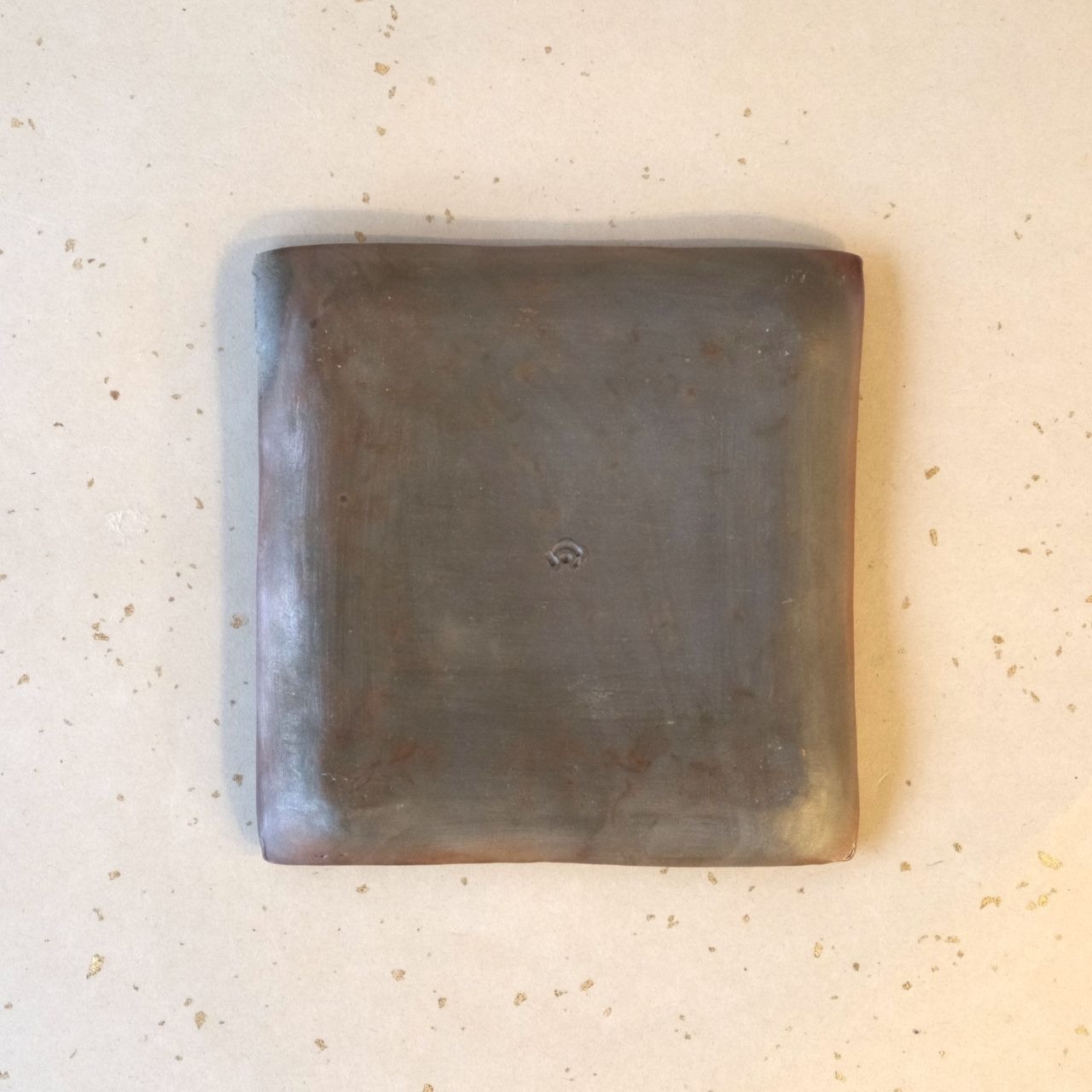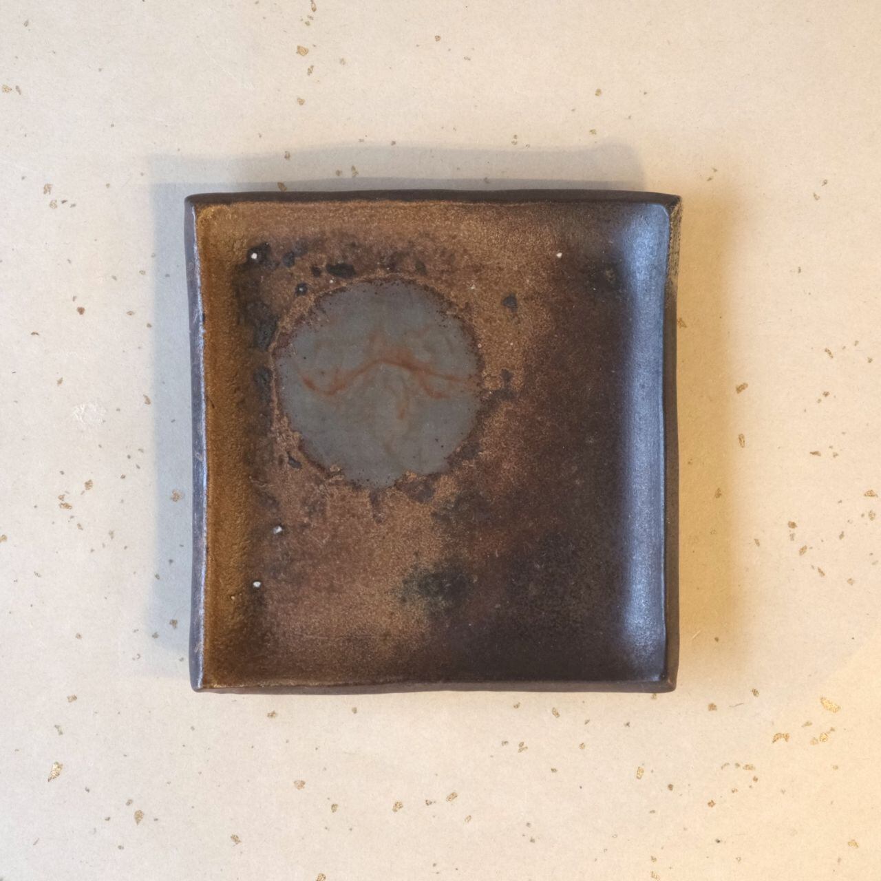シンプルな正方形のお皿です。縁を軽く曲げているので汁気のあるものでも盛り付けることができます。片面には松割木の灰がかかり、丸い抜け模様(牡丹餅)がアクセントになっています。