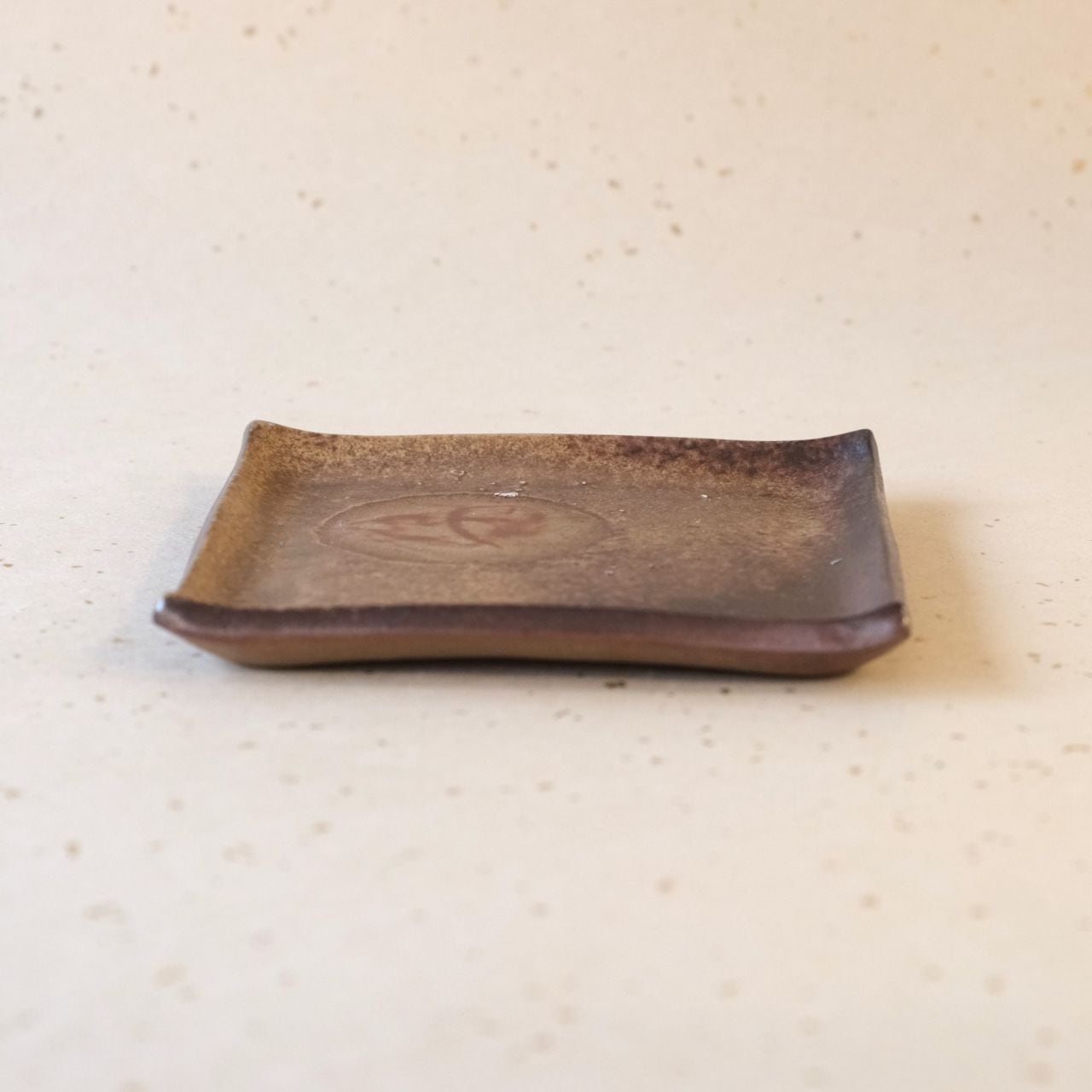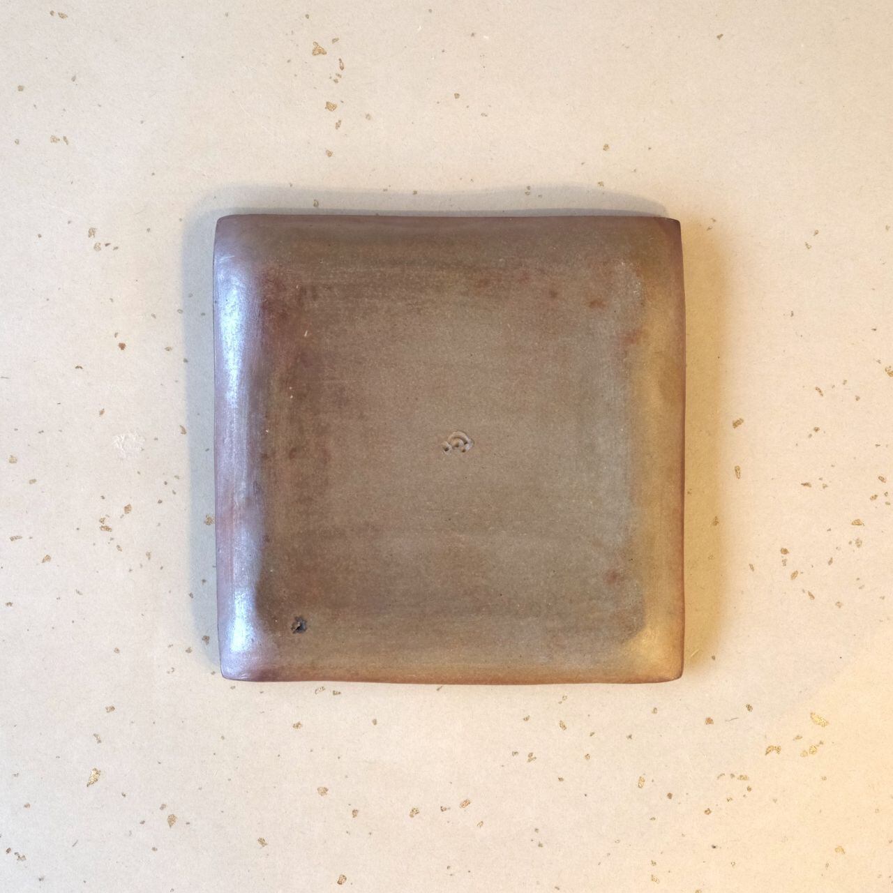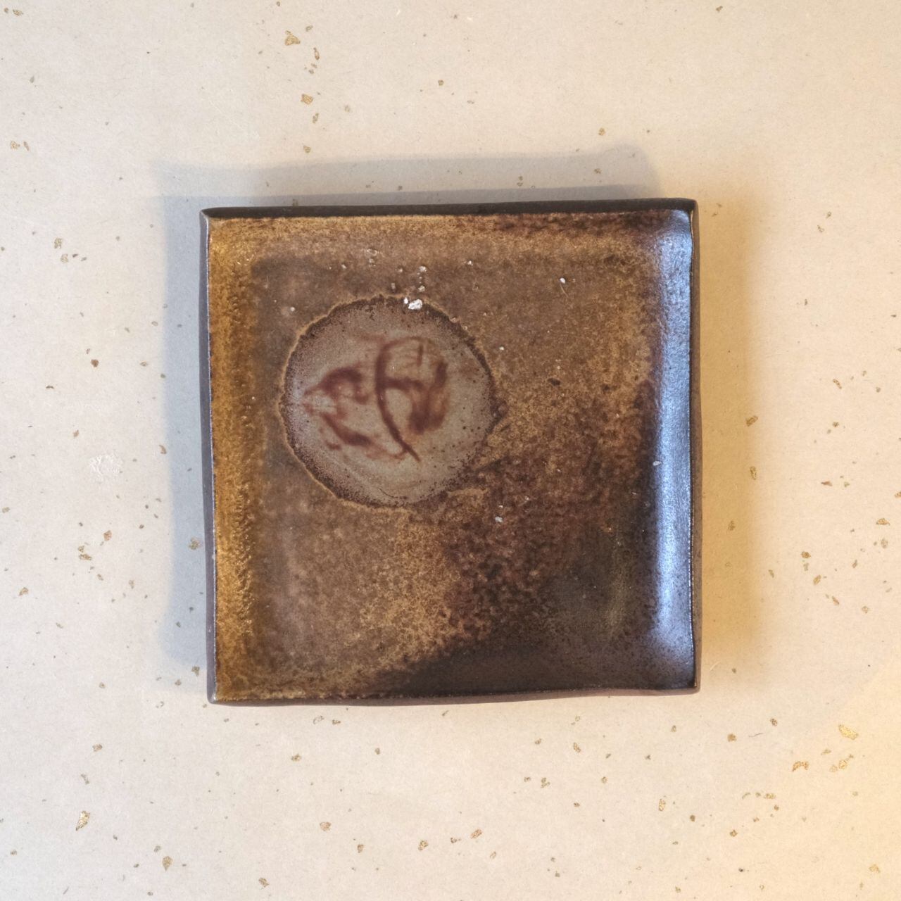 シンプルな正方形のお皿です。縁を軽く曲げているので汁気のあるものでも盛り付けることができます。片面には松割木の灰がかかり、丸い抜け模様(牡丹餅)がアクセントになっています。