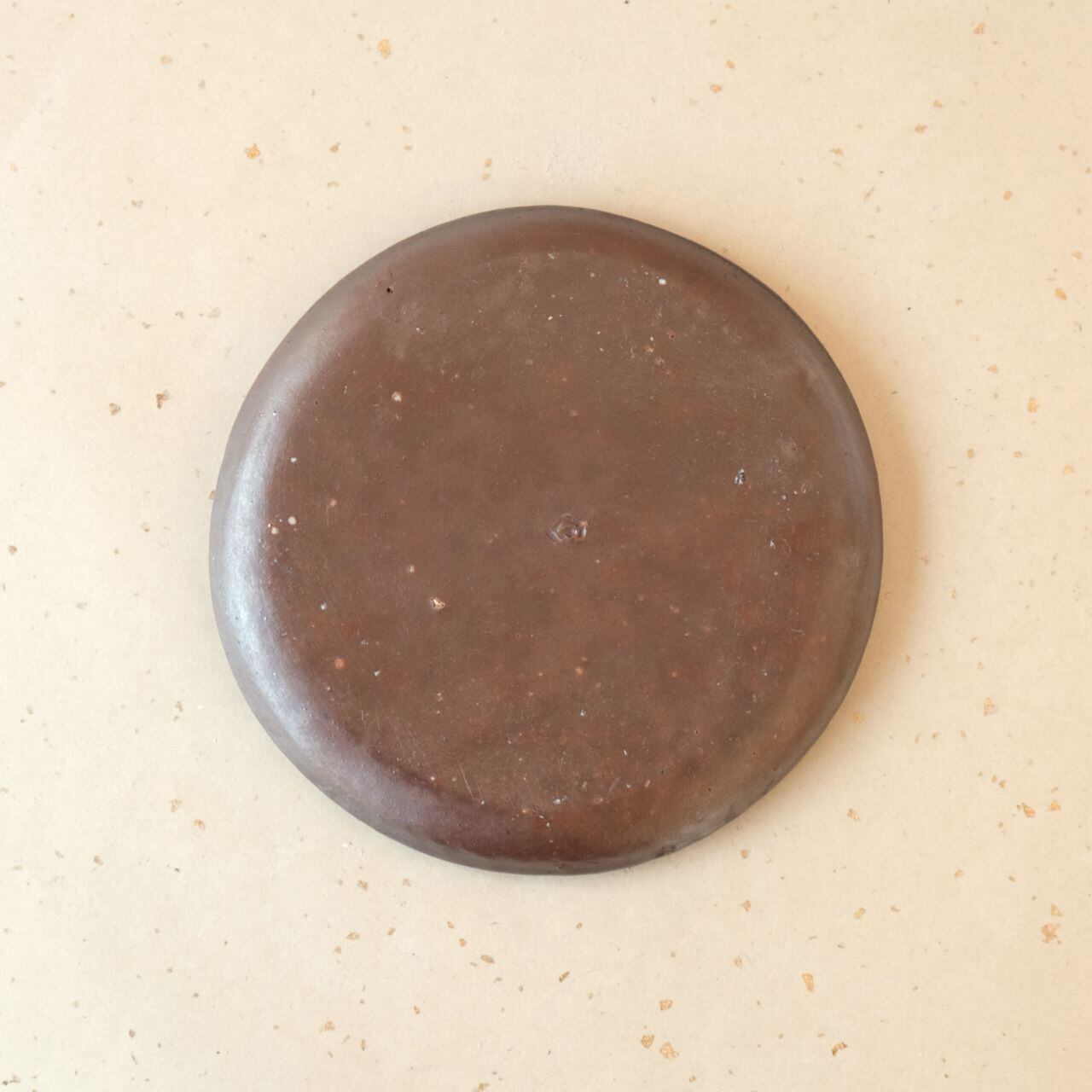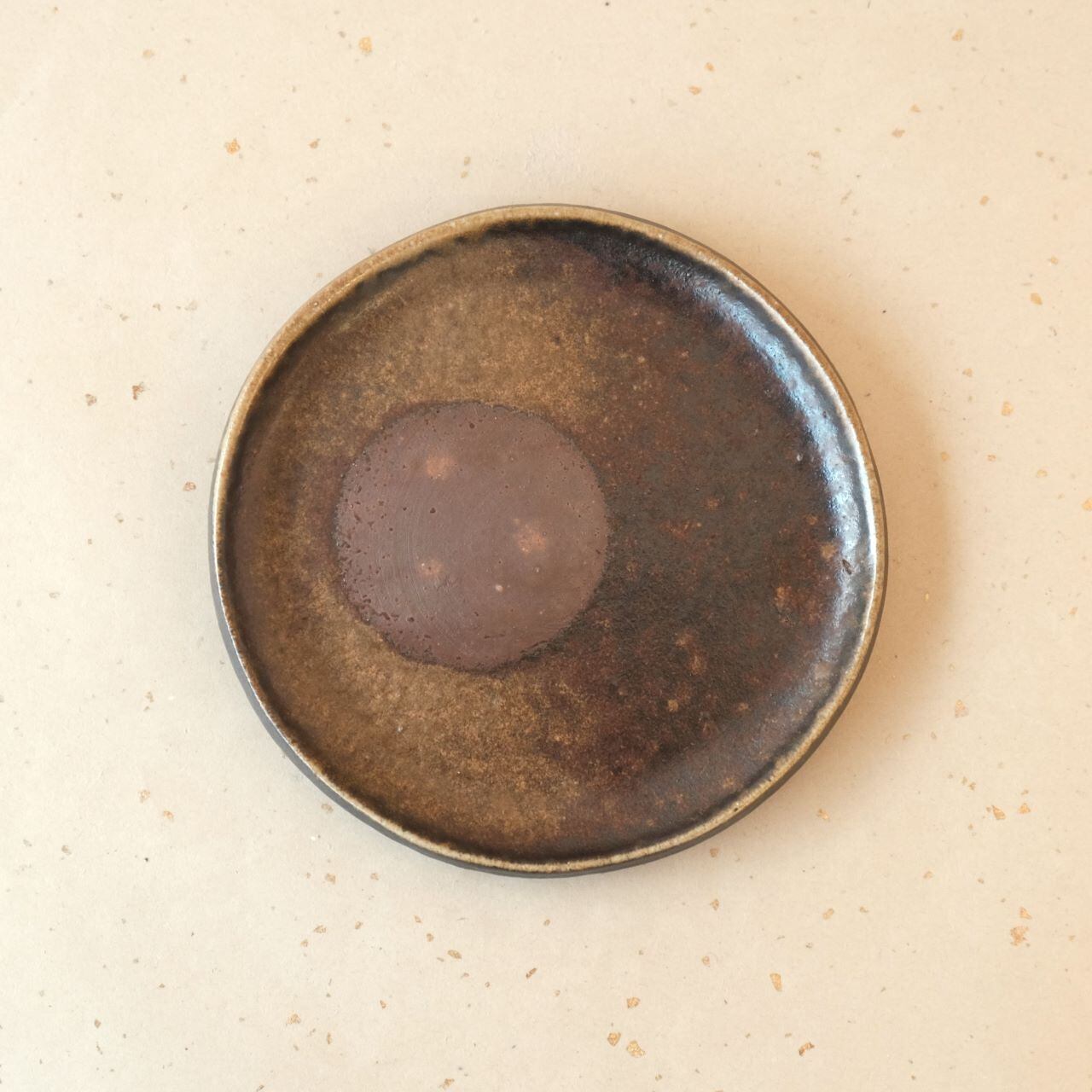 シンプルな丸形のお皿です。縁を軽く曲げているので汁気のあるものでも盛り付けることができます。片面には松割木の灰がかかり、丸い抜け模様(牡丹餅)がアクセントになっています。