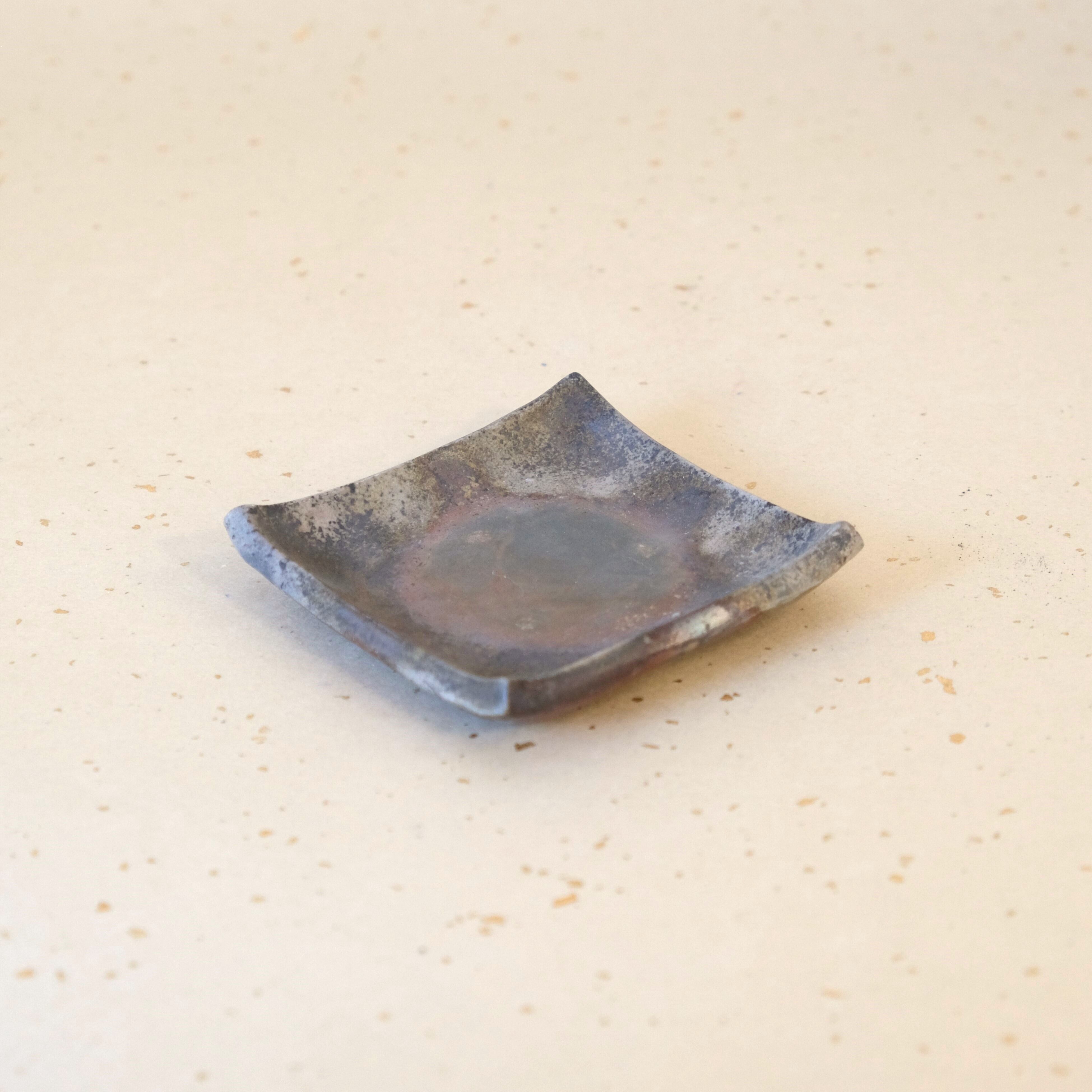 シンプルな正方形の豆皿です。縁を軽く曲げているので汁気のあるものでも盛り付けることができます。木炭とワラの影響を受け、全体的に落ち着いた雰囲気に仕上がっています。