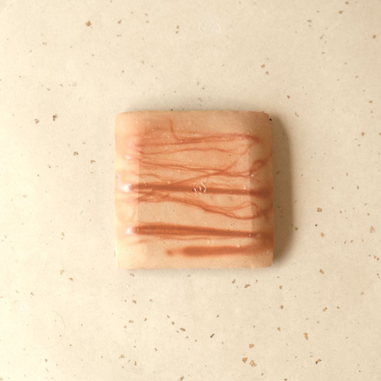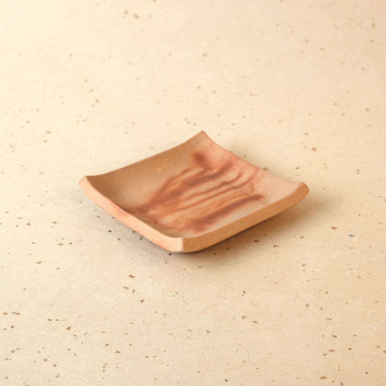シンプルな正方形の豆皿です。縁を軽く曲げているので汁気のあるものでも盛り付けることができます。ワラの接した部分が赤く発色し、明るい雰囲気に仕上がっています。
