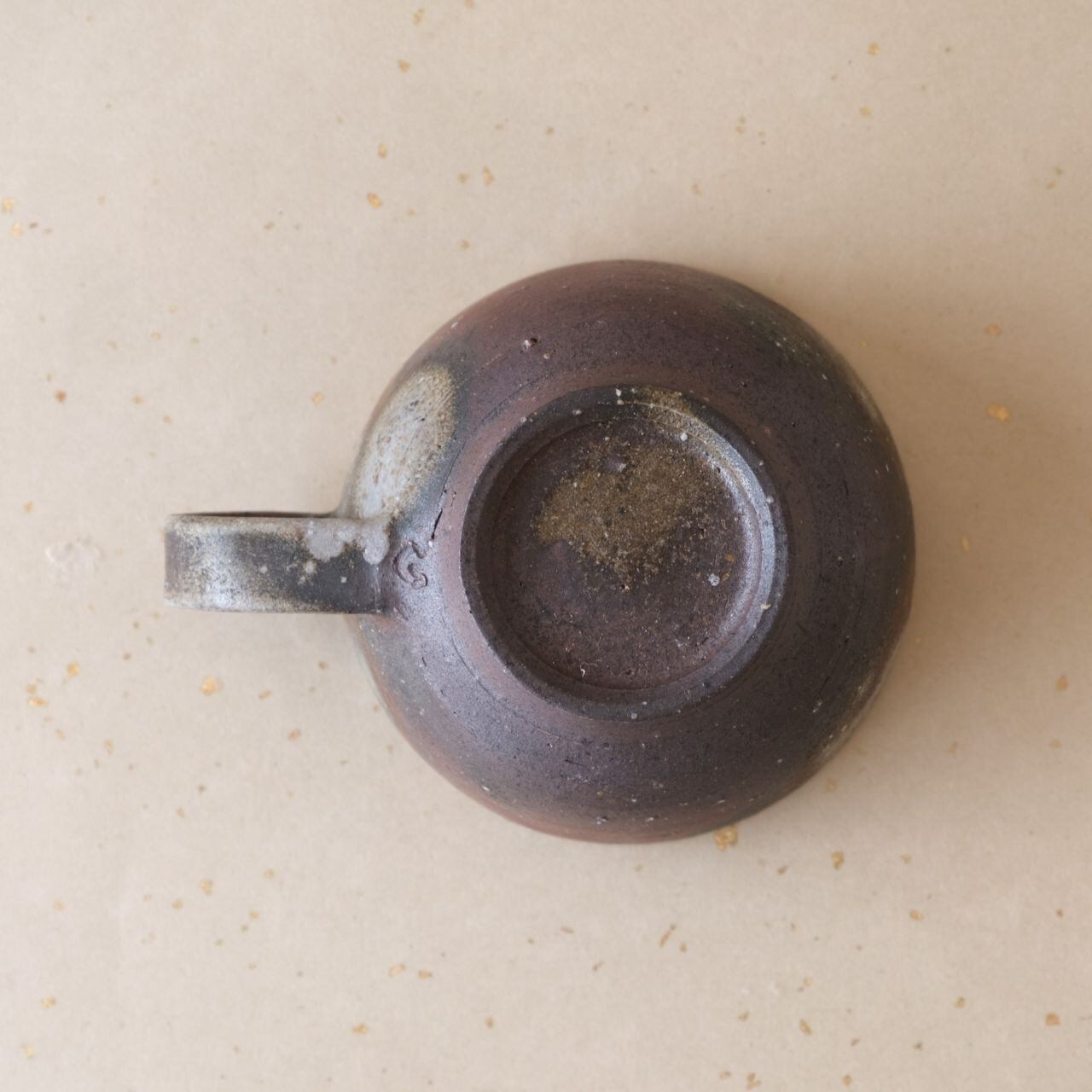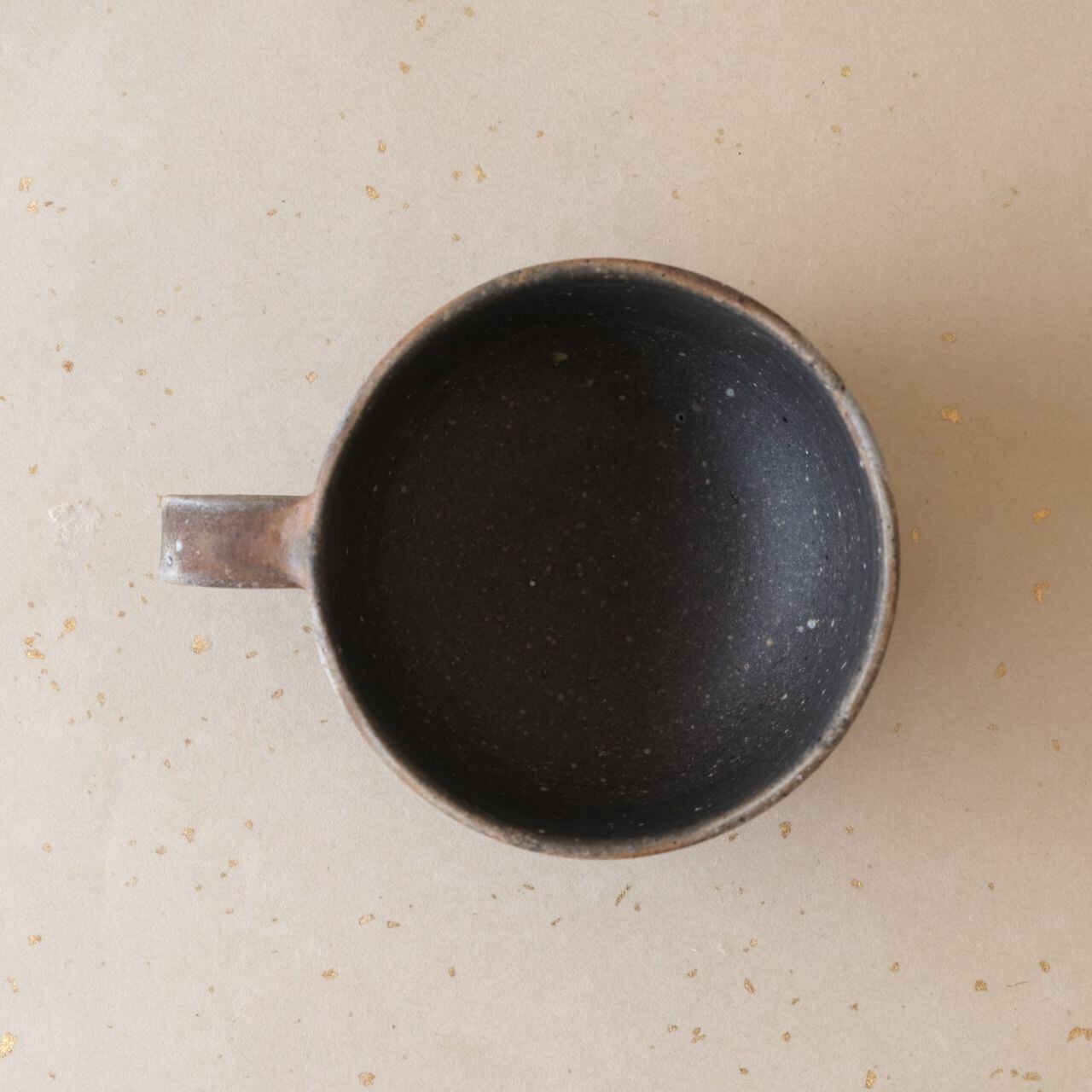 丸形のコーヒーカップです。コーヒーの苦味を和らげてくれると言われています。うつわの側面には、木炭のガスの作用により、さまざまな景色が現れています。