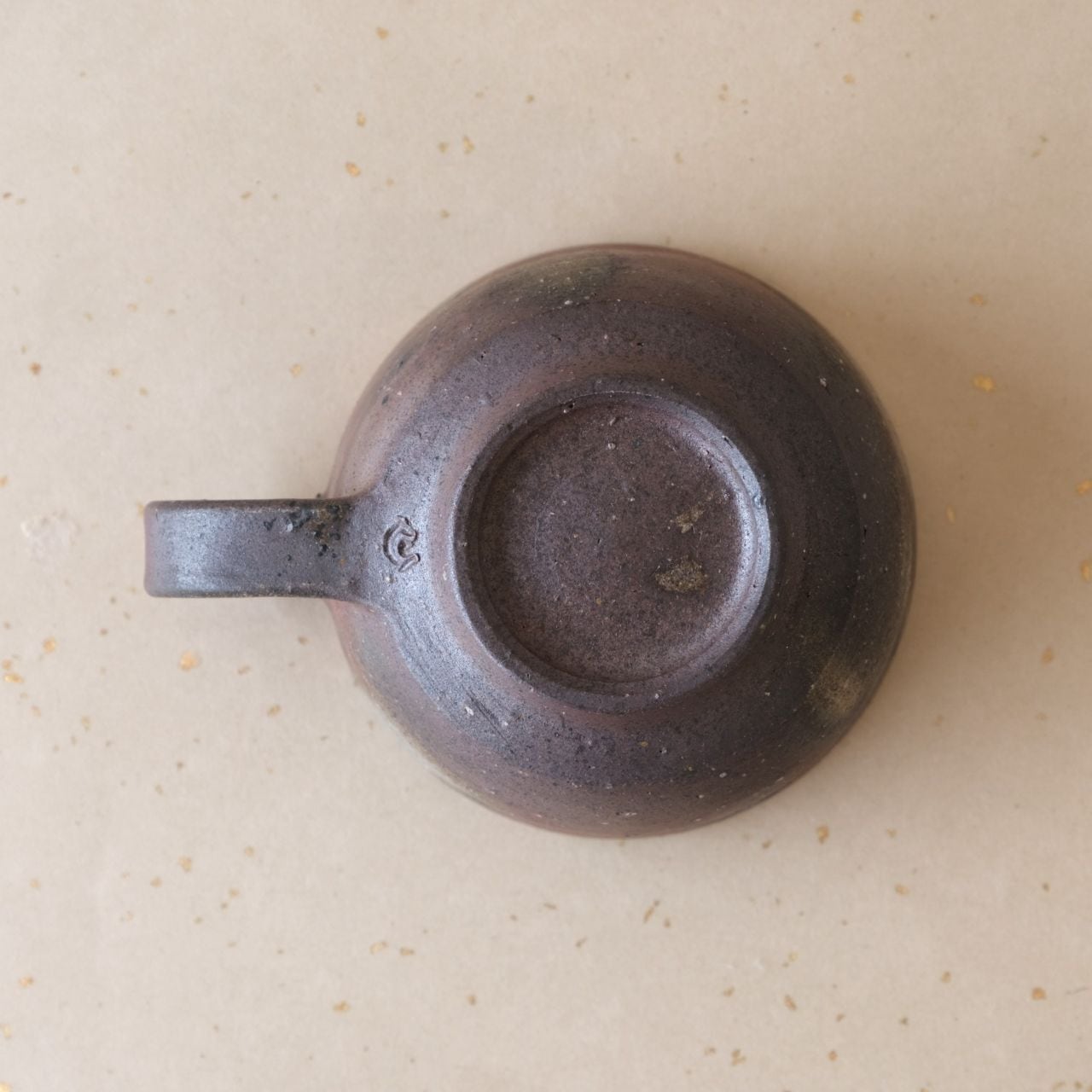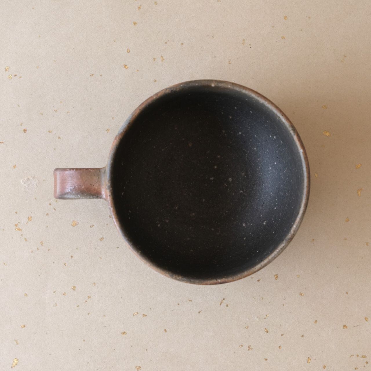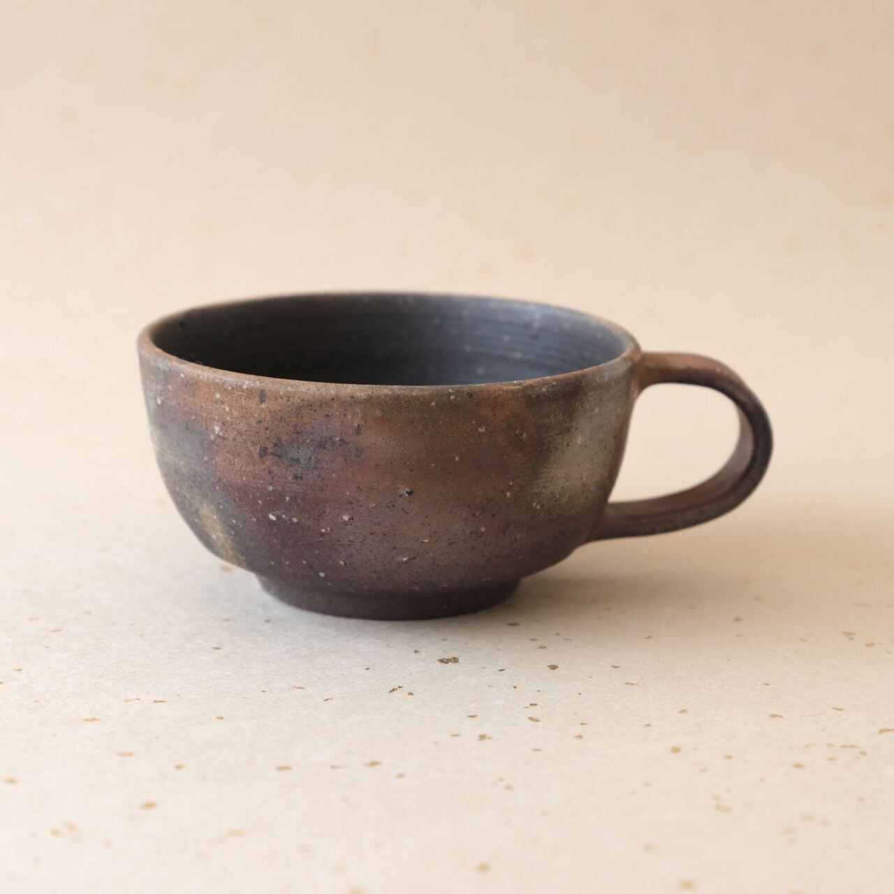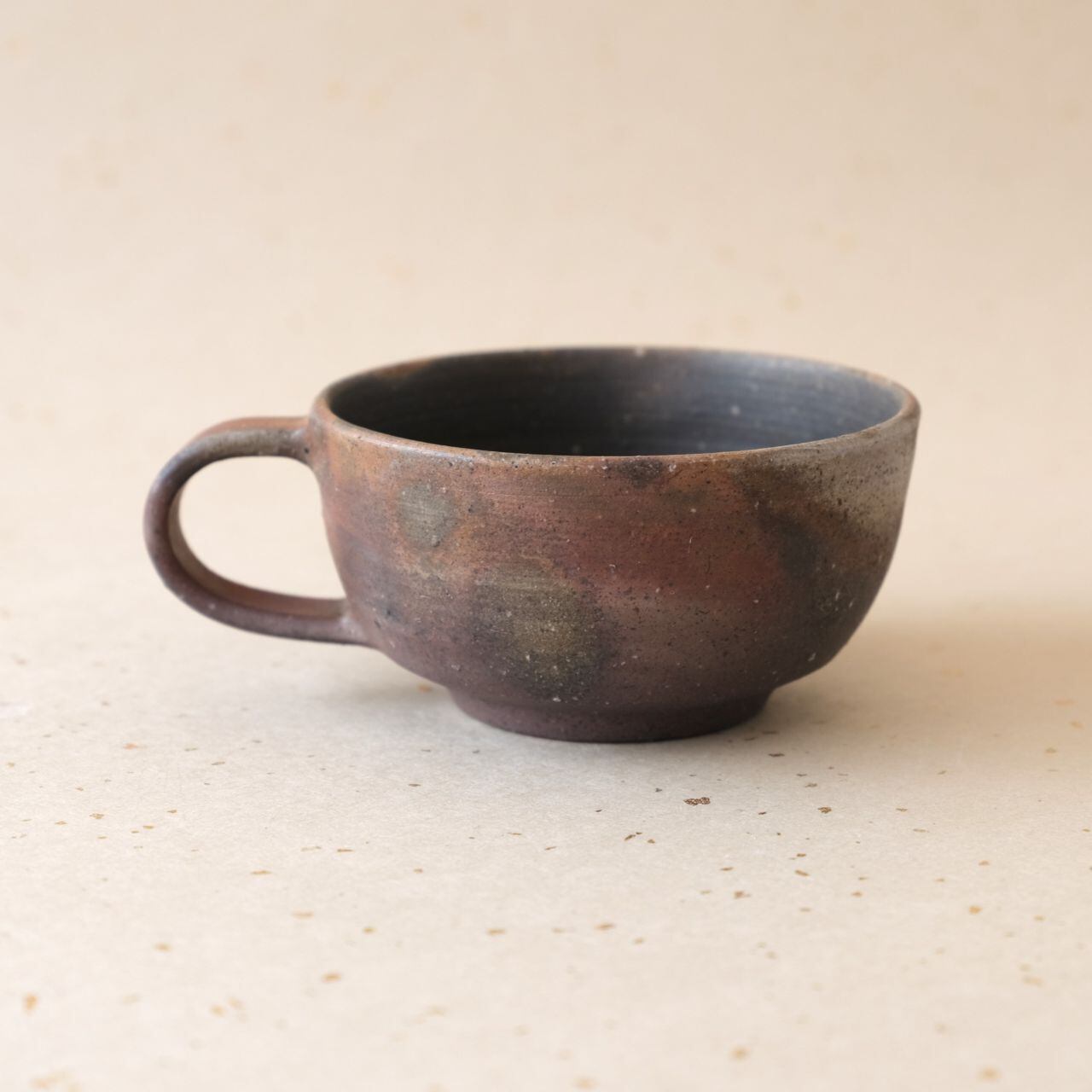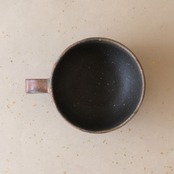丸形のコーヒーカップです。コーヒーの苦味を和らげてくれると言われています。うつわの側面には、木炭のガスの作用により、さまざまな景色が現れています。