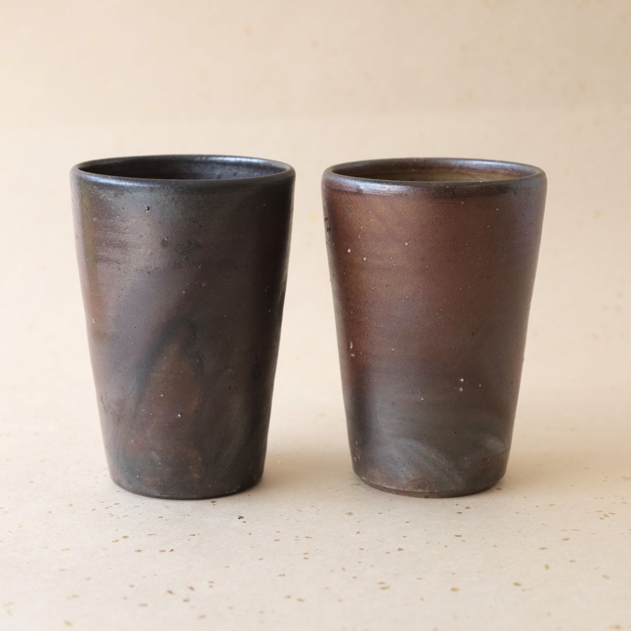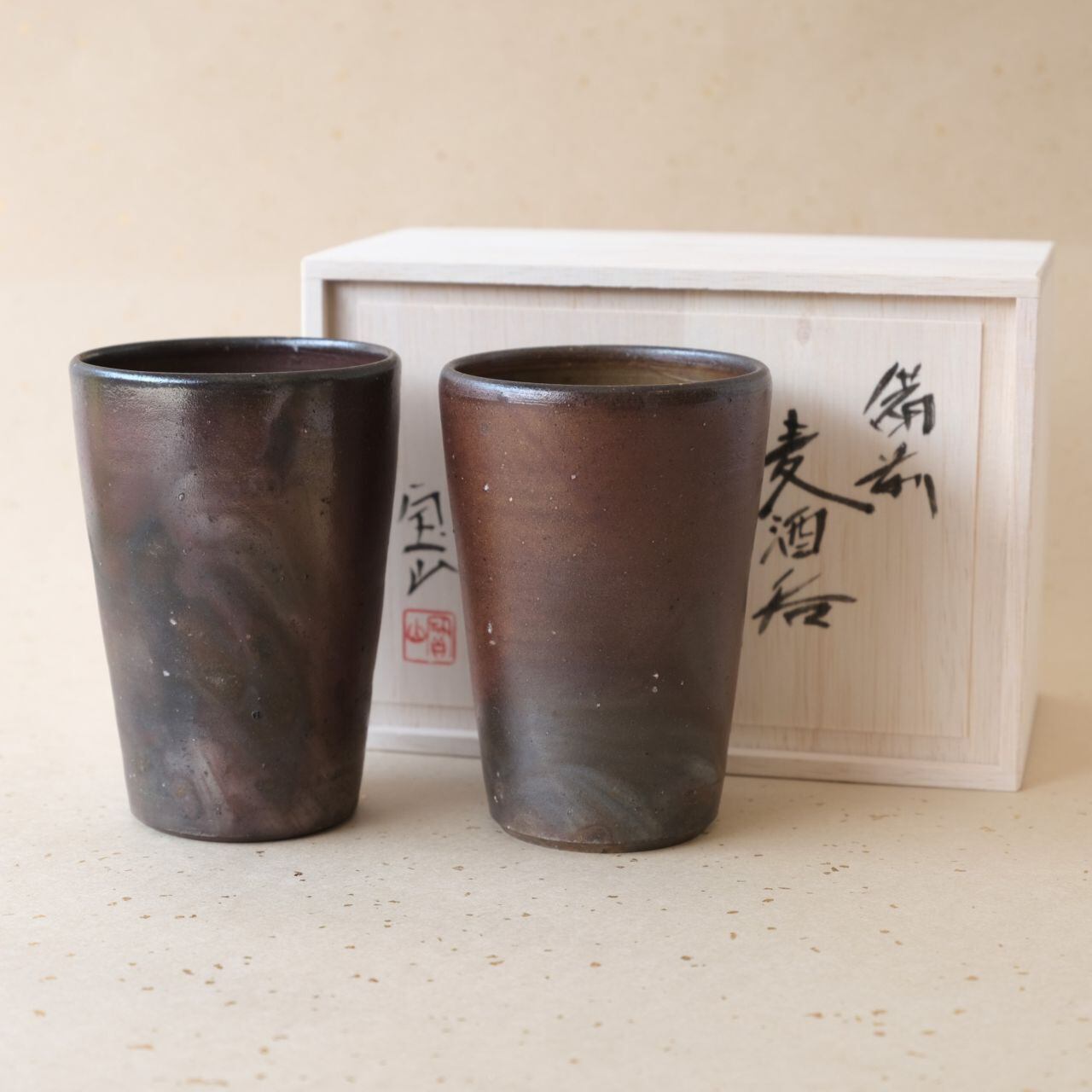 シンプルなデザインのビアマグセットです。ビールが美味しくいただけると言われています。木炭のガスの作用により変化が生まれ、独特のグラデーションとなっています。