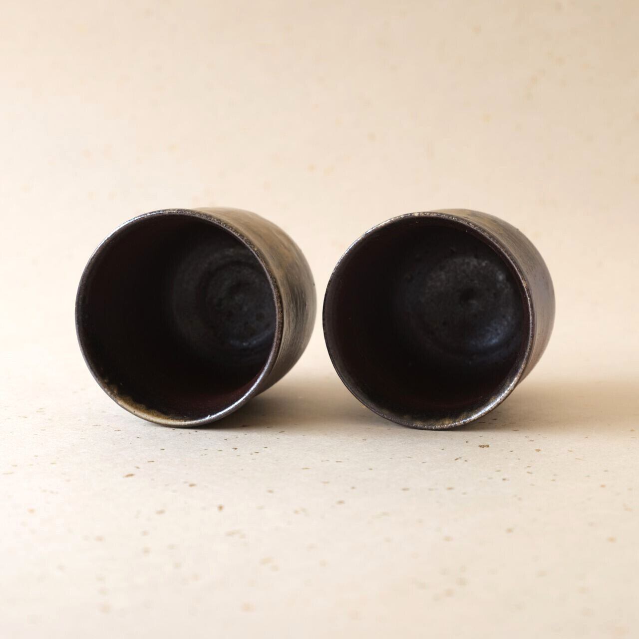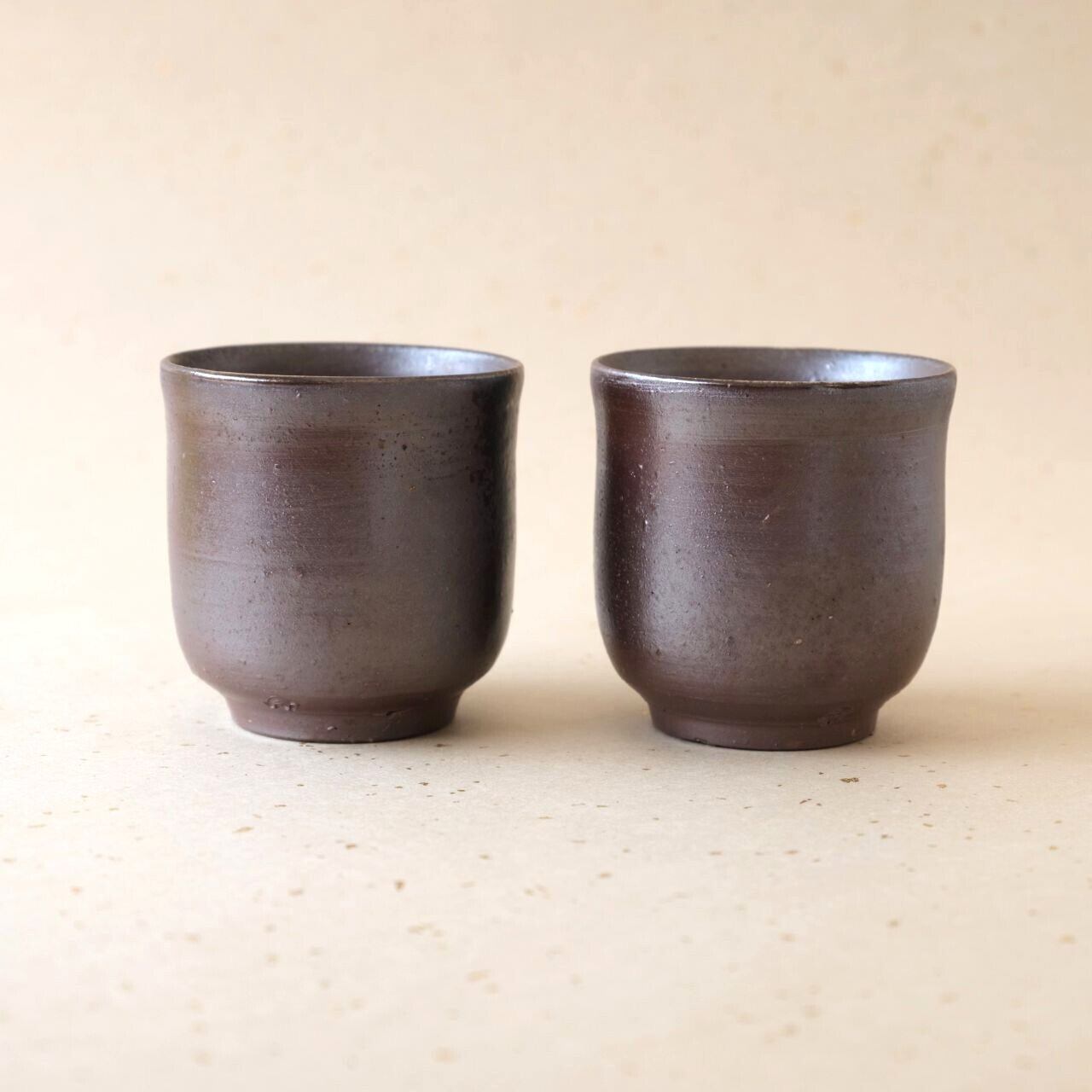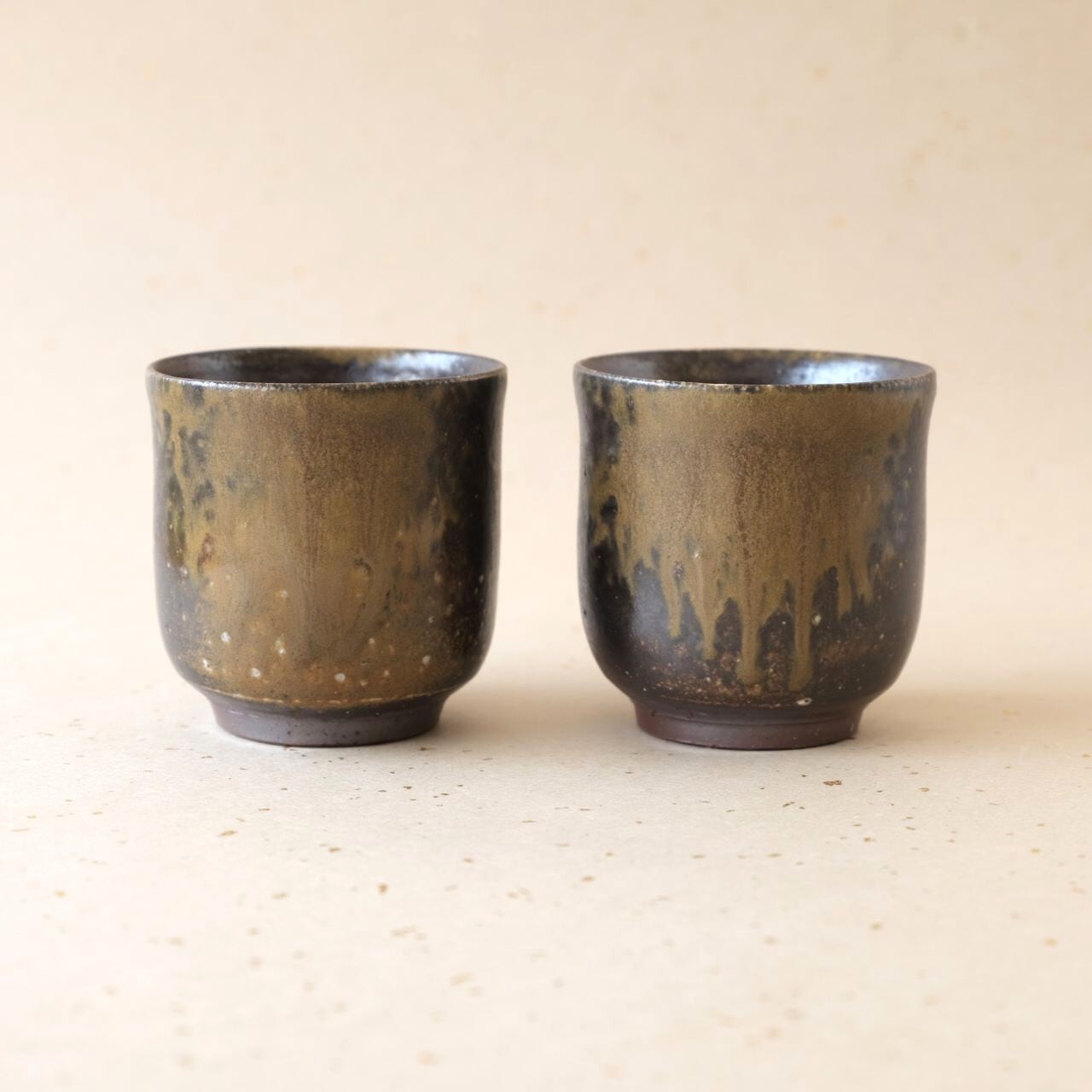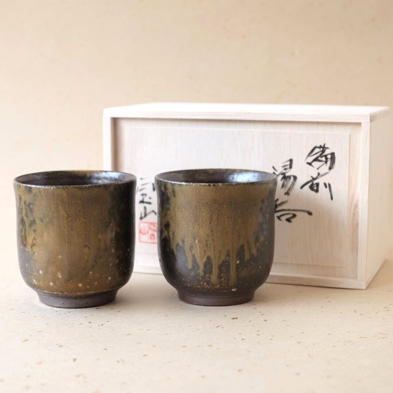 標準サイズの湯呑セットです。お茶だけでなく、さまざまな飲み物のうつわとしても使っていただけます。燃料の松割木の灰が付着した部分が黄土色に変化し、景色となっています。