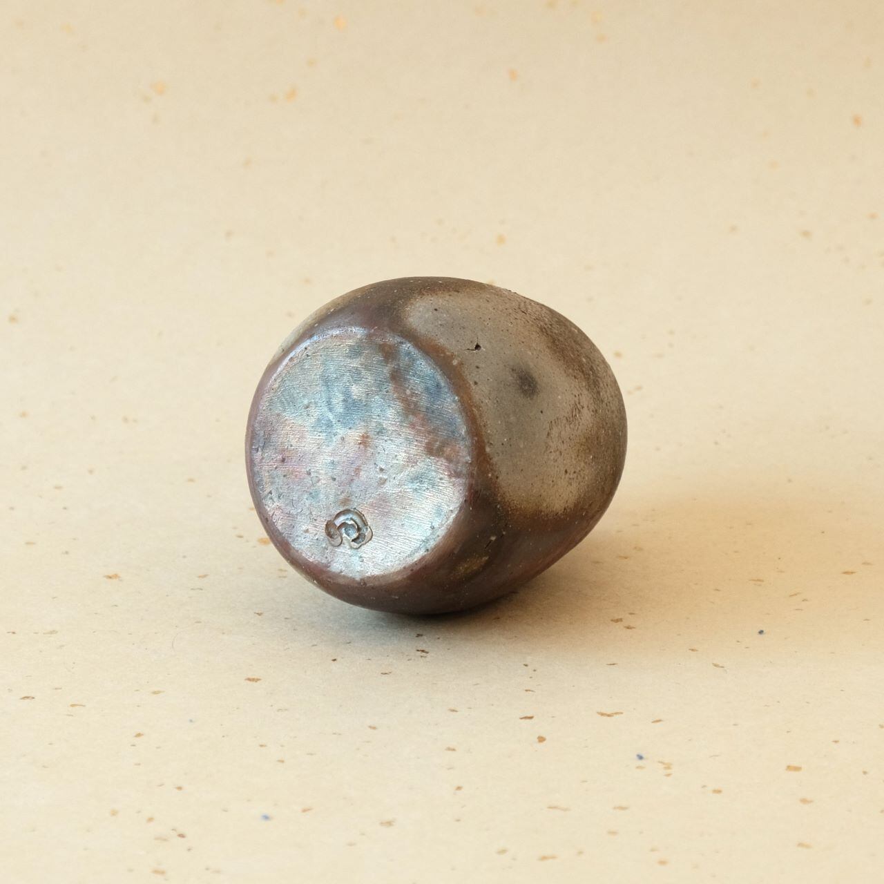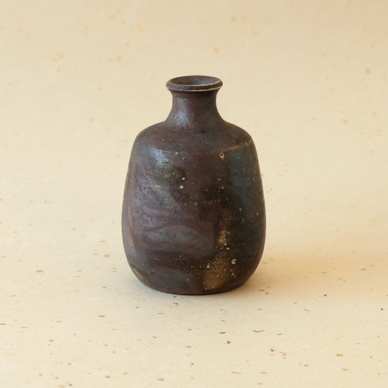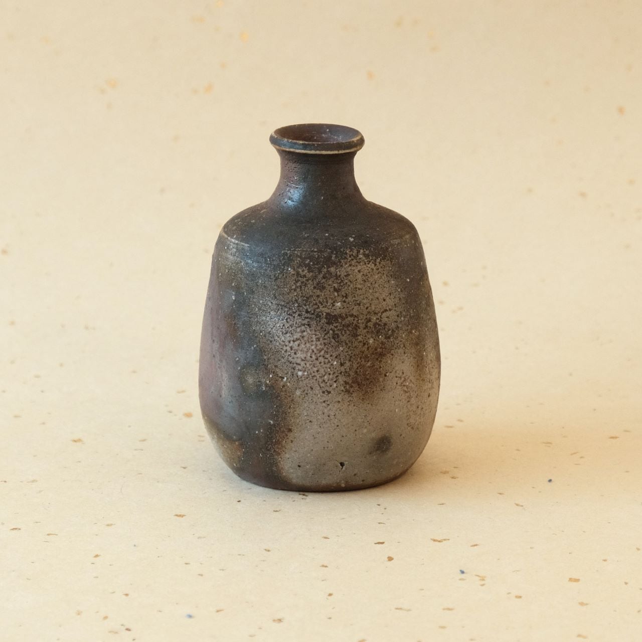 一輪花入などに使っていただける小さな徳利です。窯の火を止める直前に、作品の周りへ木炭を振りかけることにより、ガスの作用を受け、青みがかった表情が生まれています。