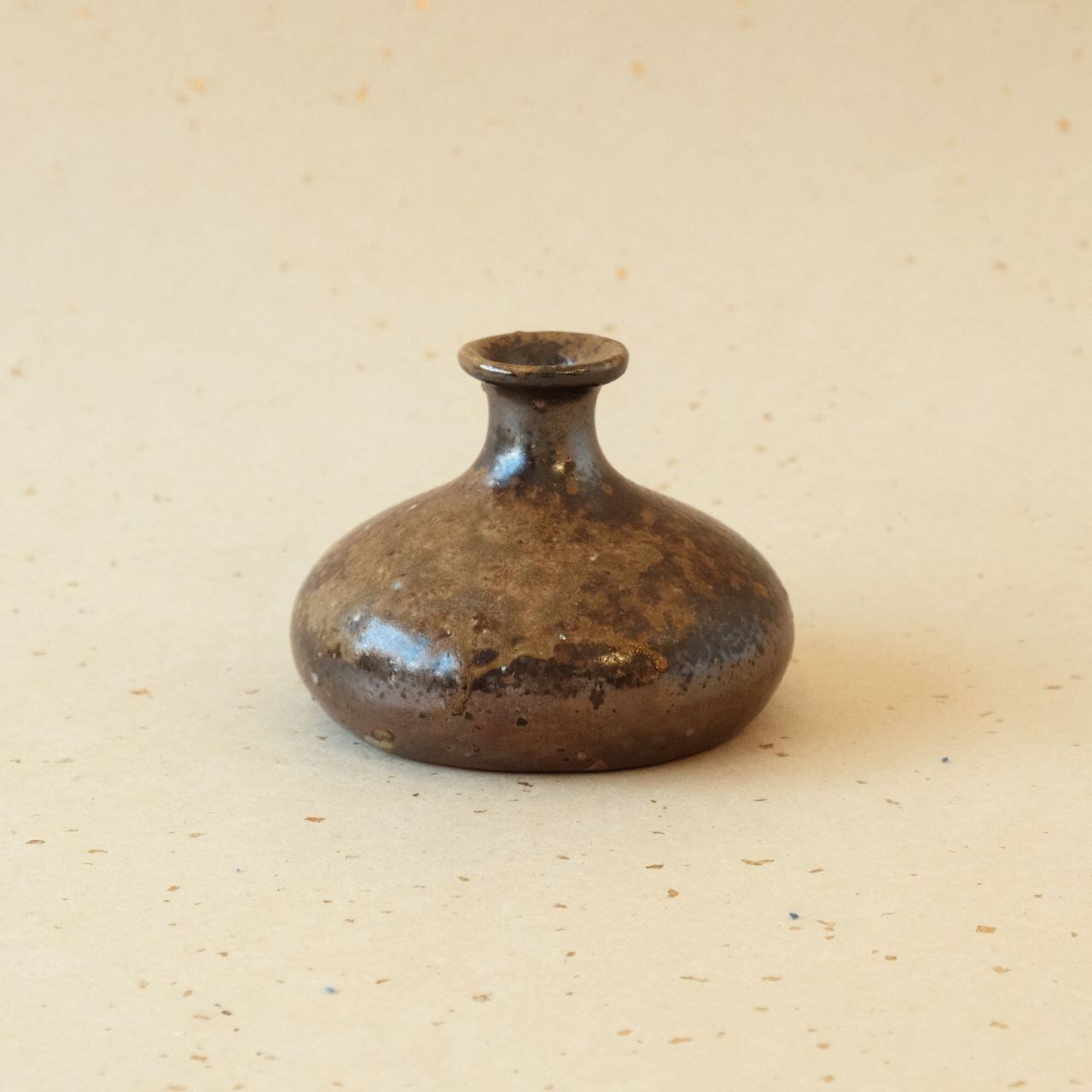 一輪花入などに使っていただける小さな徳利です。肩部には燃料である松割木の灰が降りかかり、黄みがかった色合いとなっています。