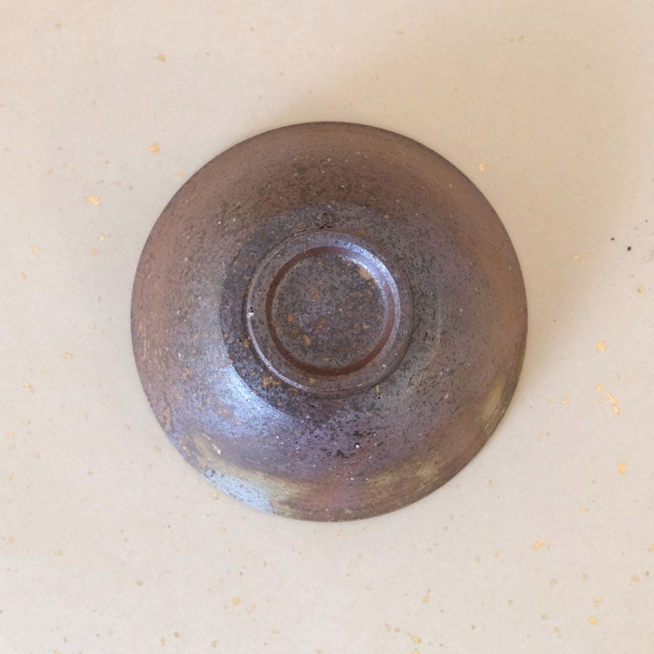 シンプルなデザインでやや小ぶりな飯茶碗です。木炭のガスの影響を受けて、外側は多彩な変化を見せ、内側は青味がかかった色合いになっています。