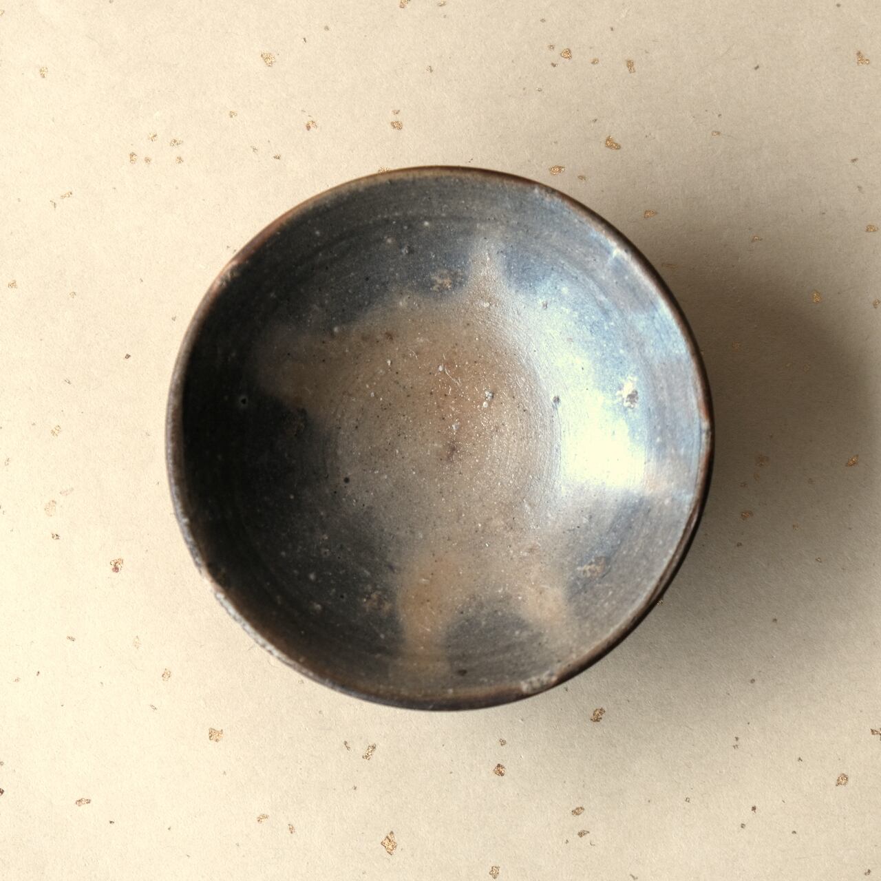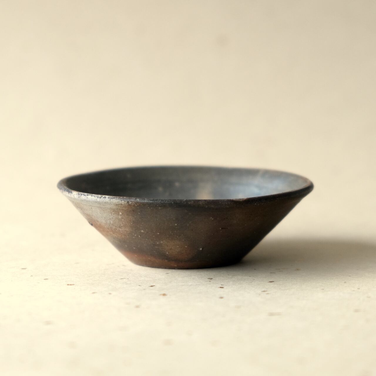 やや深さのあるシンプルなデザインの豆鉢です。木炭のガスの影響を受けて、外側は多彩な変化を見せ、内側は金色がかった珍しい変化を見せています。