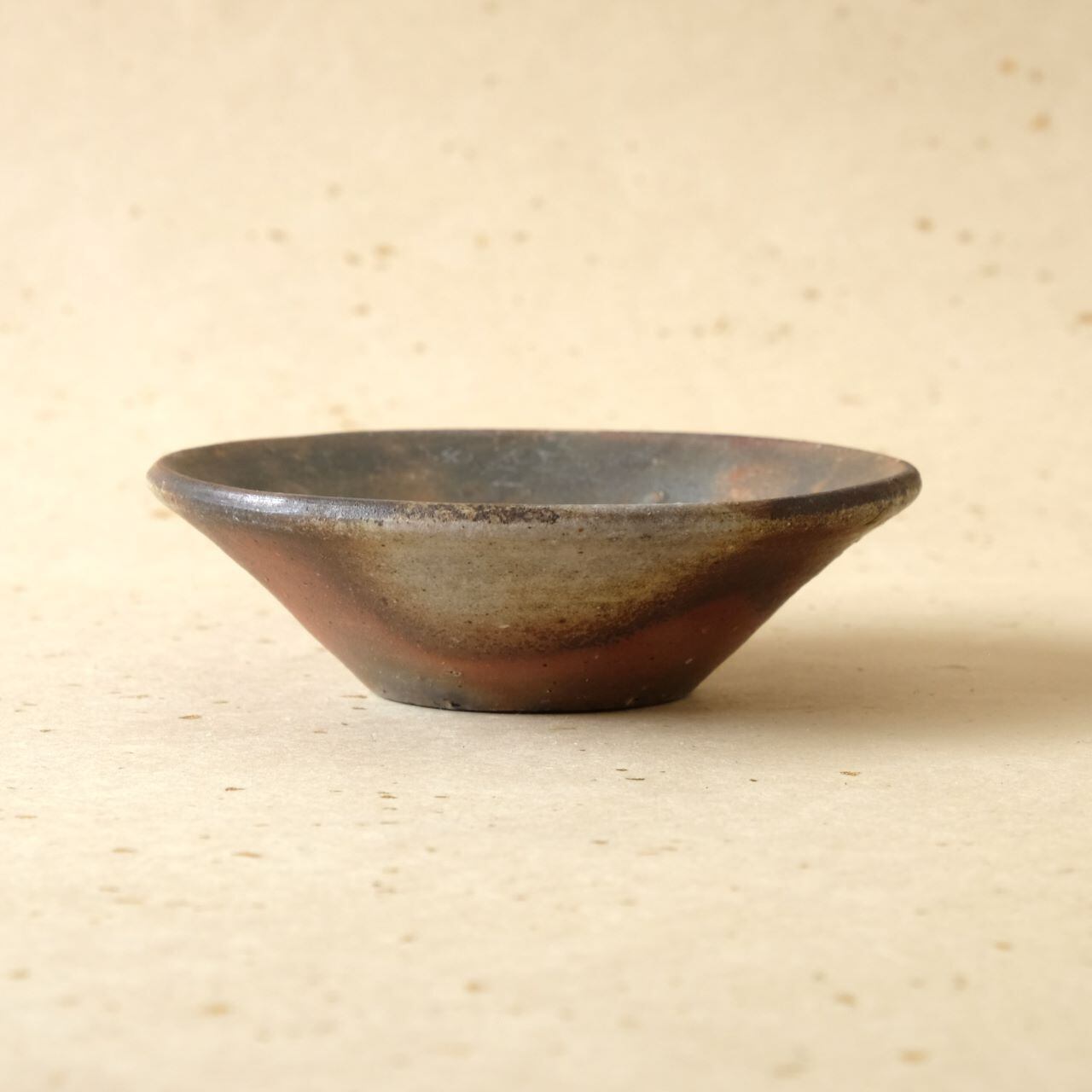 やや深さのあるシンプルなデザインの豆鉢です。木炭のガスの影響を受けて、外側は多彩な変化を見せ、内側は金色がかった珍しい変化を見せています。