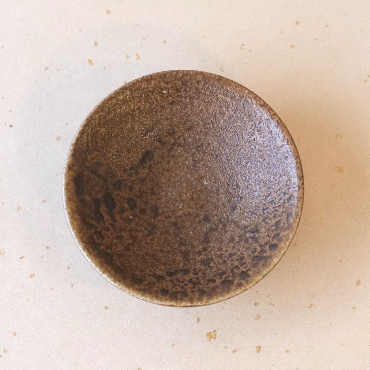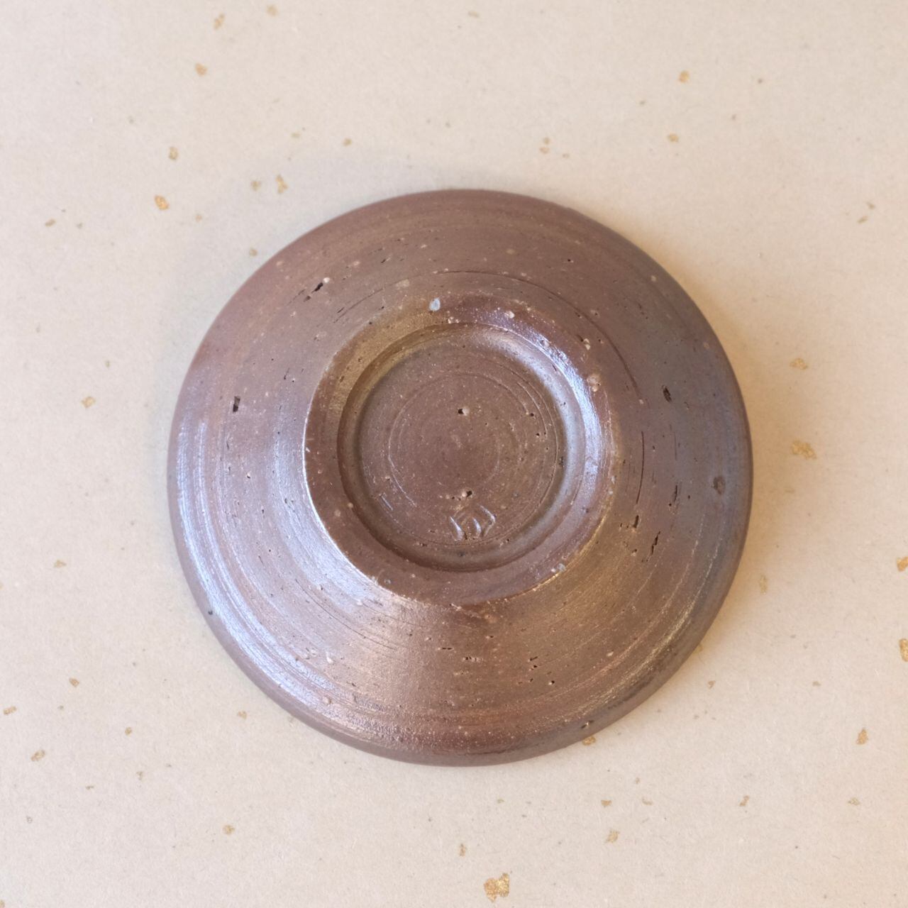 やや深さのあるシンプルなデザインの豆鉢です。燃料の松割木の灰がかかった部分は、黄色味がかった色合いになっています。