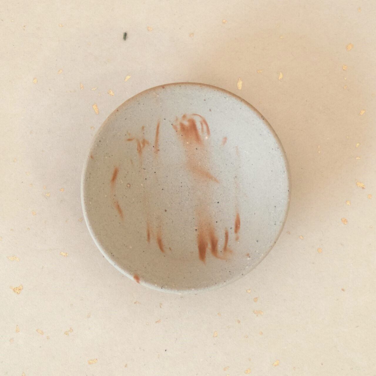 やや高めの高台を削り出した台付きの豆鉢です。ワラの触れた部分が赤く発色し、地色とのコントラストを生み出しています。