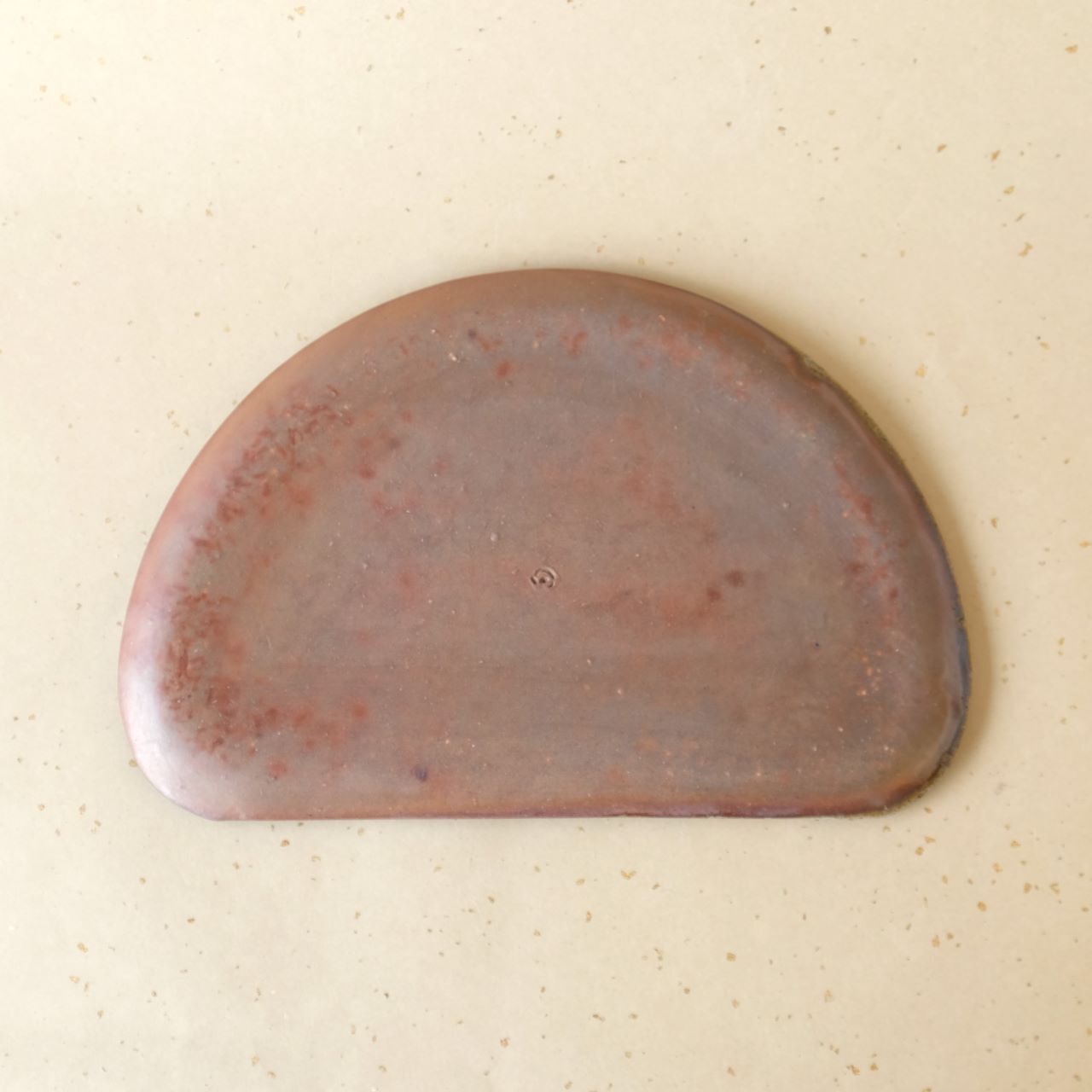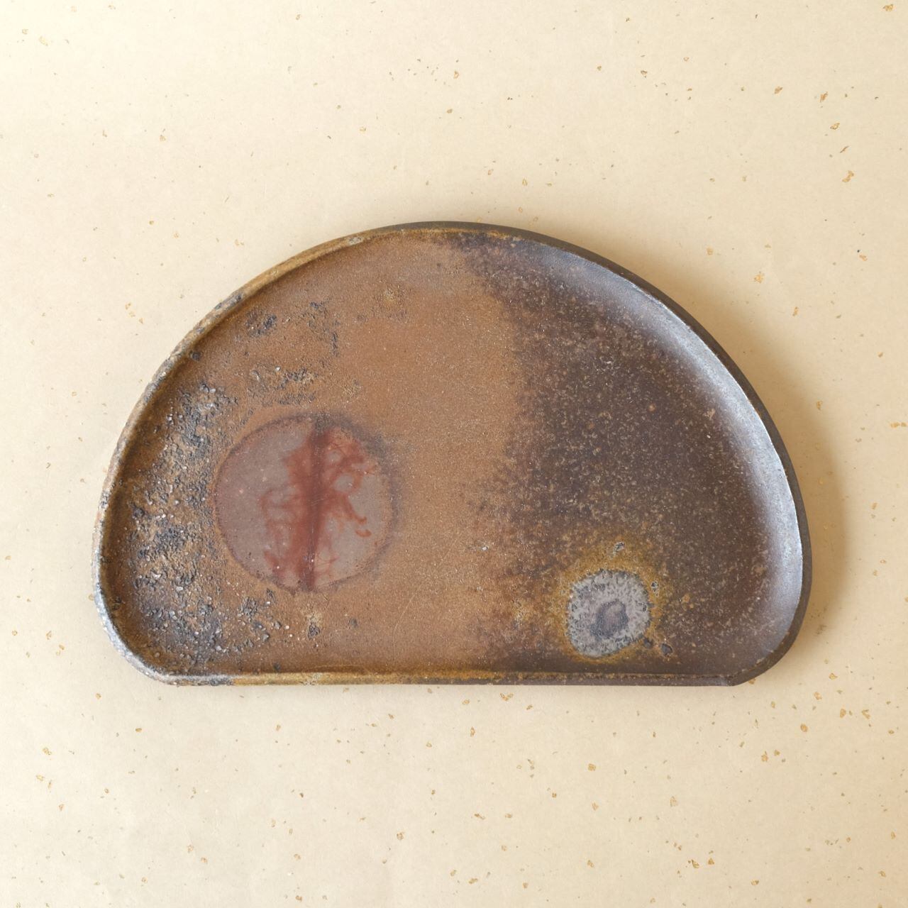 シンプルな半円形のお皿です。縁を軽く曲げているので汁気のあるものでも盛り付けることができます。片面には松割木の灰がかかり、丸い抜け模様(牡丹餅)がアクセントになっています。